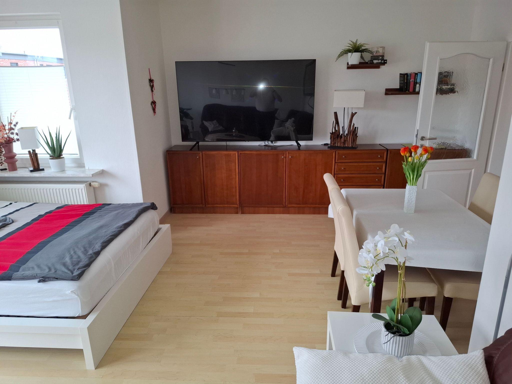 Ich lege großen Wert auf Sauberkeit und auf die Qualität der Betten, in denen Sie sicherlich gut schlafen werden. Was passt sich schon besser an und entspannt mehr als wärmendes Wasser! So steht auch für das Sofa mit Bettfunktion ein weicher Matratzentopper mit Memoryfunktion im Zimmer bereit. Für kalte Abende, an denen man die Terrasse vielleicht weniger nutzt, habe ich mir Gedanken für ein entspanntes kinoähnliches Sehen des Fernsehprogrammes mit modernem Gerät, Internet sowie WLAN gedacht.