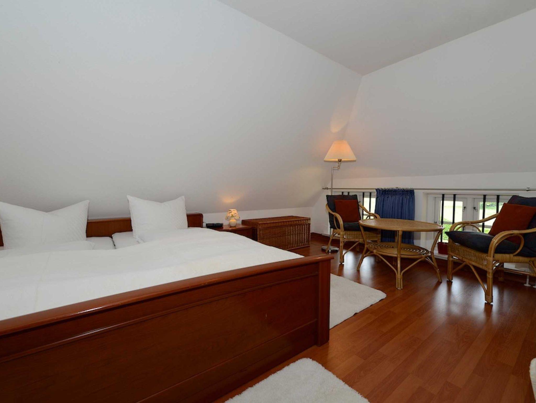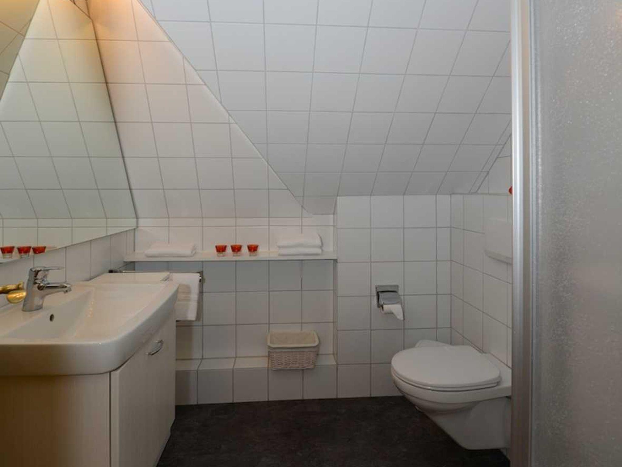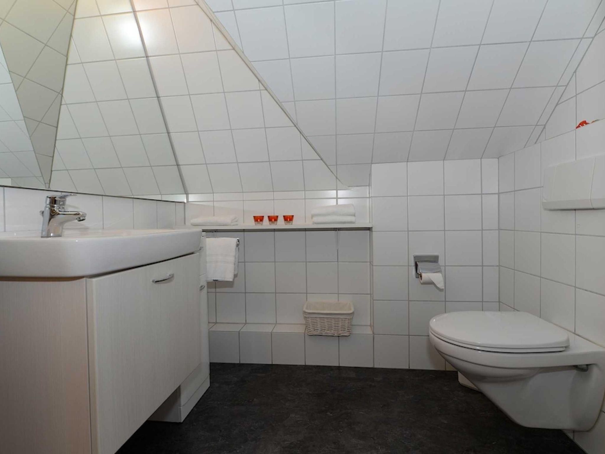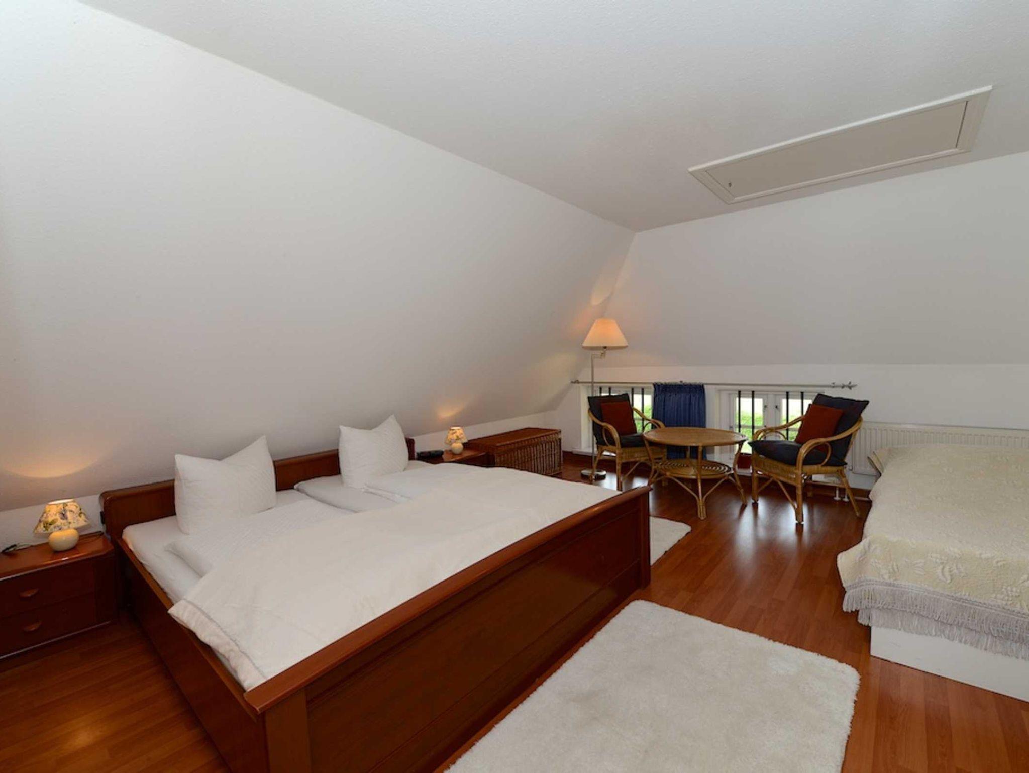 Im Obergeschoss befindet sich das Duschbad und das Schlafzimmer mit Doppelbett (Boxspring) und einem Einzelbett.