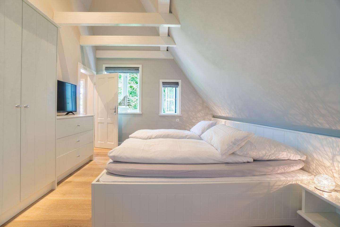 Im Obergeschoss sind ein weiteres Schlafzimmer, ein zweites Wohnzimmer mit einer Schlafmöglichkeit für eine Person und die zwei weiteren Bäder gelegen. Das Schlafzimmer ist mit einem Doppelbett ausgestattet und verfügt ebenfalls über ein Bad en Suite.
