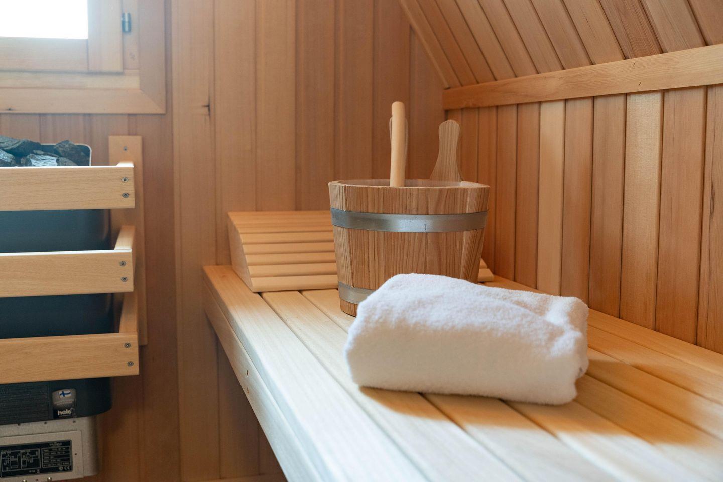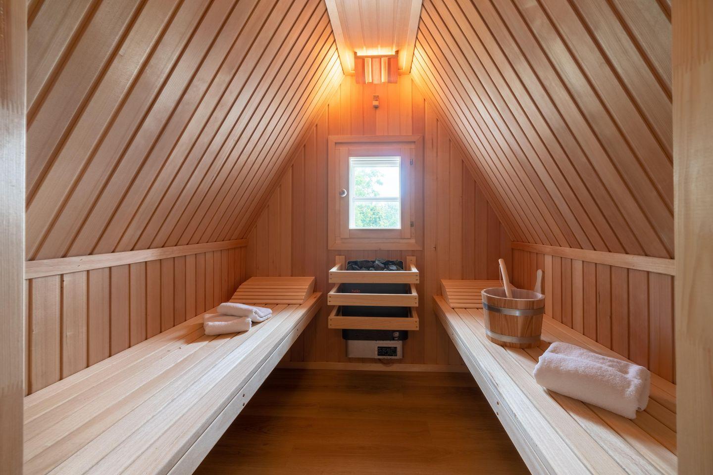 Die im Dachgeschoss gelegene Sauna gibt über ein kleines Fenster den Blick in den Garten und auf die umliegende Landschaft frei.