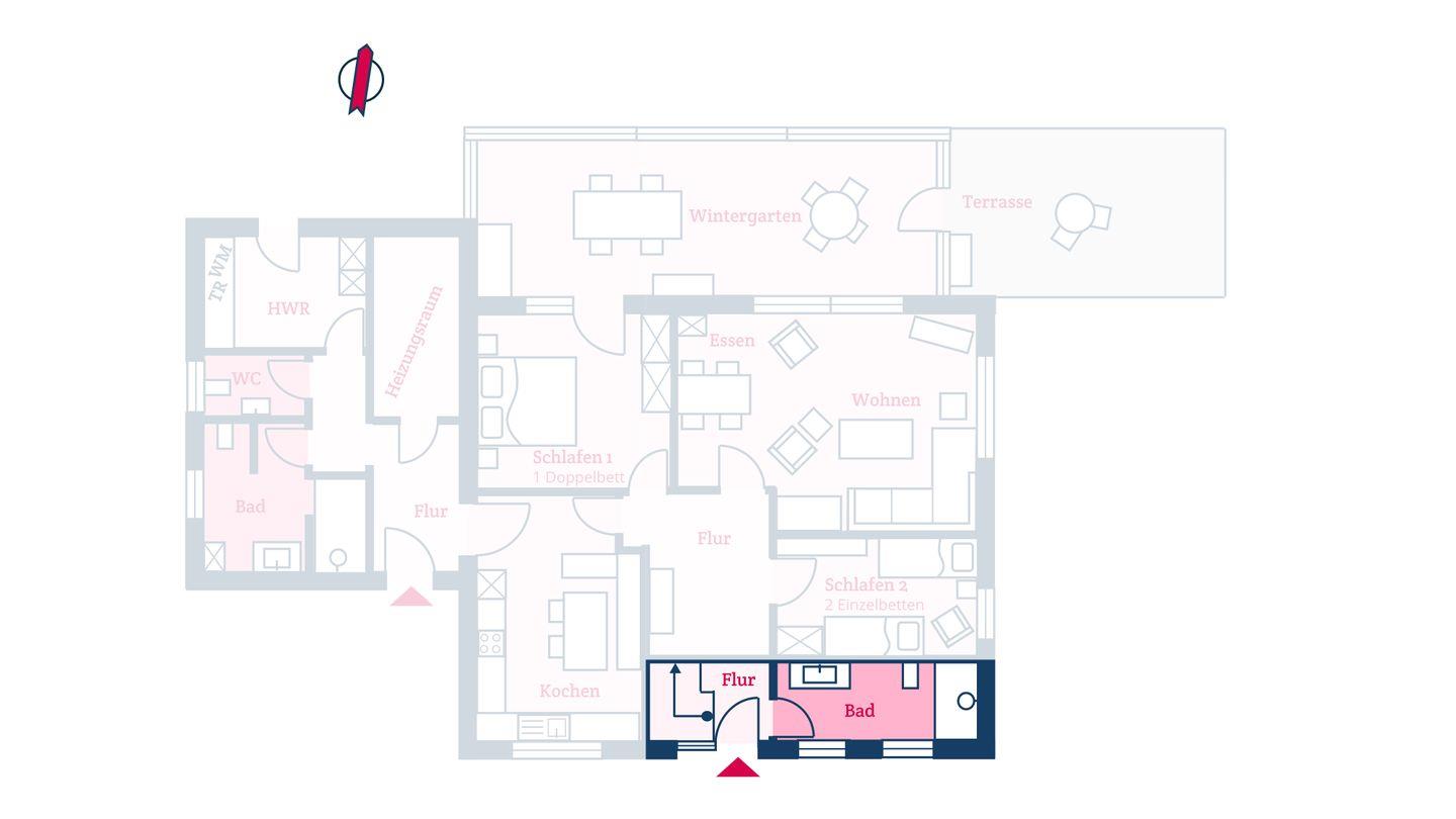 Die Ferienwohnung ist im Obergeschoss gelegen und verfügt über einen großzügigen Wohn- und Essbereich mit offener Küche, vier Schlafzimmer, zwei Duschbäder und eine Dachterrasse. Zwei Schlafzimmer sind jeweils mit einem Doppelbett ausgestattet, zwei weitere jeweils mit einem Einzelbett. Über den Wohnbereich gelangen Sie direkt auf die Dachterrasse. Das zweite Bad befindet sich im Erdgeschoss ebenso wie der gemeinschaftlich genutzte Hauswirtschaftsraum mit einer Waschmaschine und einem Trockner. Der Eingang zum Hauswirtschaftsraum befindet sich auf der Rückseite der Unterkunft. Die Ferienwohnung verfügt über einen separaten Eingang.