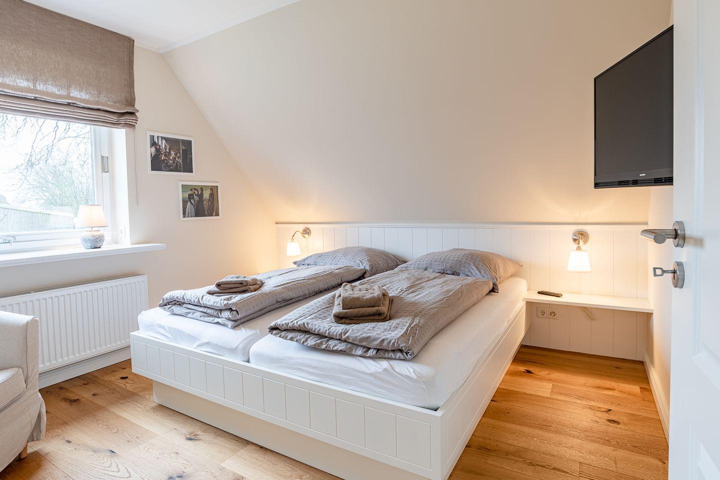 Die Obergeschosswohnung im White House verfügt über 4 Schlafzimmer und 2 Bäder und bietet somit komfortabel Platz für bis zu 4 Personen zuzüglich einer Kleinkinderaufbettung.