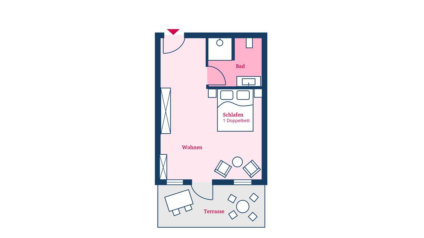 Das Doppelzimmer 01 ist in ein Wohn-Schlafzimmer und ein Duschbad unterteilt und bietet somit komfortabel Platz für bis zu 2 Personen zuzüglich einer Kleinkinderaufbettung. Zudem steht Ihnen eine eigene Terrasse zur Verfügung.