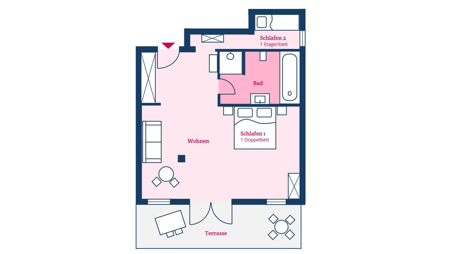 Das Appartement 3 ist in ein Wohn-Schlafzimmer mit einem Doppelbett, ein weiteres Schlafzimmer mit einem Stockbett, sowie ein Vollbad unterteilt und bietet somit komfortabel Platz für bis zu 4 Personen zuzüglich einer Kleinkinderaufbettung. Zudem steht Ihnen eine eigene Terrasse zur Verfügung.