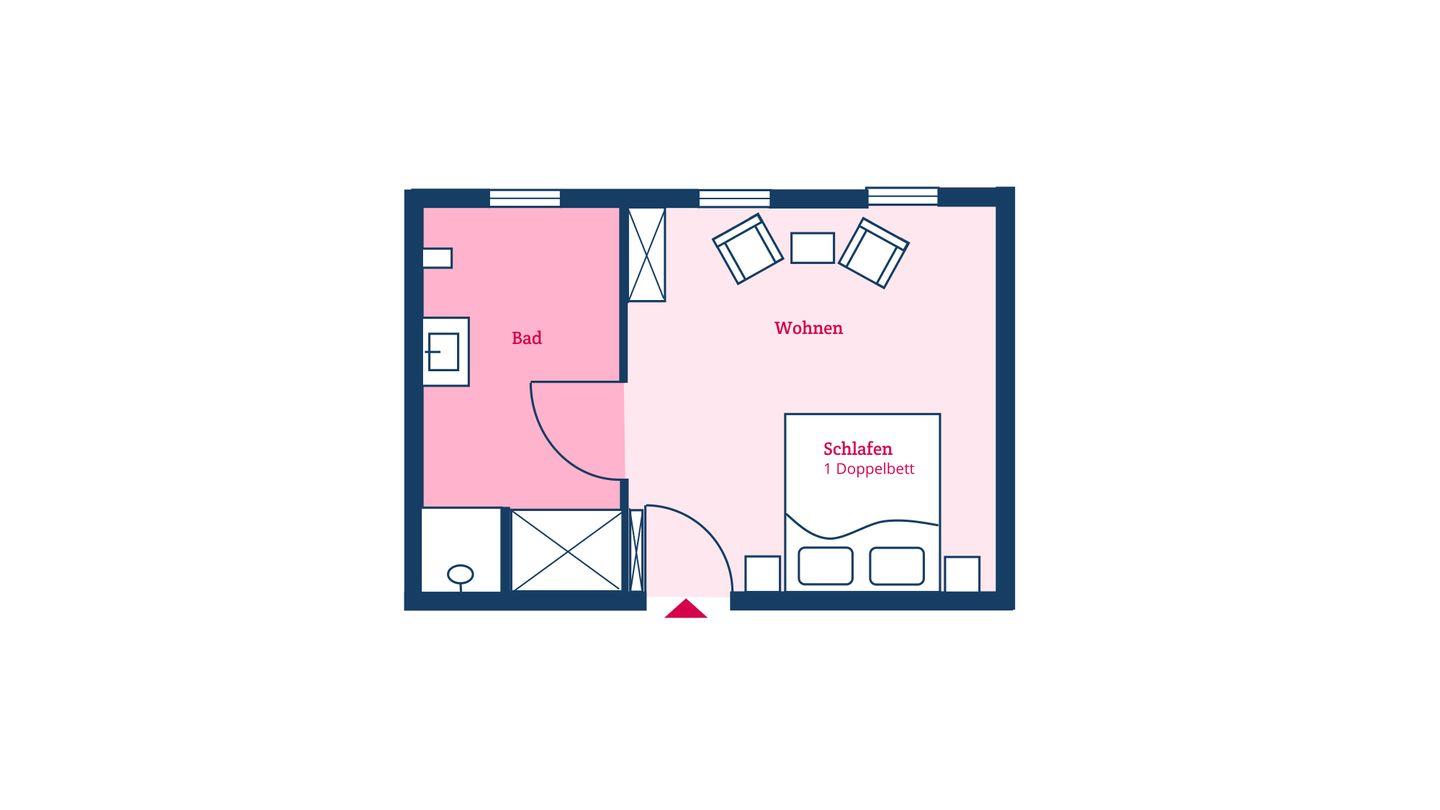 Das Doppelzimmer 08 ist in ein Wohn-Schlafzimmer und ein Duschbad unterteilt und bietet somit komfortabel Platz für bis zu 2 Personen zuzüglich einer Kleinkinderaufbettung.