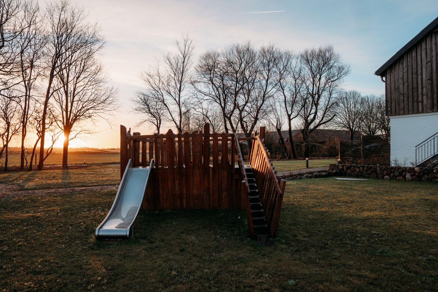 Der groß angelegte Spielplatz auf dem Grundstück ist eine Wohlfühloase für Ihre Kinder - von Seilbahn und Schaukel über ein Basketballfeld bis Trampolin gibt es viele Möglichkeiten zum Austoben. Der Spielplatz steht ausschließlich den Gästen des Hotels zur Verfügung. Bei schlechtem Wetter erheitern Tischtennis und Kicker sowie eine "Ecke" zum Spielen und Toben in der Spielscheune die Gemüter. In einem vom restlichen Garten abgetrennten Bereich lädt die Fass-Sauna mit Ruheraum und Außendusche zum Relaxen in Strand-Ambiente ein - Erholung pur! Der große Parkplatz mit E-Auto-Ladestation auf dem Grundstück oder der kostenfreie Shuttle vom Hafen zum Hotel (mit Voranmeldung) runden das Angebot ab.