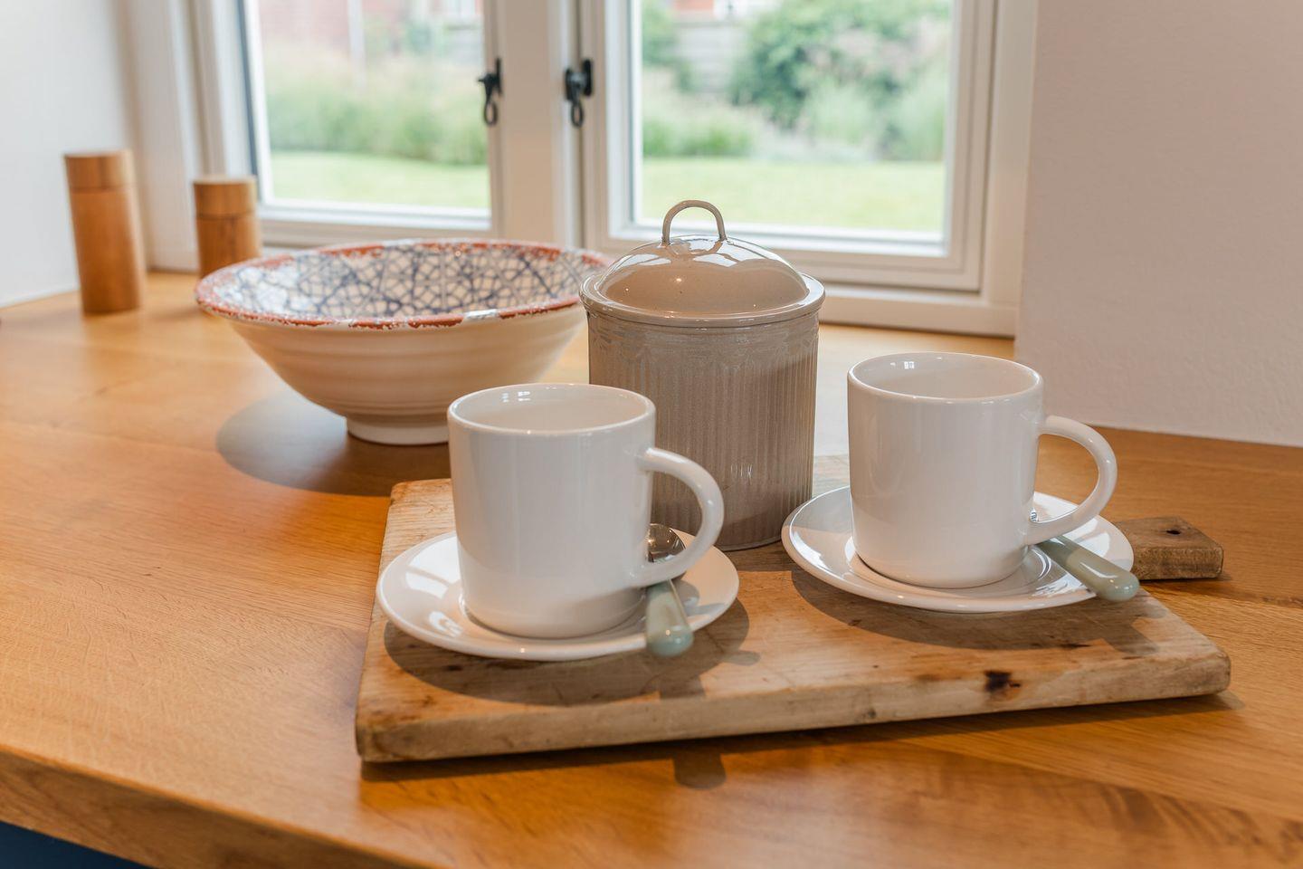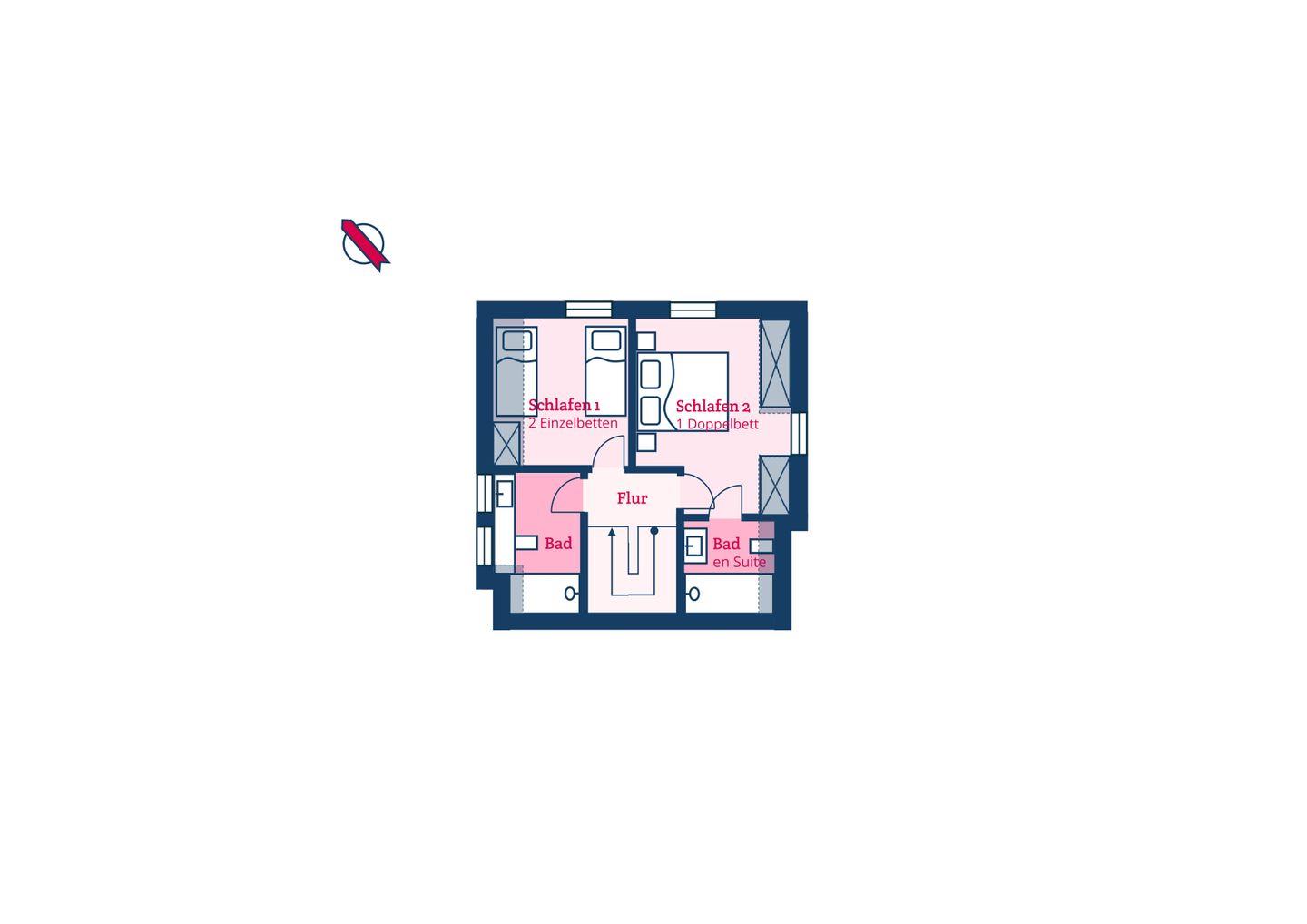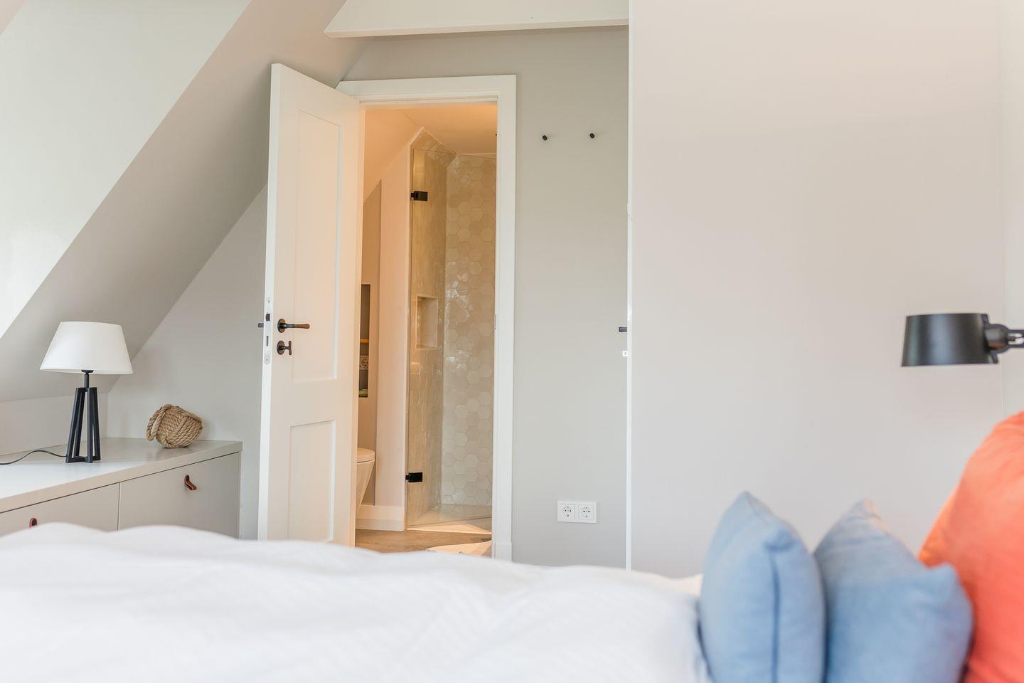 Im Obergeschoss sind die beiden Schlafzimmer - eines mit Doppelbett und eines mit zwei Einzelbeteten - und die beiden Duschbäder - eines davon en Suite - gelegen. Das Doppelbett-Schlafzimmer bietet Ihnen einen schönen Ausblick auf die Alkersumer Marschlandschaft.