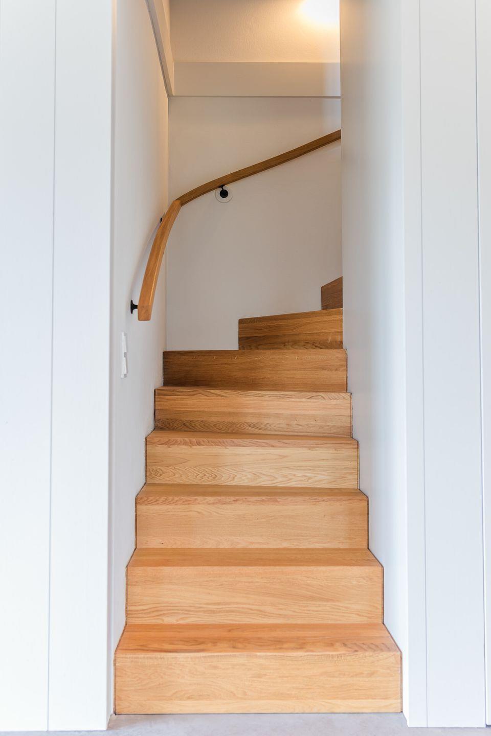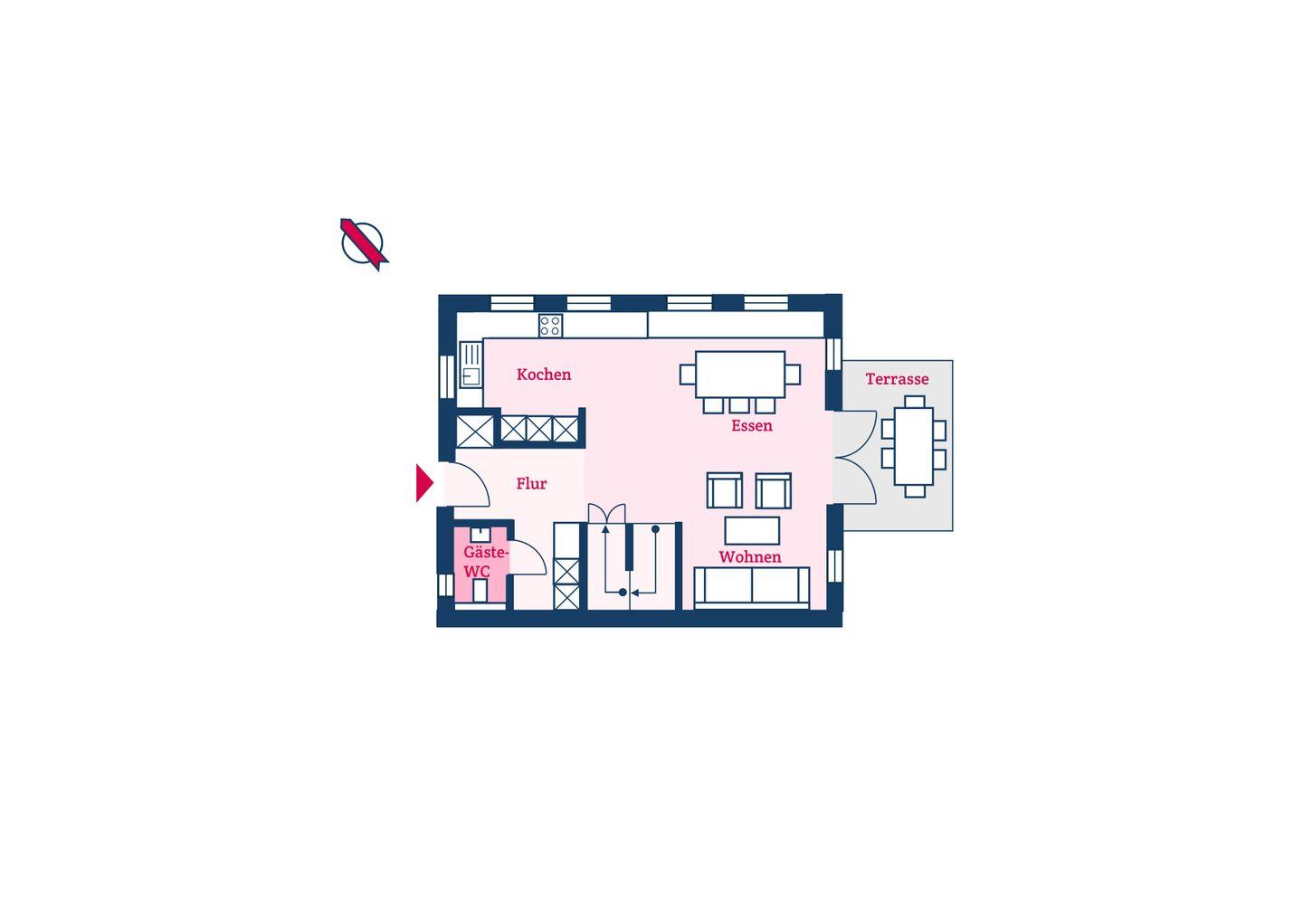 Im Erdgeschoss befinden sich der großzügige Wohn- und Essbereich mit offener Küche, sowie ein Gäste-WC. Über den Wohnbereich gelangen Sie auf die Terrasse und in den eigenen Garten.