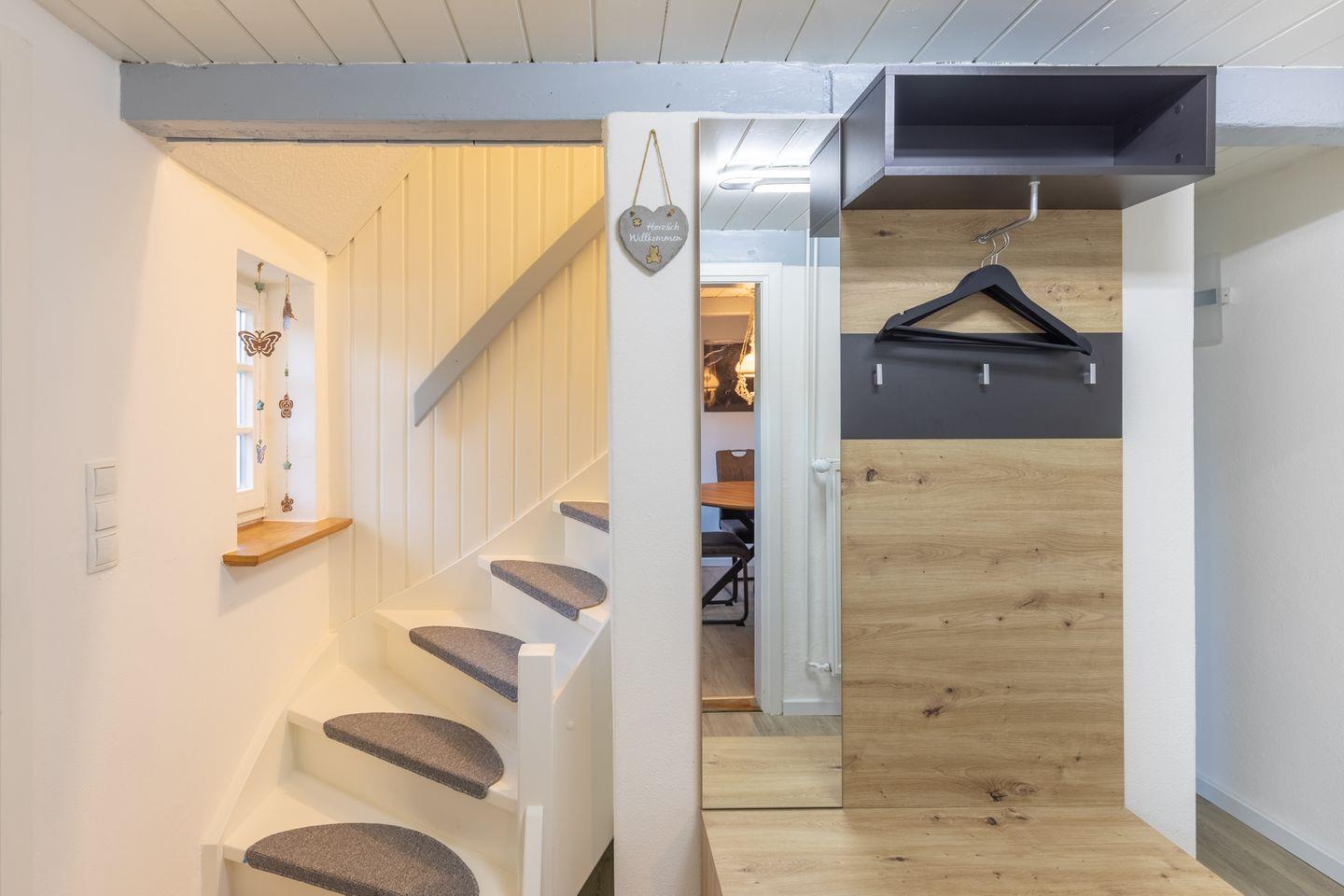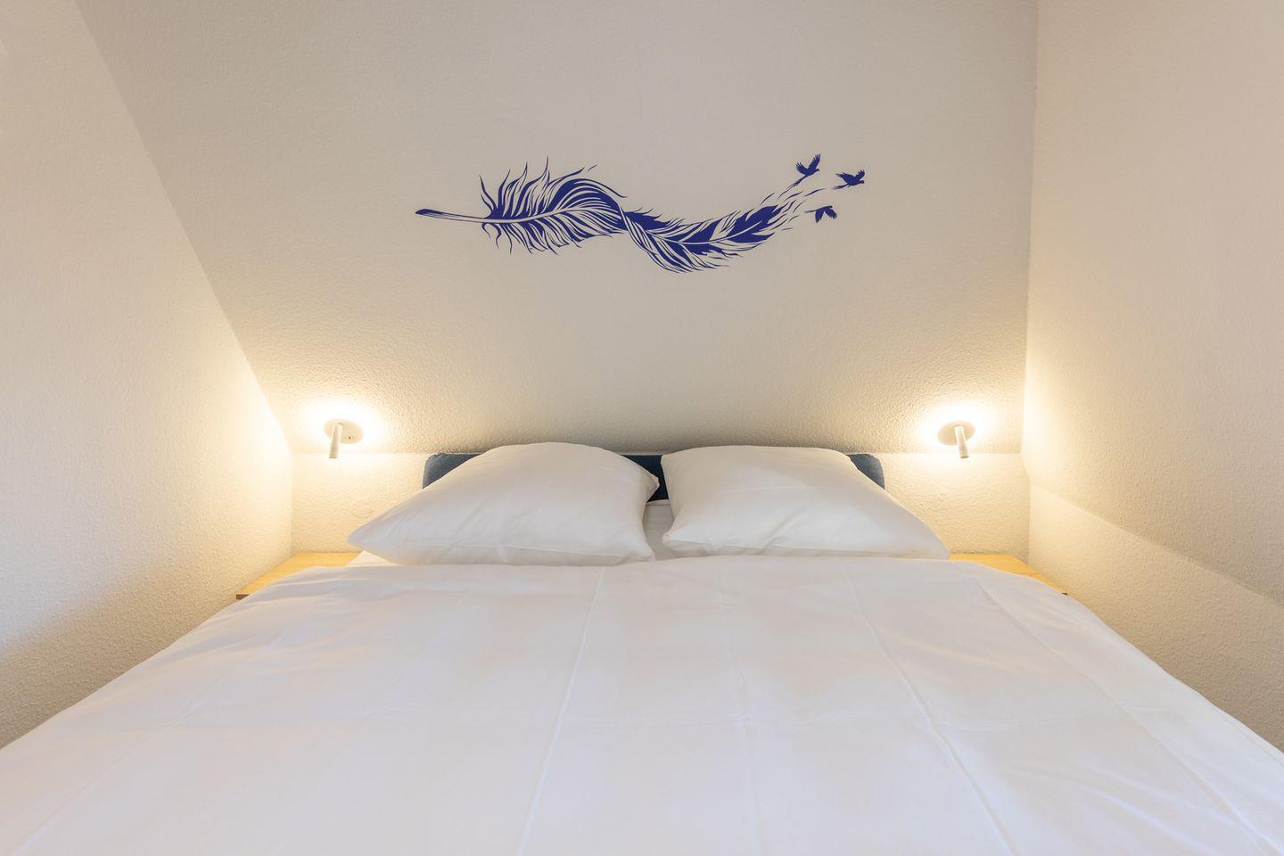 Über eine geschlossene Treppe erreichen Sie das Obergeschoss mit einem weiteren Schlafzimmer (160 x 200). Ein Highlight der Unterkunft ist der Wellness-Raum mit einer Sauna und dem Ruhebereich mit TV.