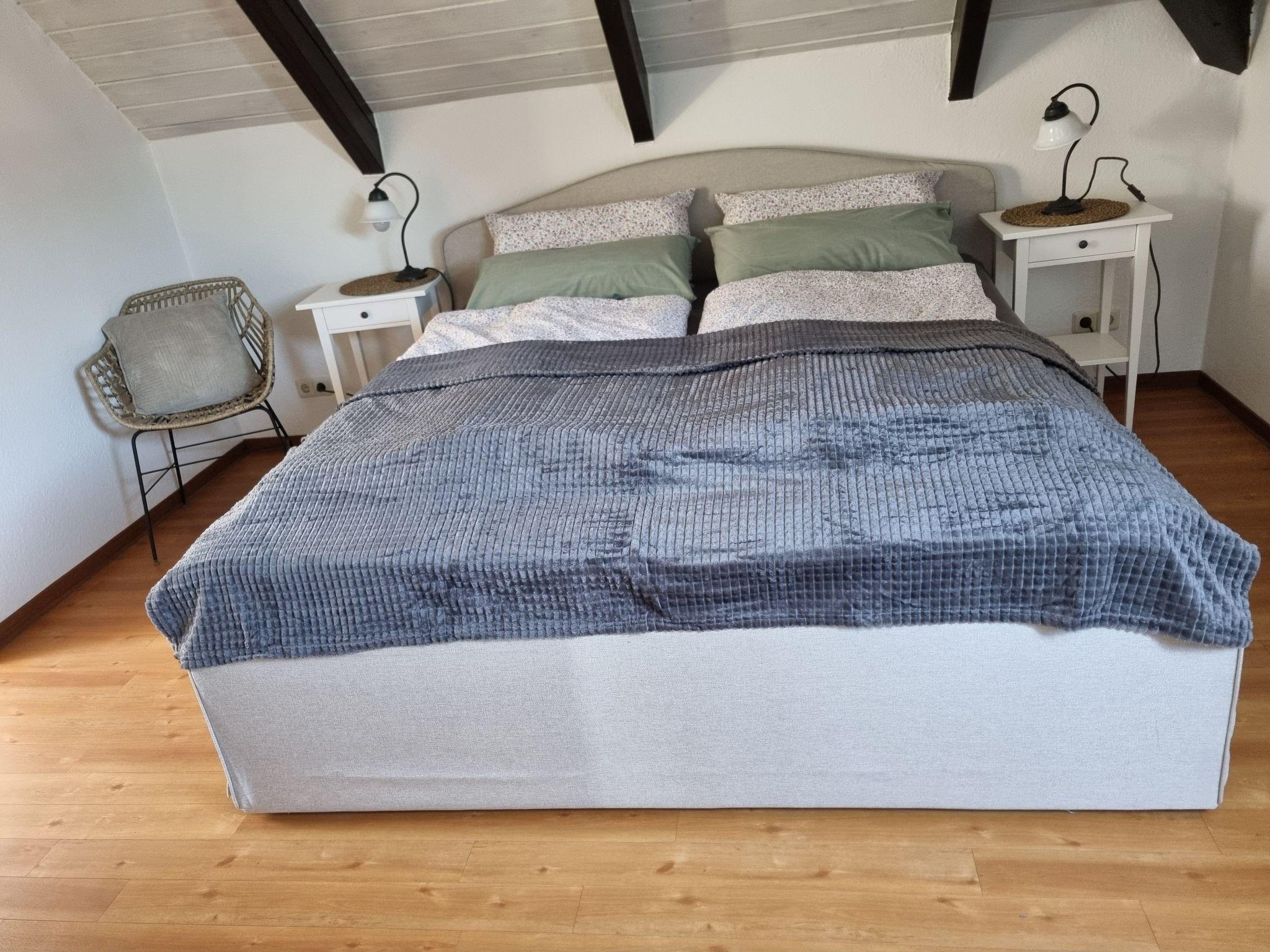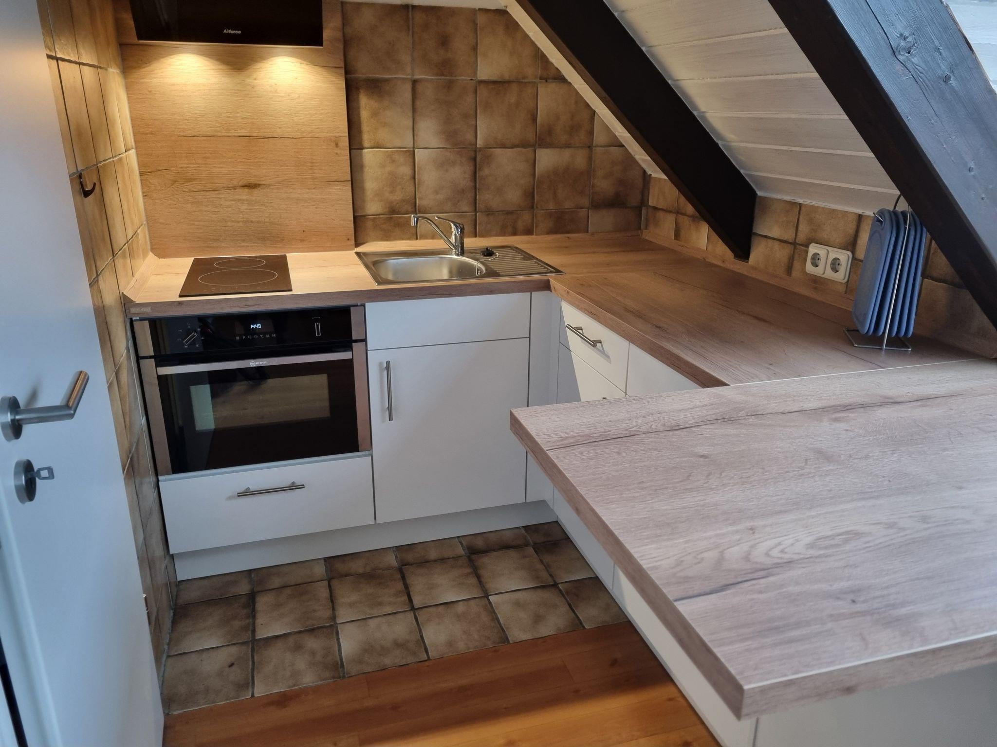 Sie wohnen in einer komplett renovierten 2-Zimmer Ferienwohnung mit separatem Eingang im 1. OG. Die Wohnung teilt sich in eine Wohnküche mit komplett ausgestatteter Einbauküche (Bauckofen,/Mikrowelle 2 - Platten Herd, Kühlschrank mit Eisfach, Kaffeemaschine, Toaster, Wasserkocher und Eierkocher). Im Schlafzimmer schlafen sie in einem Doppelbett 180x200cm mit genügend Stauraum. Vom Schlafzimmer aus gelangen sie in dasTageslichtbadezimmer mit Dusche/WC.