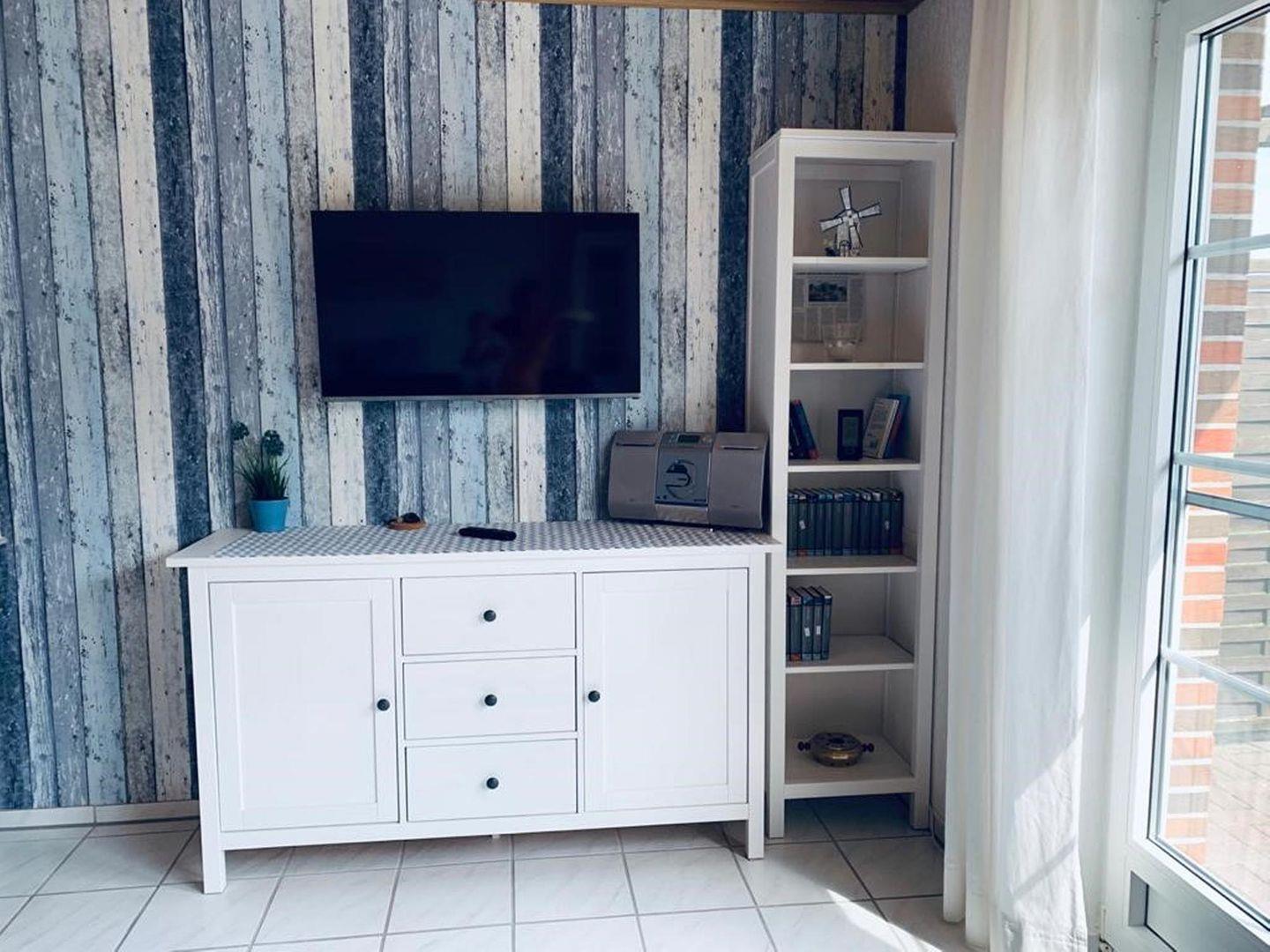 Wohnzimmer mit Sat- TV und Stereoanlage, Essecke.