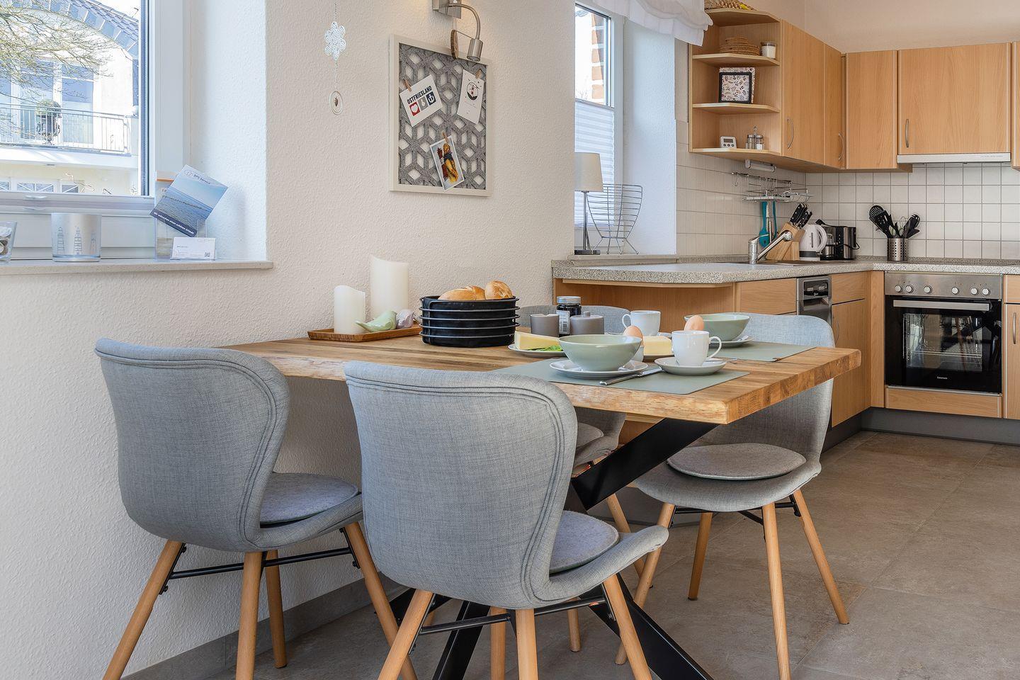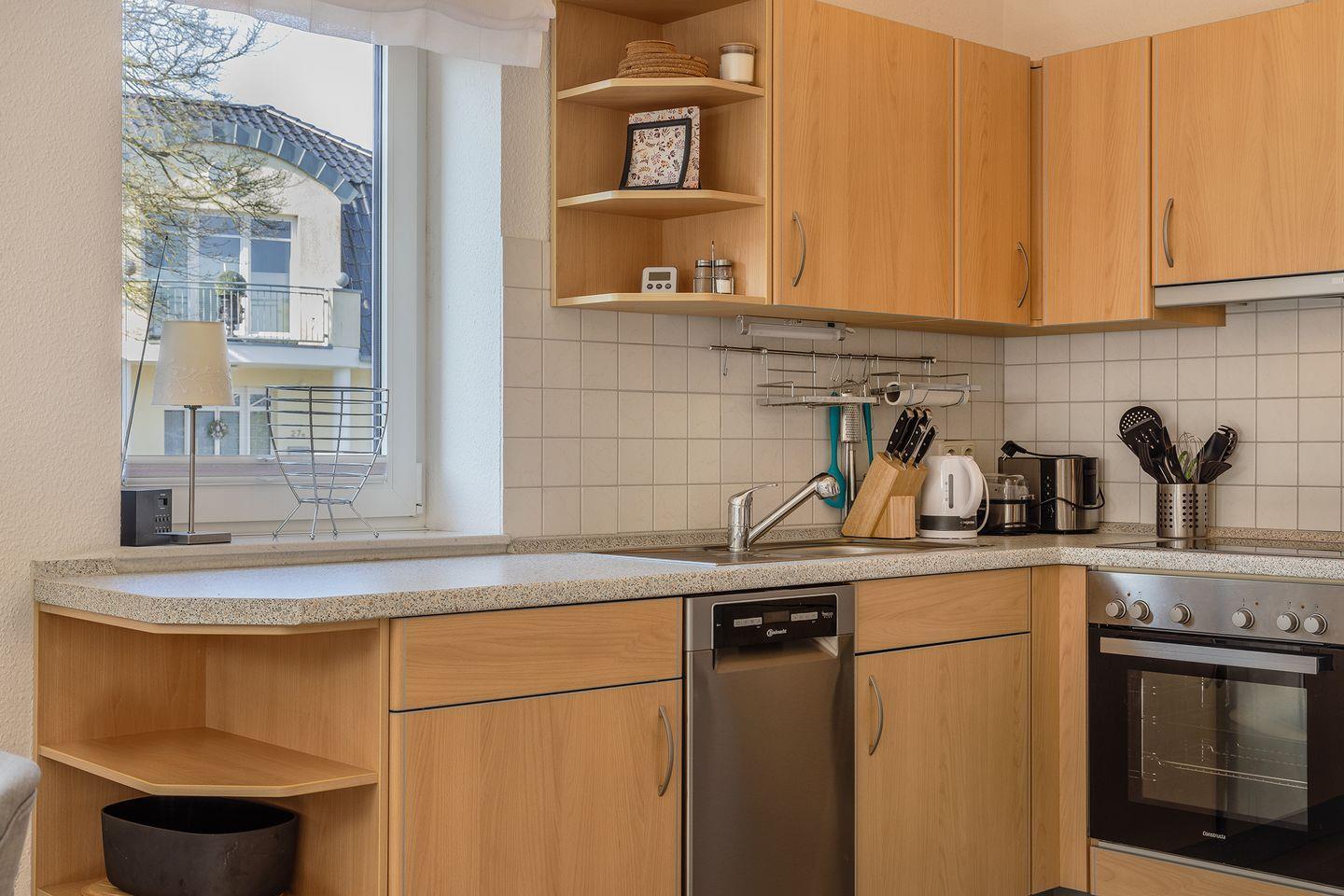 angrenzender offener Küchenbereich mit Spülmaschine, Backofen, Mikrowelle etc.