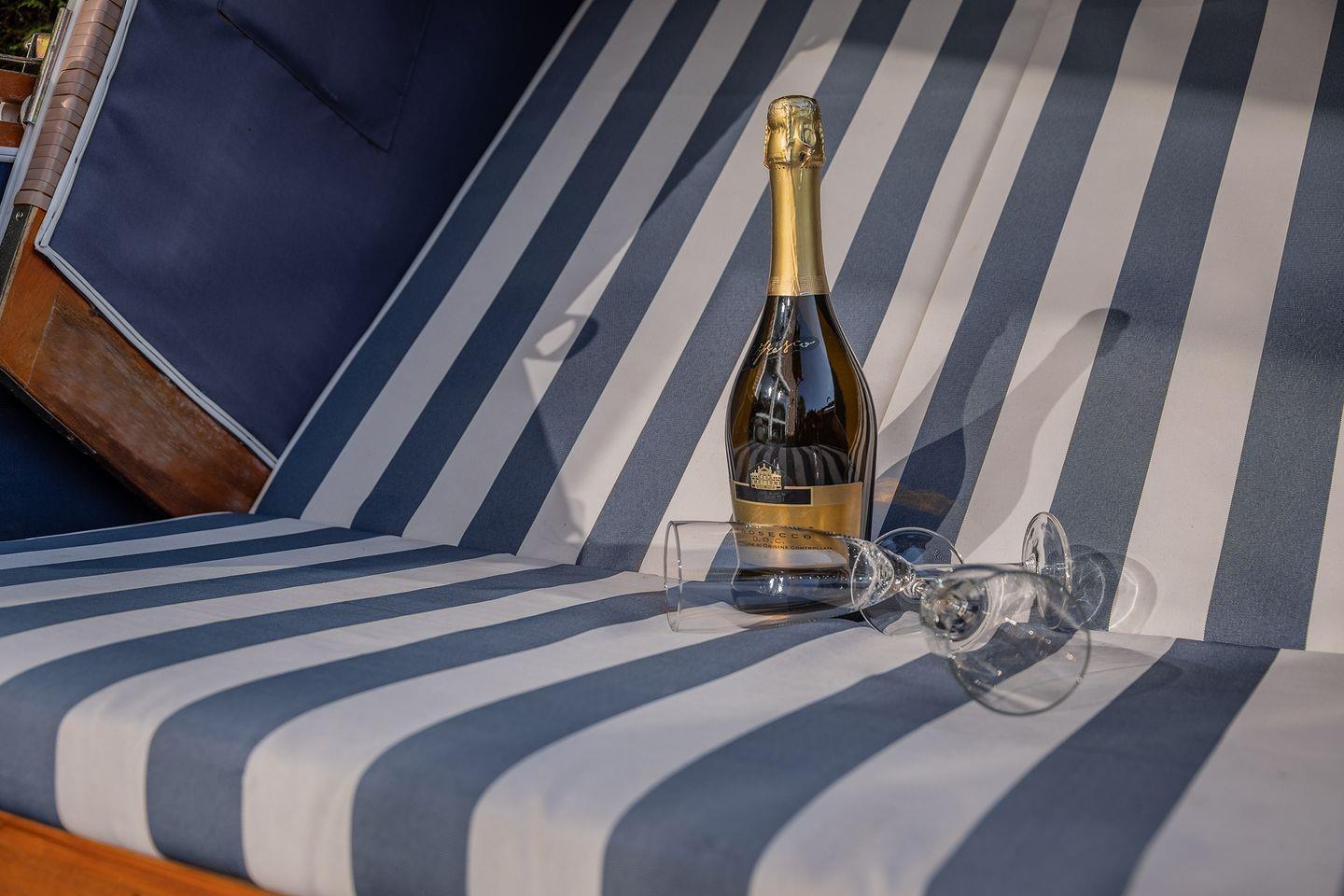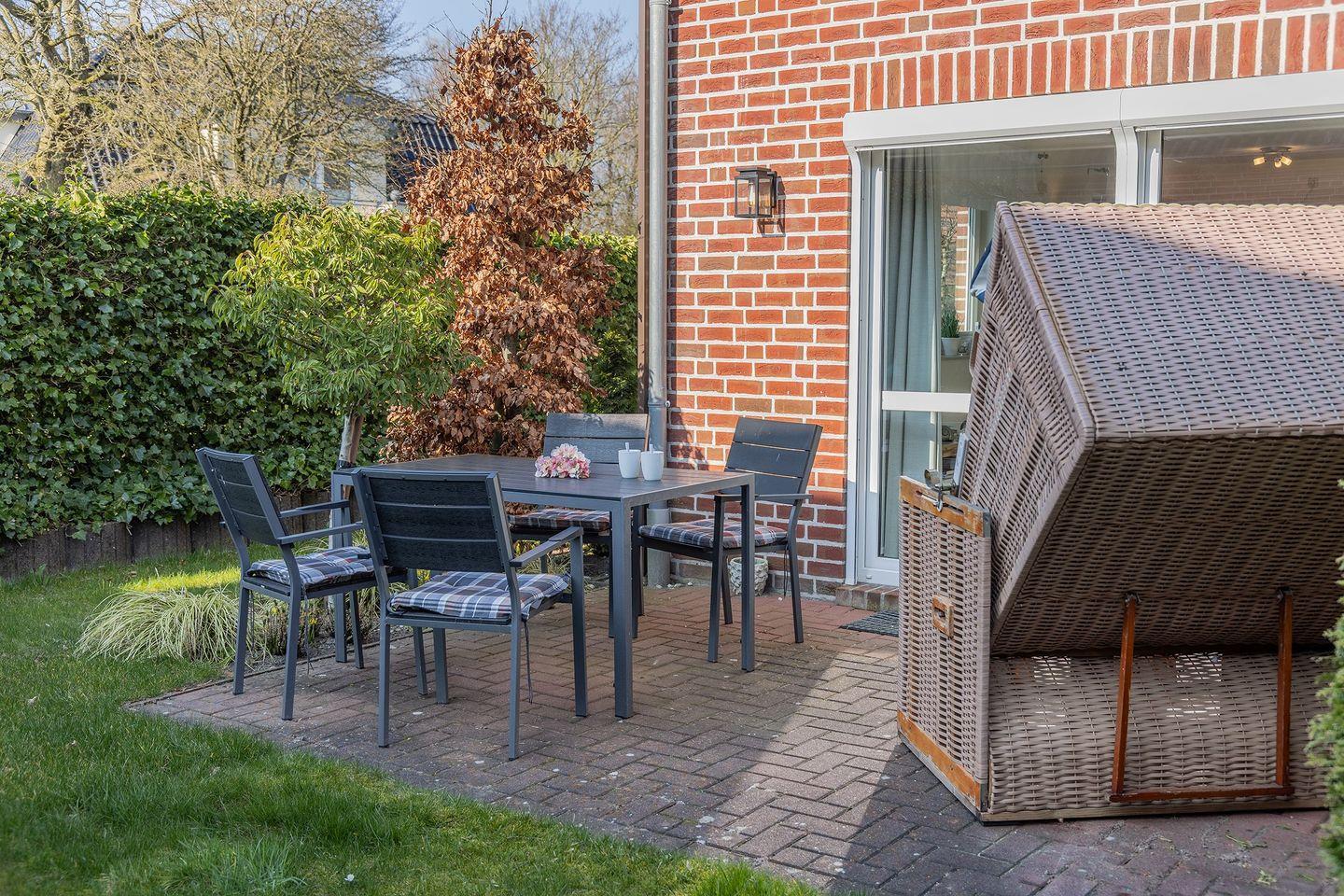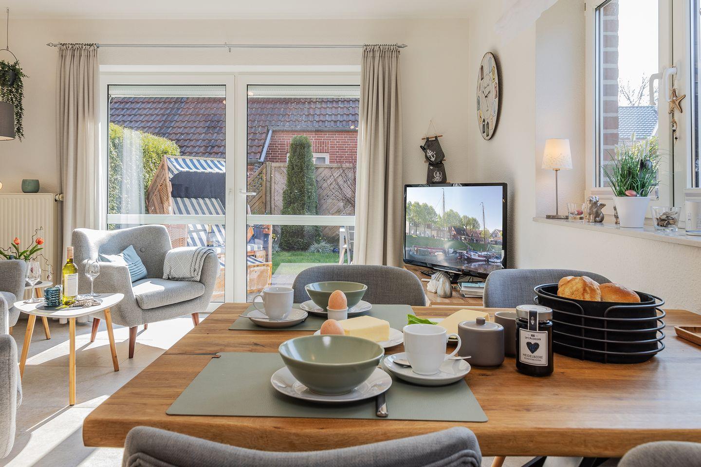 Erdgeschoss: Helles Wohnzimmer mit Flachbild, Radio, Bluetooth, Kinderhochstuhl, Ausgang zu Terrasse mit Strandkorb und Garten,