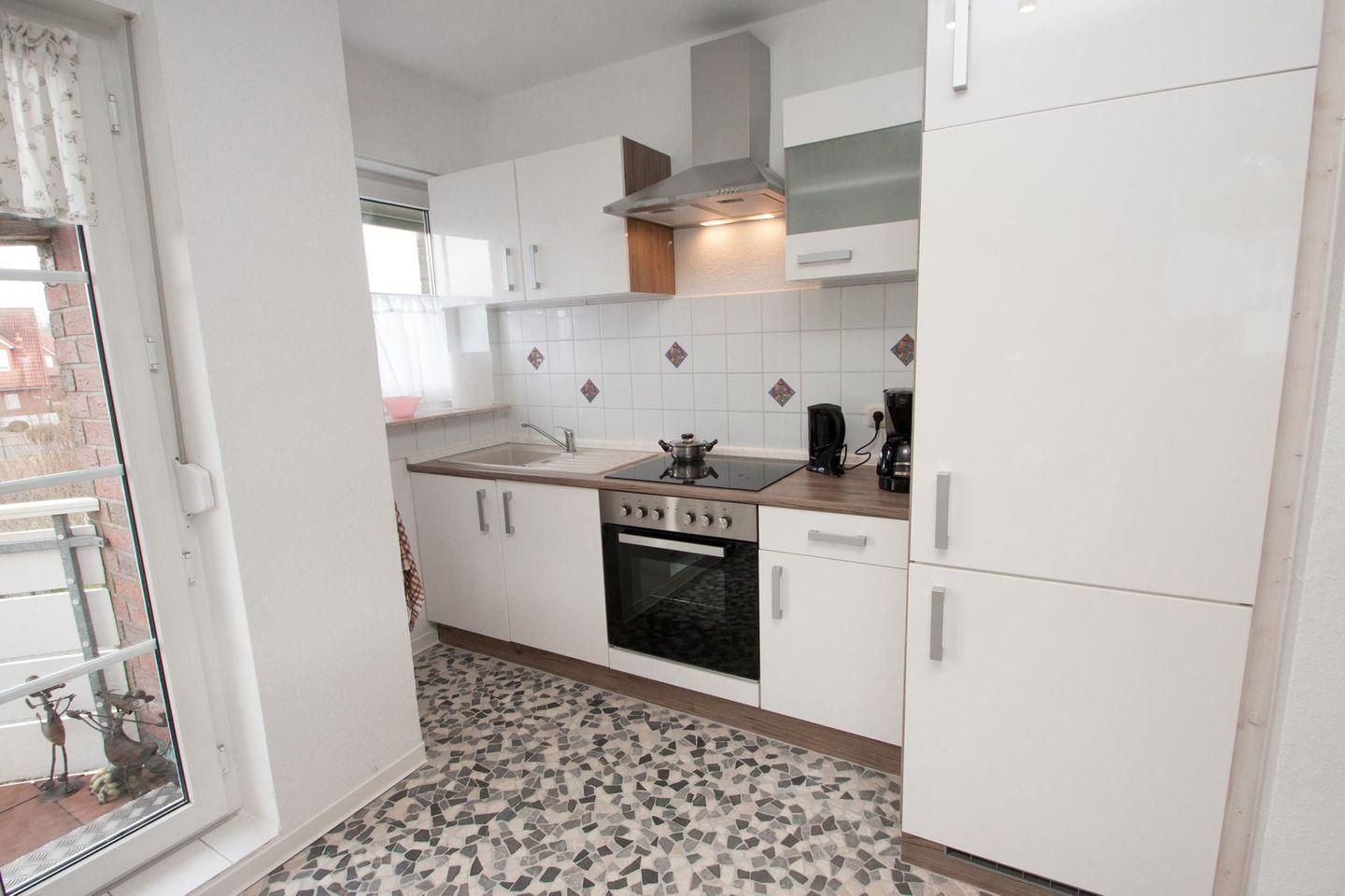 Gemütliche Maisonette-Wohnung in Altfunnixsiel mit Balkon, moderner Küche und Fahrradverleih für entspannte Urlaubstage am Meer.