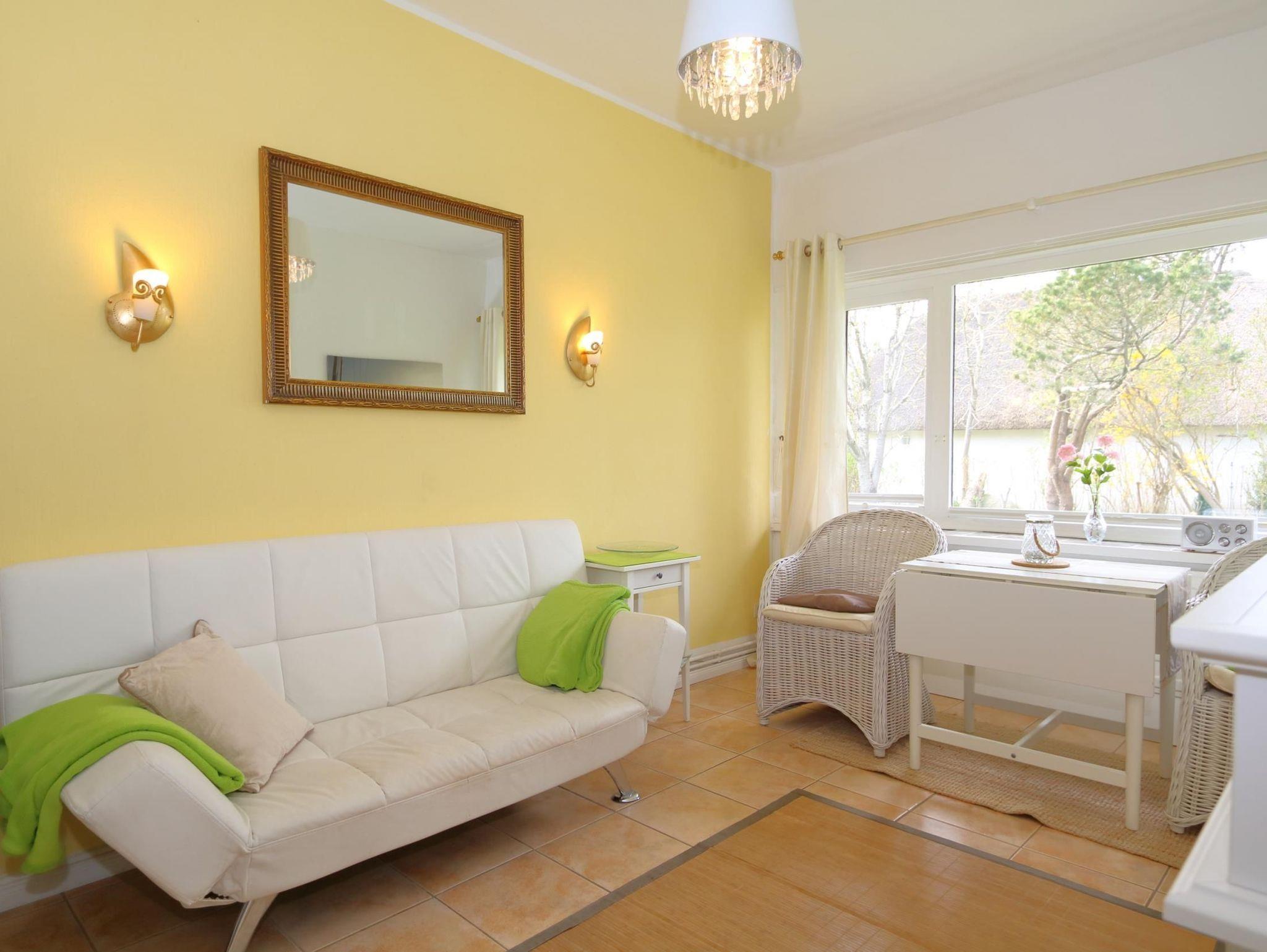 Das Wohnzimmer hat eine Schlafcouch und den Essplatz. Eine neue vollausgestatte kleine Küche mit Geschirrspülmaschine, Mikrowelle/Backofen/Grill und Ceranfeld ist vorhanden. Im Schlafzimmer steht ein Doppelbett. Von hier gelangt man in das Duschbad. Die Einrichtung ist sehr gemütlich im Landhausstil gehalten. Im Garten stehen Strandkorb und Gartenmöbel.