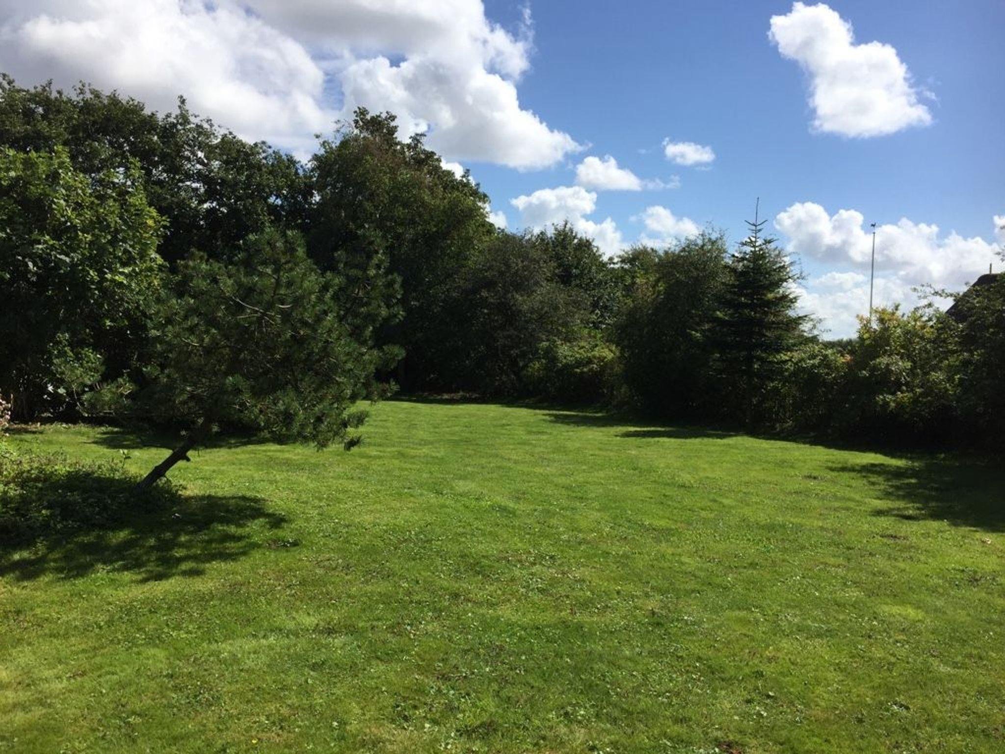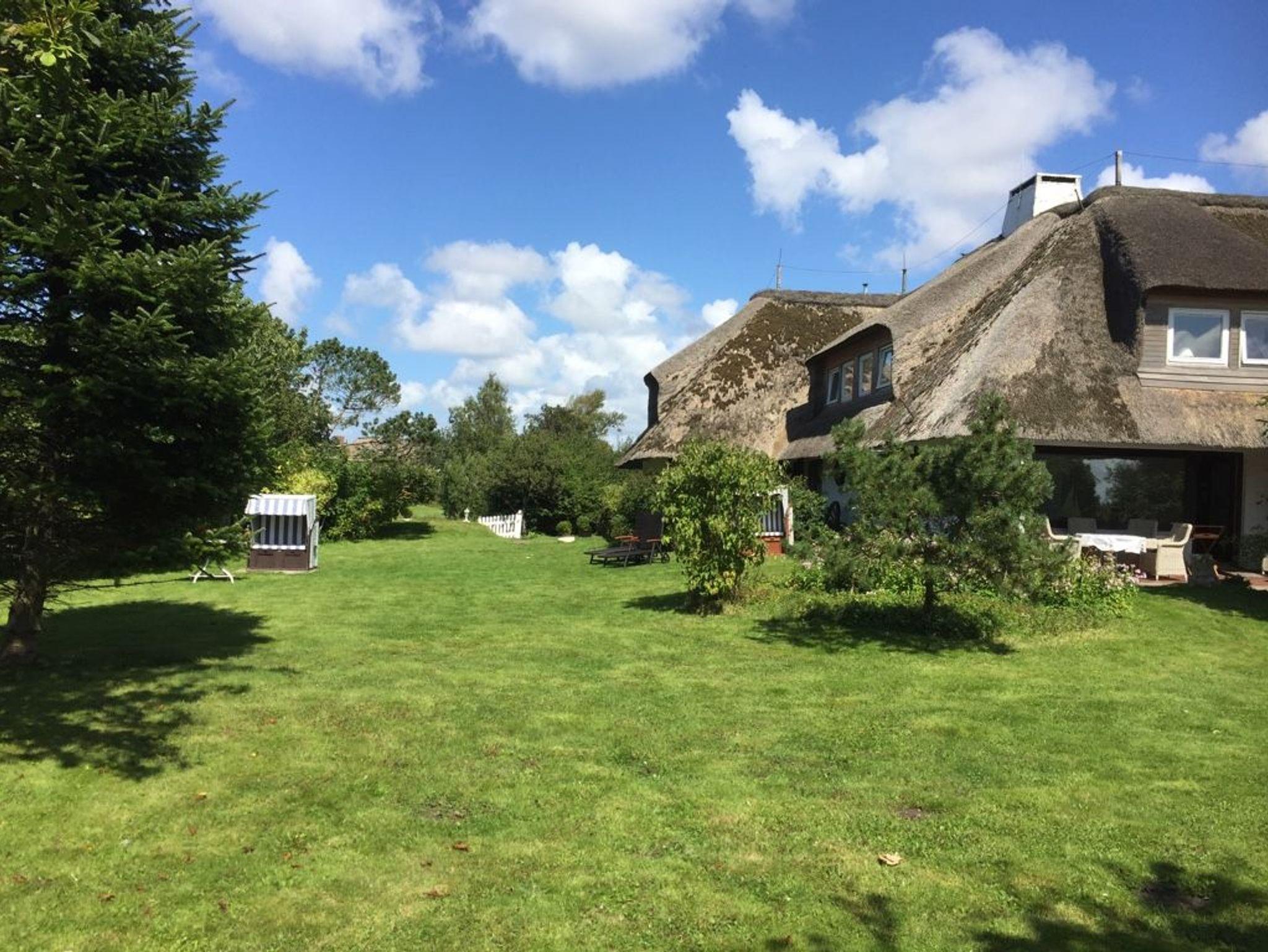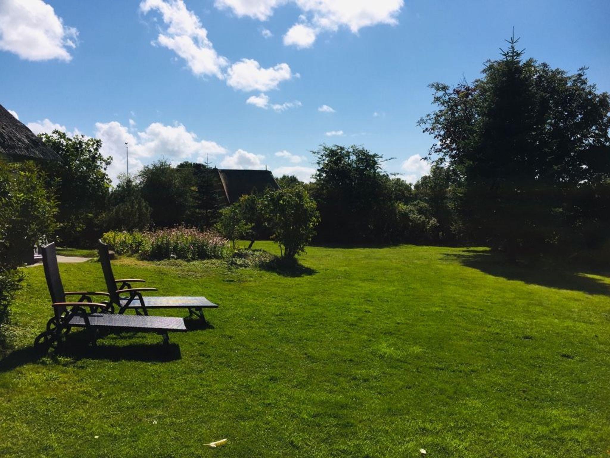 Im Garten stehen Strandkorb und Gartenmöbel.