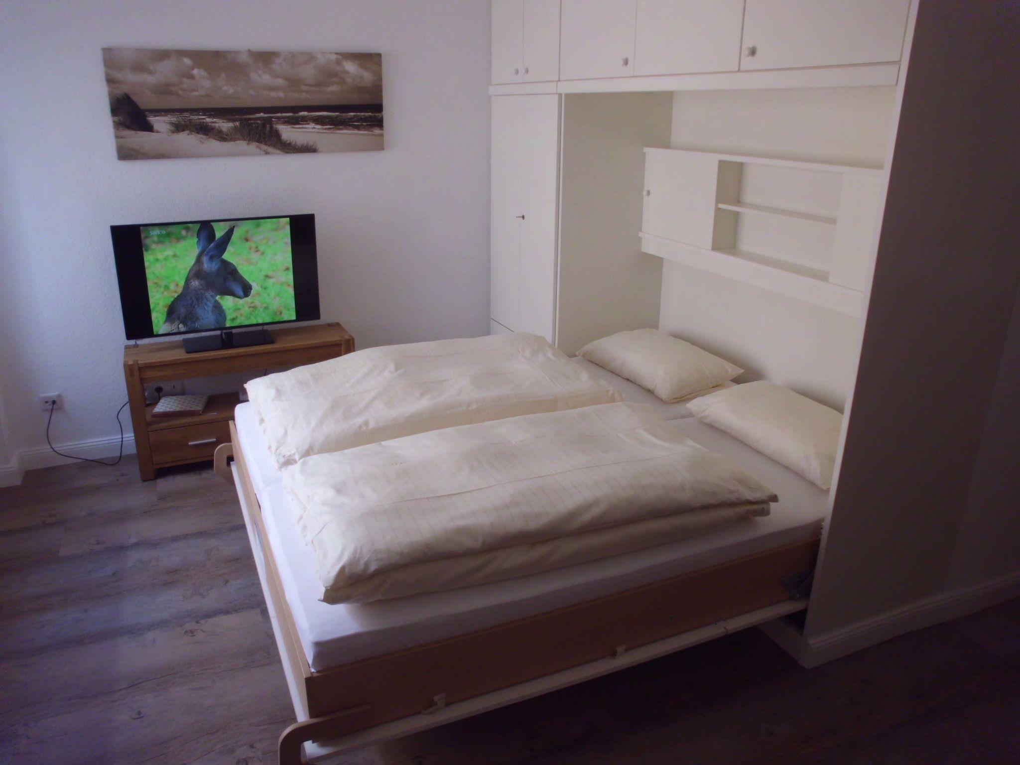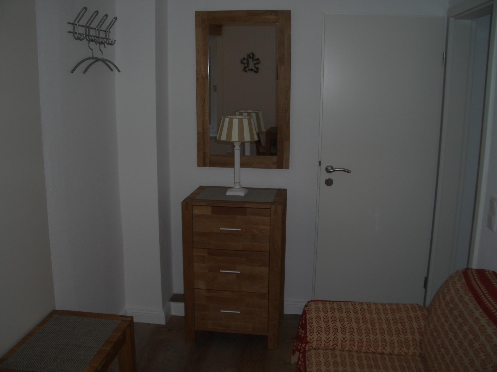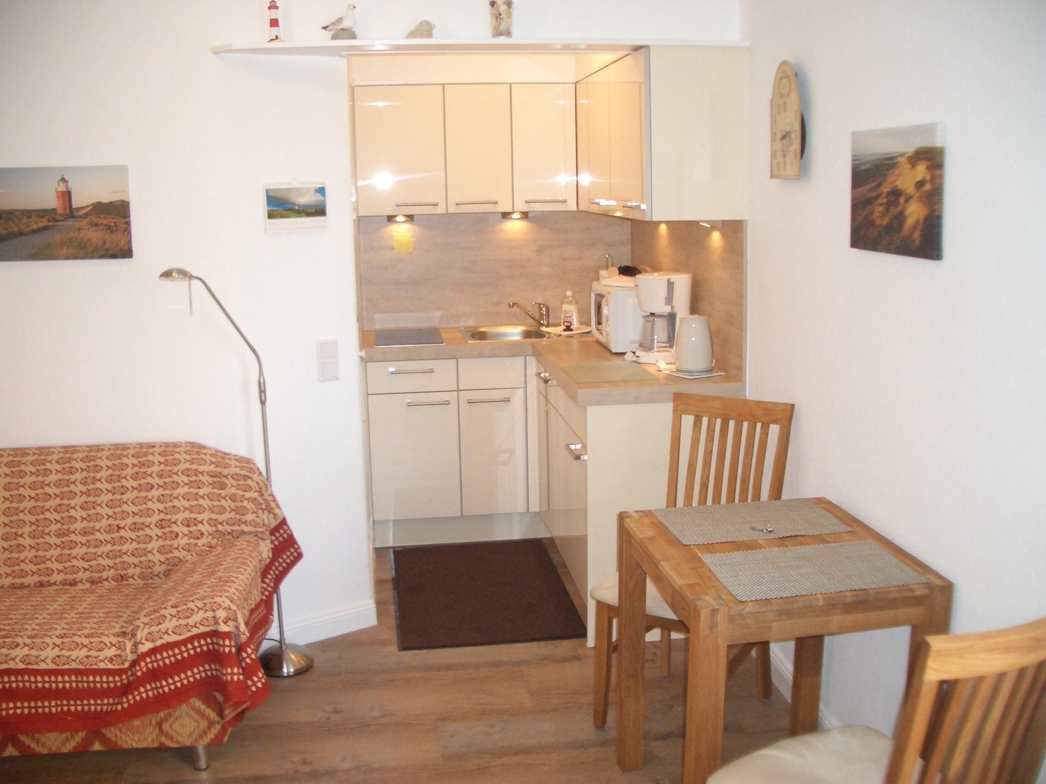Die 1-Zimmer-Ferienwohnung ist für maximal zwei Personen, hat eine Wohnfläche von ca. 23 m² und besteht aus einem Wohn-, Schlafraum mit Pantryküche, einem Flur und einem neuen Duschbad. 2014 wurde die Wohnung saniert, das Mobiliar wird seitdem gepflegt und ggf. ersetzt. Die Küche ist mit einem Elektroherd, einem Kühlschrank mit Gefrierfach, einem Geschirrspüler, einem Wasserkocher und einer Kaffeemaschine ausgestattet. Der Wohn-, Schlafraum ist gemütlich eingerichtet mit einem Doppelschrankbett, einem Schrank, einer Kommode, einem Flachbildfernseher mit Radiofunktion, einer 2-Sitzer Couch und einem Esstisch mit zwei Stühlen. Im Badezimmer befindet sich eine Dusche, ein WC, ein Waschtisch und eine Handtuchheizung. In dem Appartement darf nicht geraucht werden und Tiere sind nicht erlaubt.