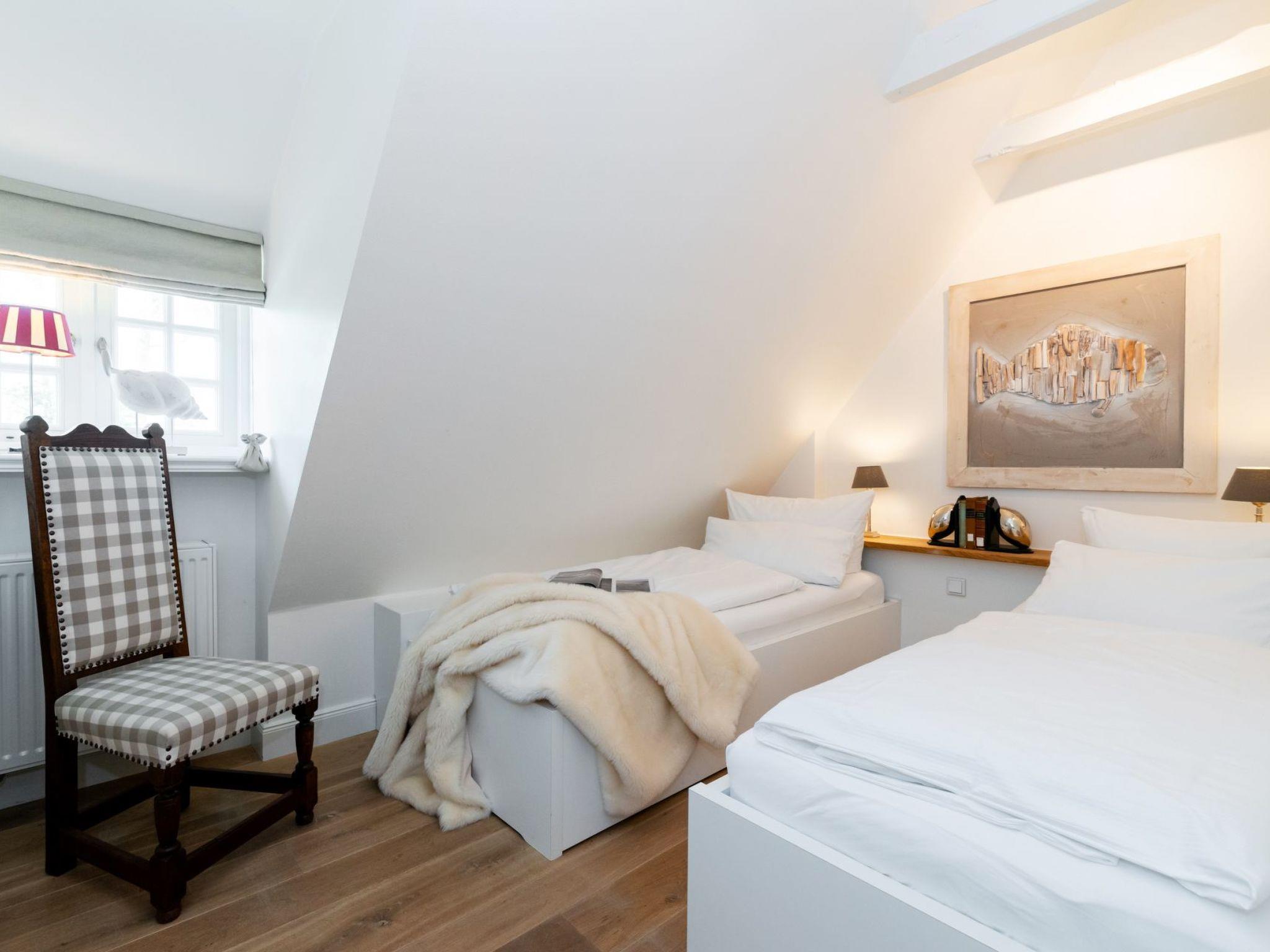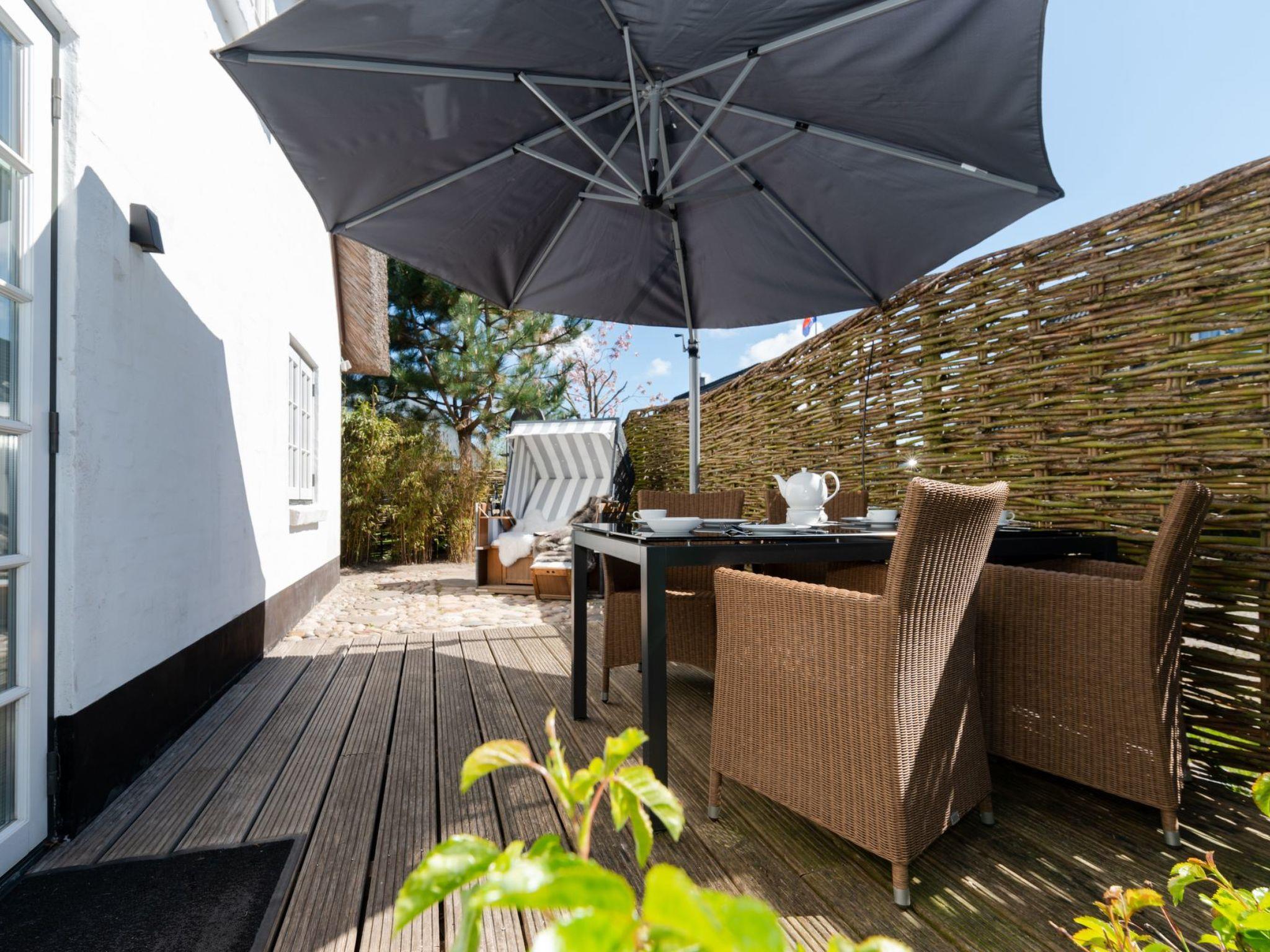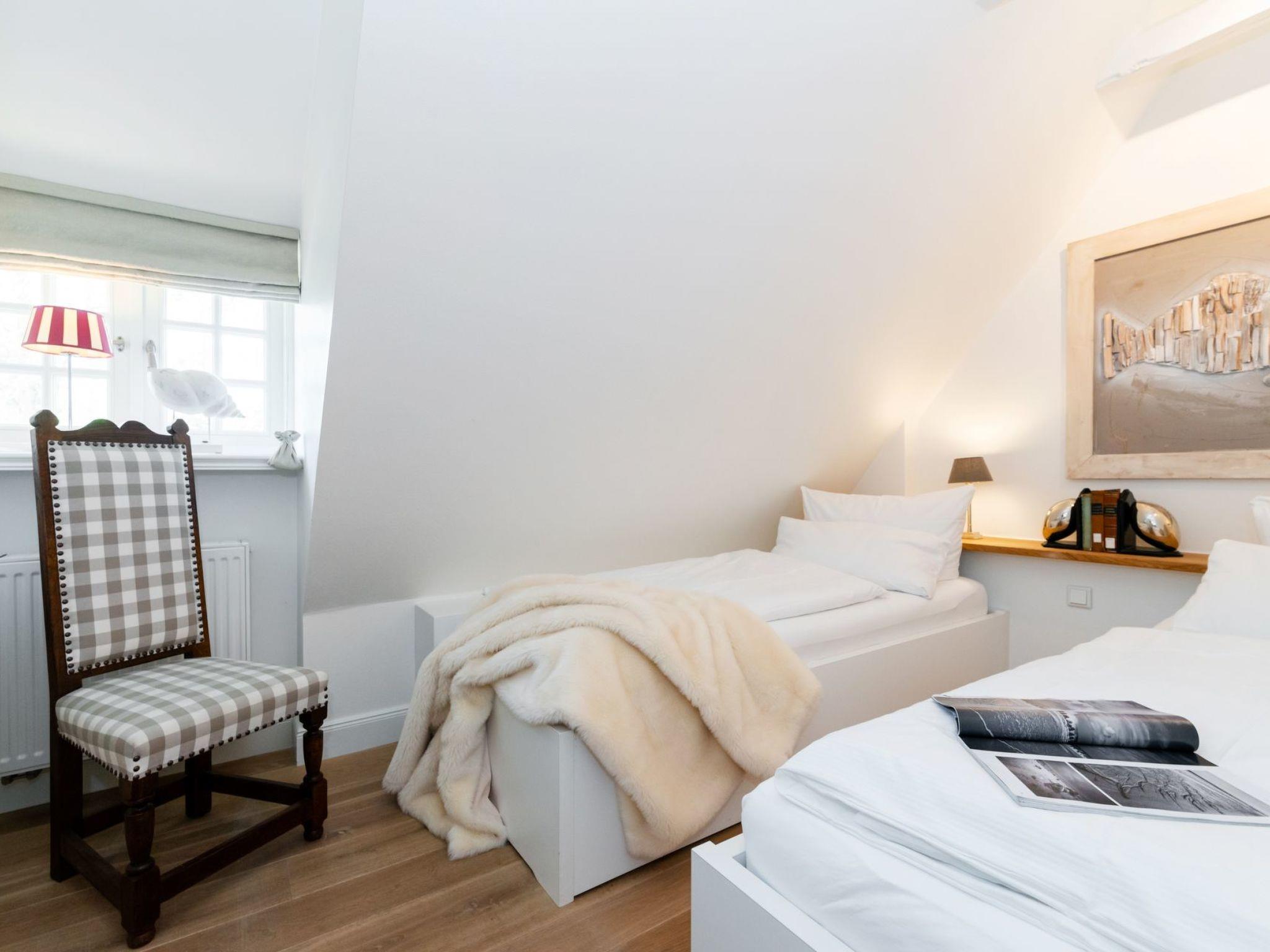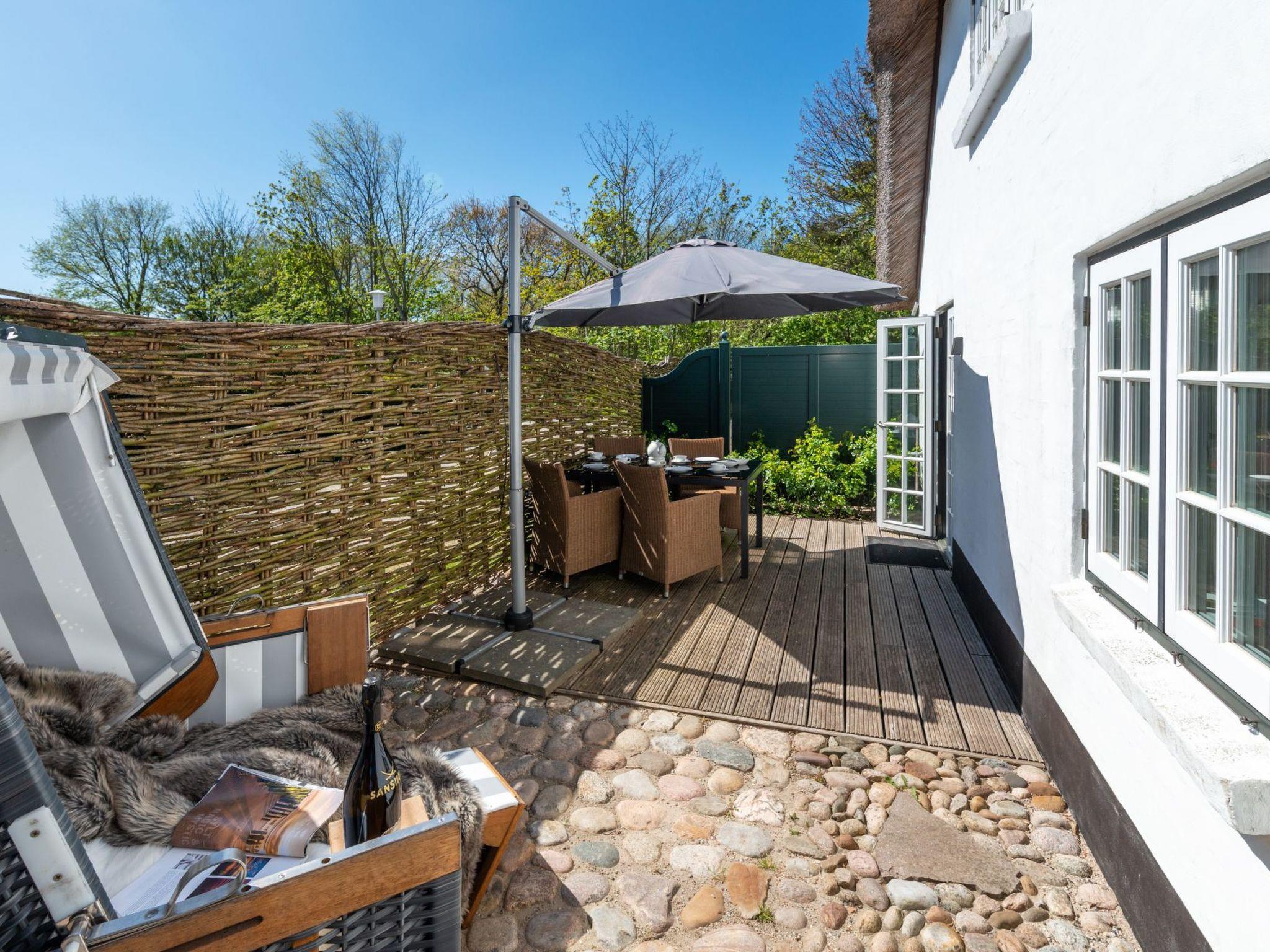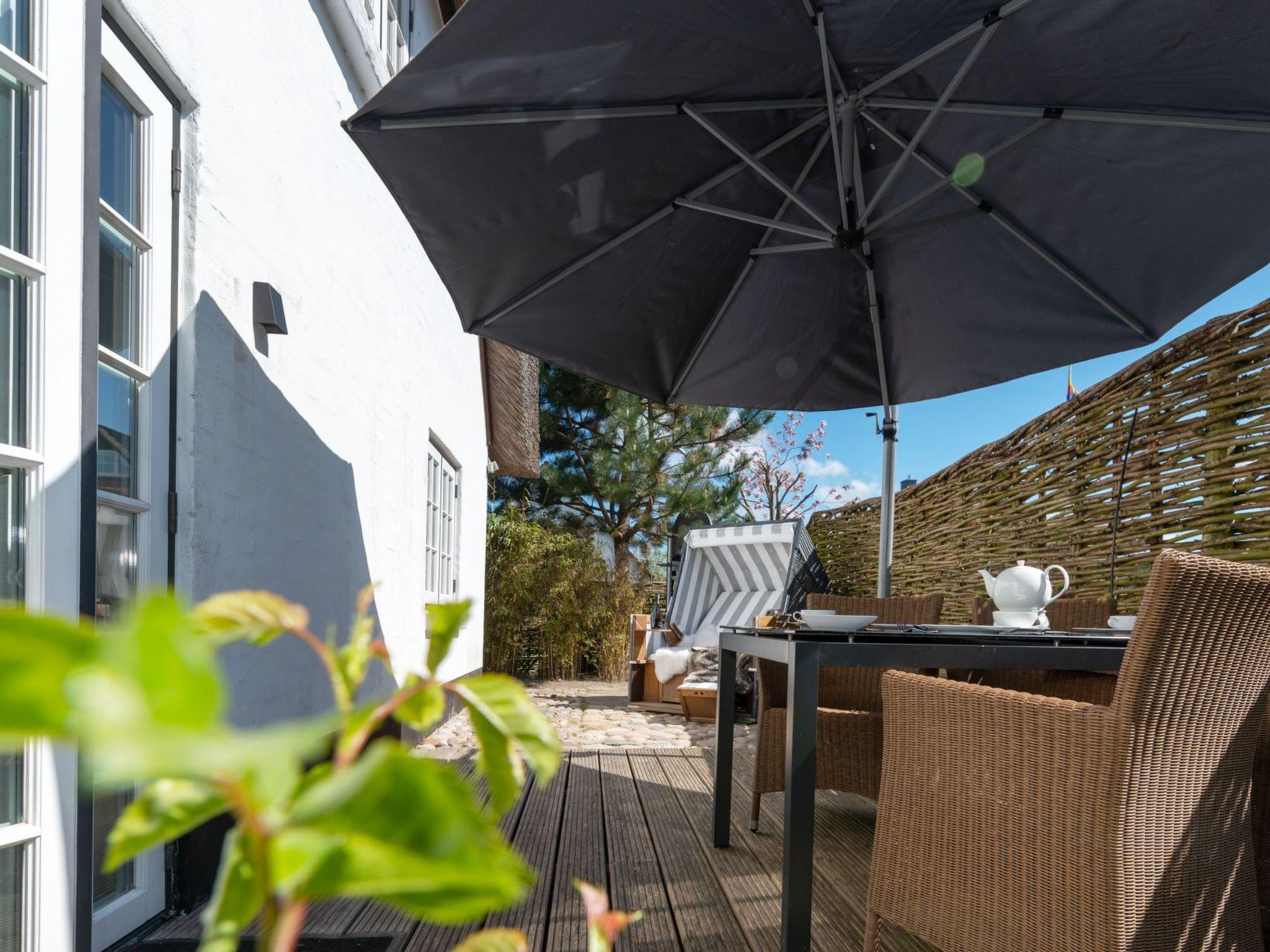 Sehr luxuriöse Ferienwohnung über zwei Etagen in einem Reetdachhaus mit großem Grundstück. Diese Ferienwohnung befindet sich in einem Reetdachhaus in ruhiger Lage im Süden von Tinnum auf der Insel Sylt.Die Ferienwohnung liegt im Süd/West-Flügel des Landhauses Treskersand und hat eine Wohnfläche von ungefähr 110 m². Sie erstreckt sich über zwei Etagen und bietet bis zu fünf Personen ausreichend Platz. Sie betreten den Hausteil durch eine edle Friesentüre. Zur linken Seite befindet sich die voll ausgestattete Landhausküche, ein Abstellraum mit Waschmaschine, Bügelbrett usw. Nach rechts betreten Sie das große Ess-und Wohnzimmer mit traditionellem Kachelofen. Im Badezimmer gibt es eine große Dusche mit Rainshower und WC. Im Erdgeschoss gibt es ein zusätzliches Gäste-WC. Im oberen Bereich befinden sich die beiden Schlafräume. In einem gibt es ein großes Doppelbett mit Schlafcouch und LED Fernseher. Zwei getrennte Betten stehen im anderen Schlafzimmer bereit. Ein weiteres WC ist hier vorhanden.Ihr Außenbereich besteht aus eigenem Garten mit Gartenmöbeln, Strandkorb und Liegen. Er ist vom Wohnzimmer aus zugänglich. Es gibt auch einen eigenen Stellplatz für Ihren Pkw. Das Haus liegt ruhig eingebettet auf einem 1100 m² großen Gartengrundstück.Hunde auf Anfrage. Katzen sind leider nicht gestattet. Die Wohnung ist mit hochwertigen Eichendielen, einer alten 100 jährigen Rotsteinwand, zwei LED-Fernseher, W-Lan und Fußbodenheizung ausgestattet. In der Küche befindet sich ein Nespresso-Automat. Die Wohnung ist mit 5-Sterne-Luxus vom DTV ausgezeichnet worden. Landhaus Treskersand ist aktuell eins der schönsten restaurierten Reetdachhäuser auf der Insel Sylt. Es wurde Anfang 2012 komplett saniert.Die Unterkunft liegt in ruhiger Lage am Rande von Tinnum. Einkaufsmöglichkeiten befinden sich in ungefähr einem Kilometer Entfernung. Der Strand ist ca. zwei Kilometer entfernt. Den nächsten Bäcker erreichen Sie in fünf Gehminuten. Der Tierpark in Tinnum ist 750 Meter entfernt.