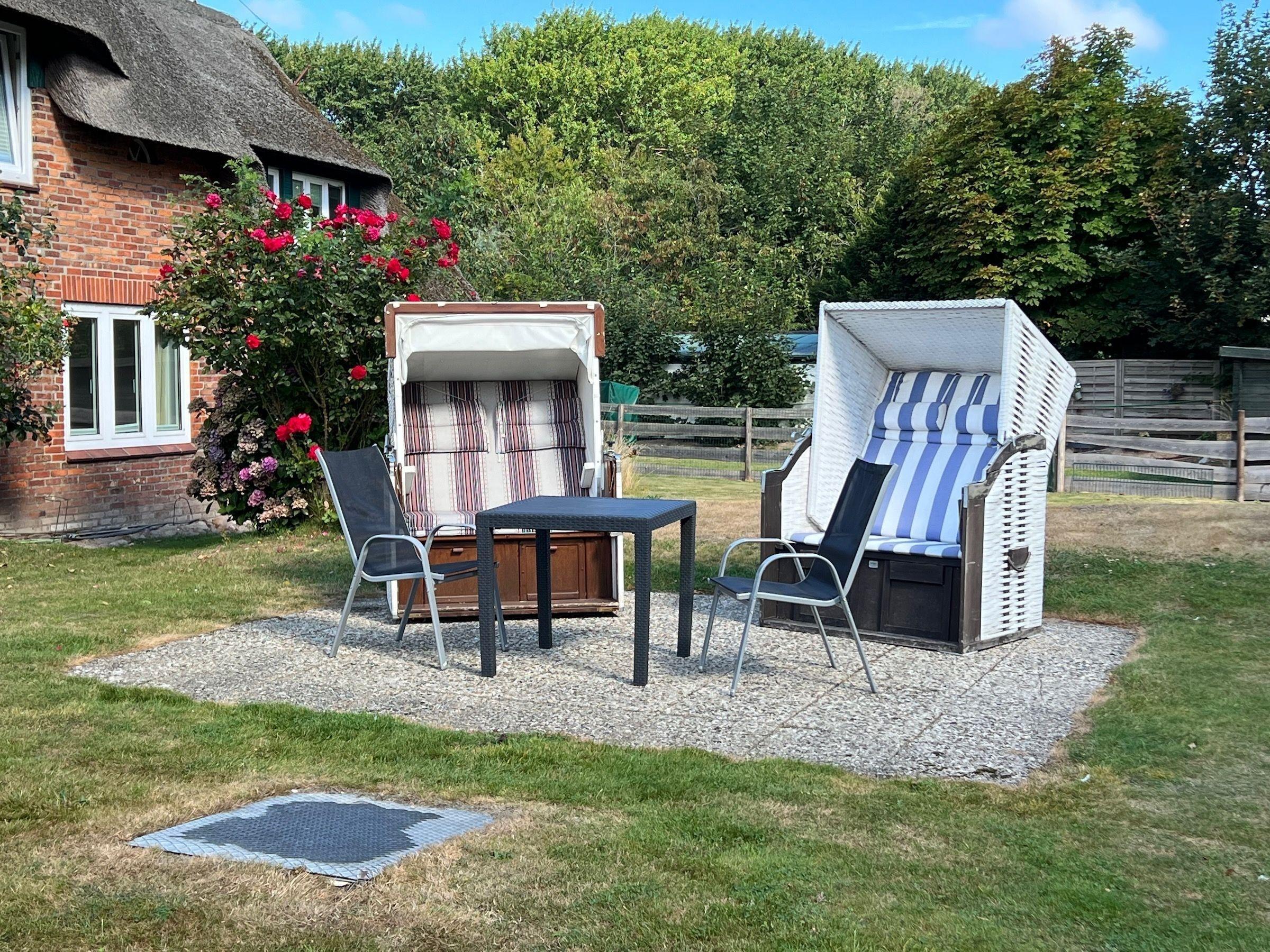 Es steht eine Terrasse mit einem Strandkorb, sowie Gartenstühle und einem Gartentisch zur freien Benutzung bereit. Ausreichend Parkplätze sowie eine Unterstellmöglichkeit für Fahrräder sind ebenfalls vorhanden.