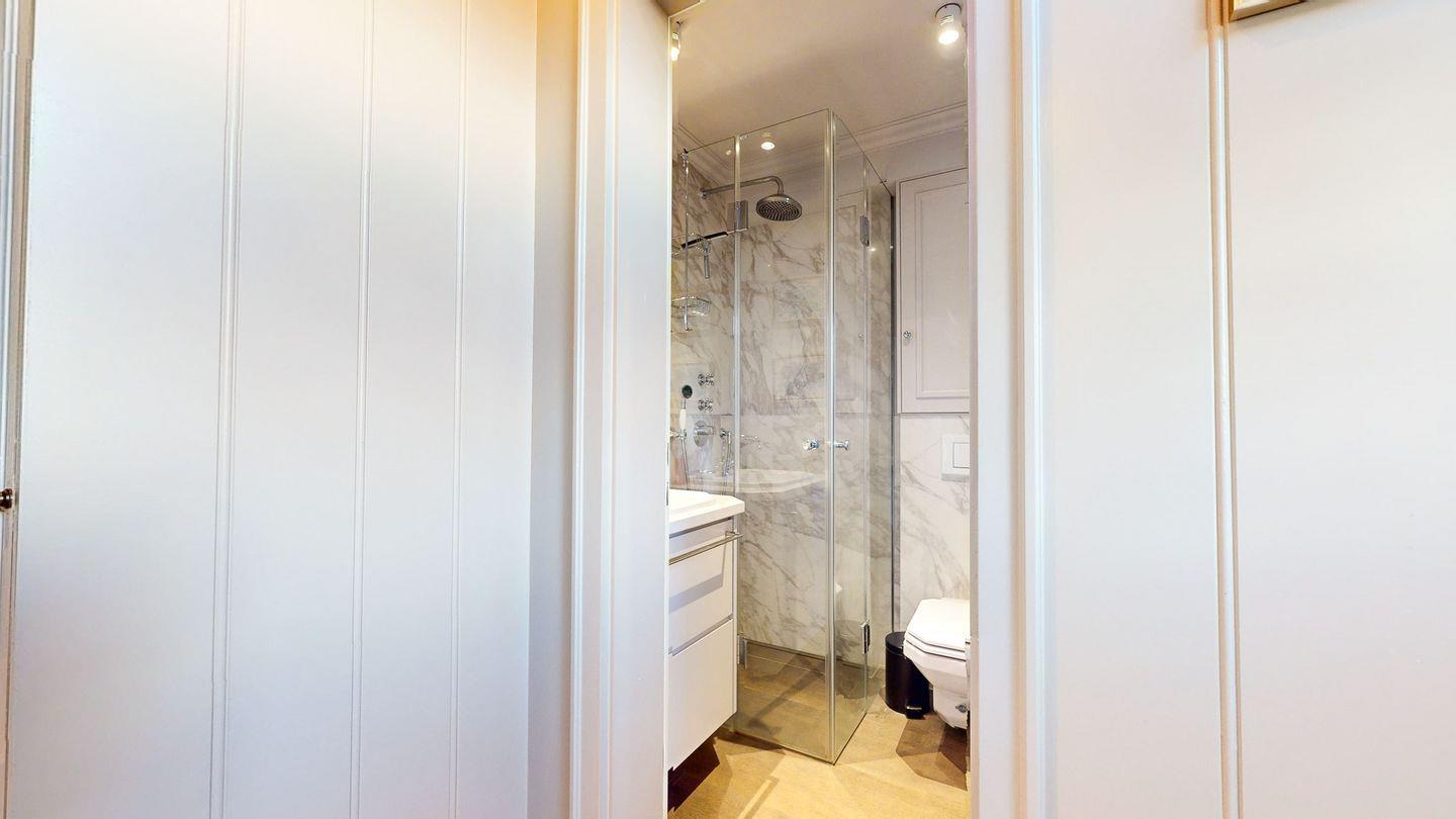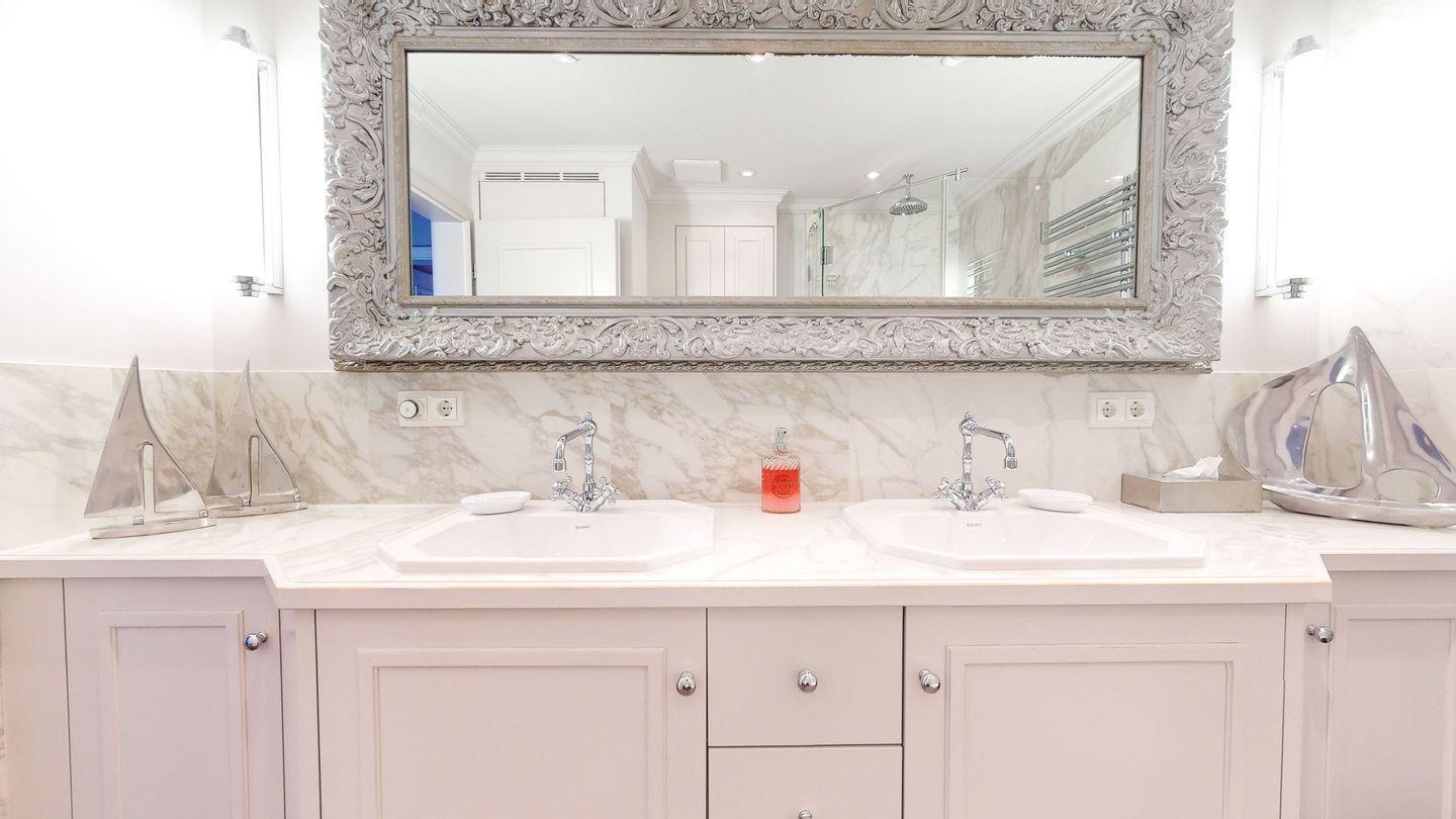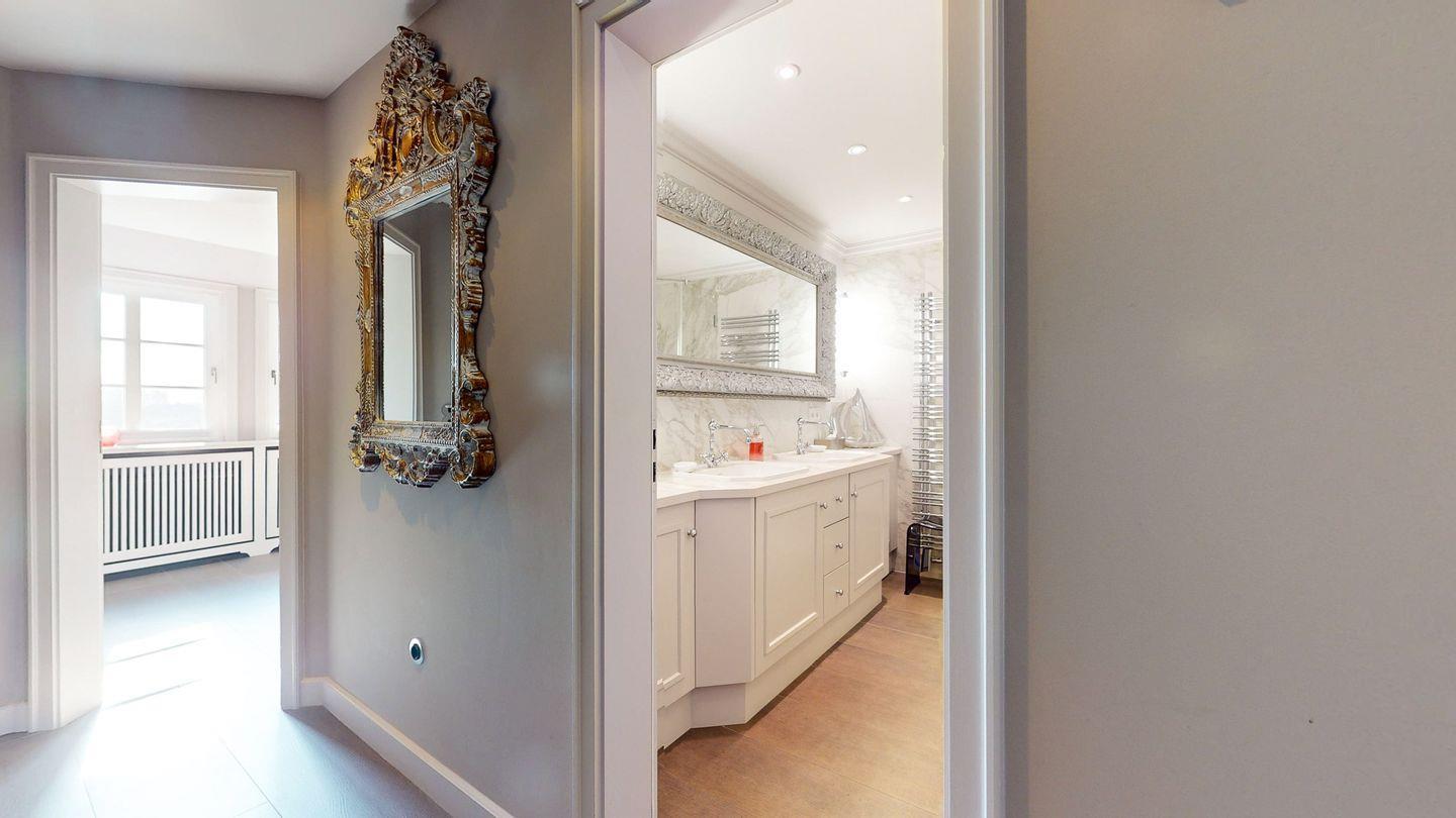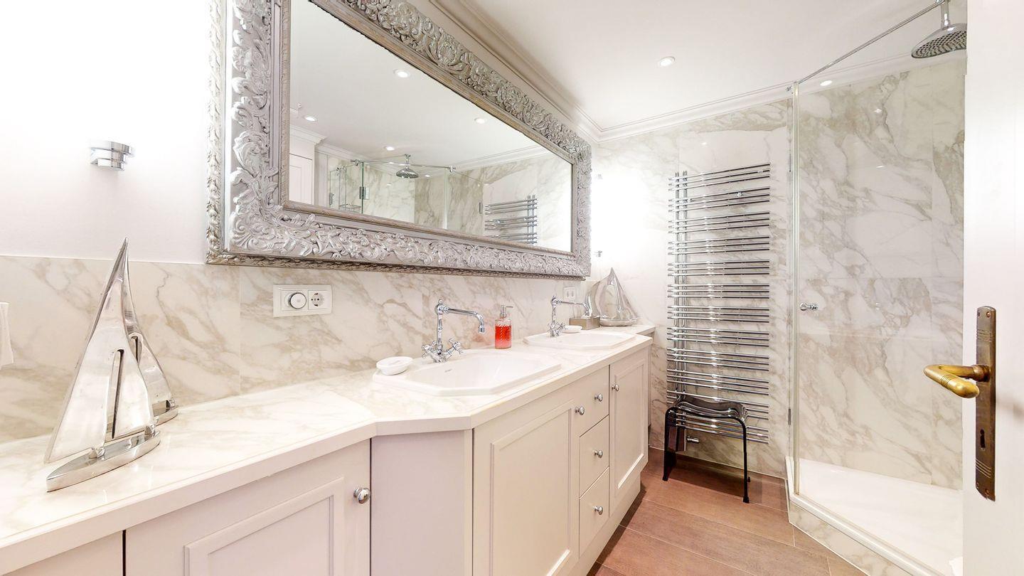 Badezimmer mit großzügiger Regendusche und Doppelwaschtisch. Der zweite