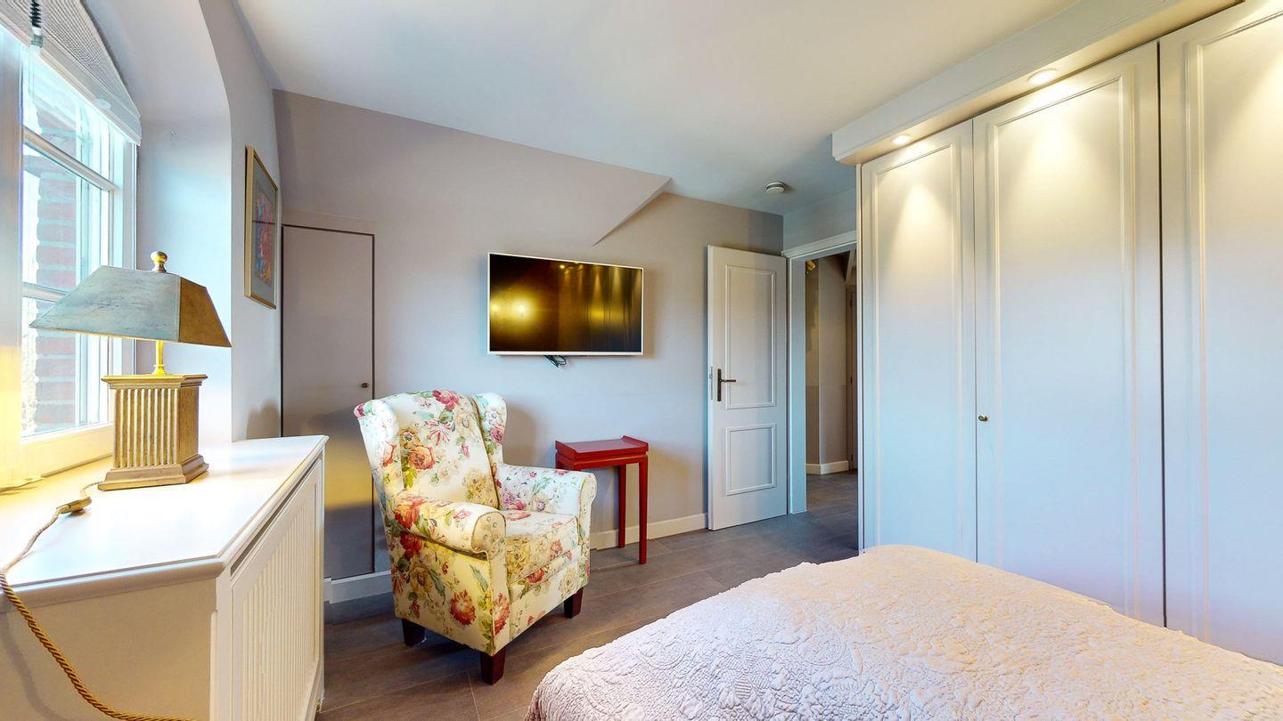Im ersten Obergeschoss wartet ein gemütlicher Schlafbereich mit einem Einzelbett, hochwertigen Einbauschränken und TV direkt angrenzendem innenliegendem