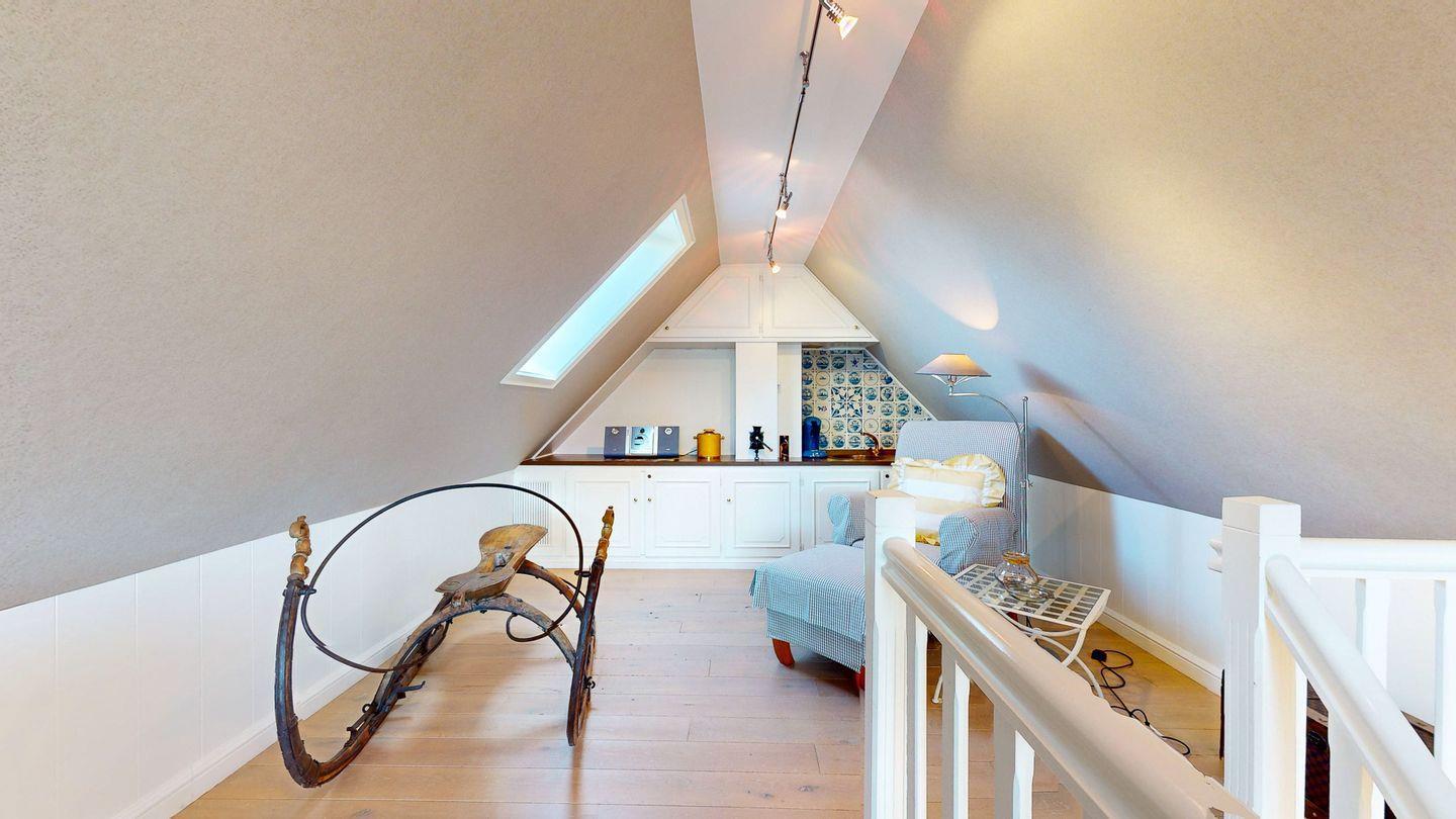 In der ersten Etage warten die zwei großzügigen Schlafzimmer auf Sie. Das Hauptschlafzimmer besticht mit einem Doppelbett, Einbauschränken und hochwertigem Sessel, das zweite Schlafzimmer verfügt über zwei gemütliche Kojenbetten und eine hochwertige Sitzgelegenheit. Auch die separate Landhausküche bietet viel Komfort für einen erholsamen Urlaub und lädt zu