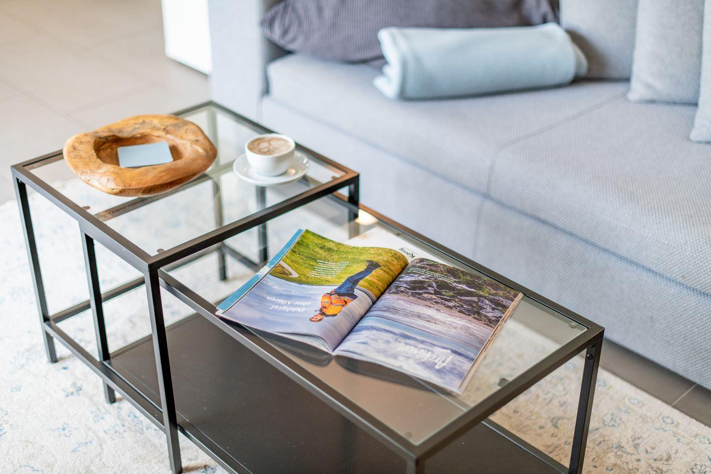 Der offen gestaltete Wohnbereich lädt mit seinem stilvollen Interieur und einer behaglichen Atmosphäre zum Verweilen ein. Genießen Sie entspannte Abende auf dem bequemen Sofa oder lassen Sie den Tag bei einem gemeinsamen Essen im angrenzenden Essbereich ausklingen. Große Fenster sorgen für viel Tageslicht und einen herrlichen Blick ins Grüne.