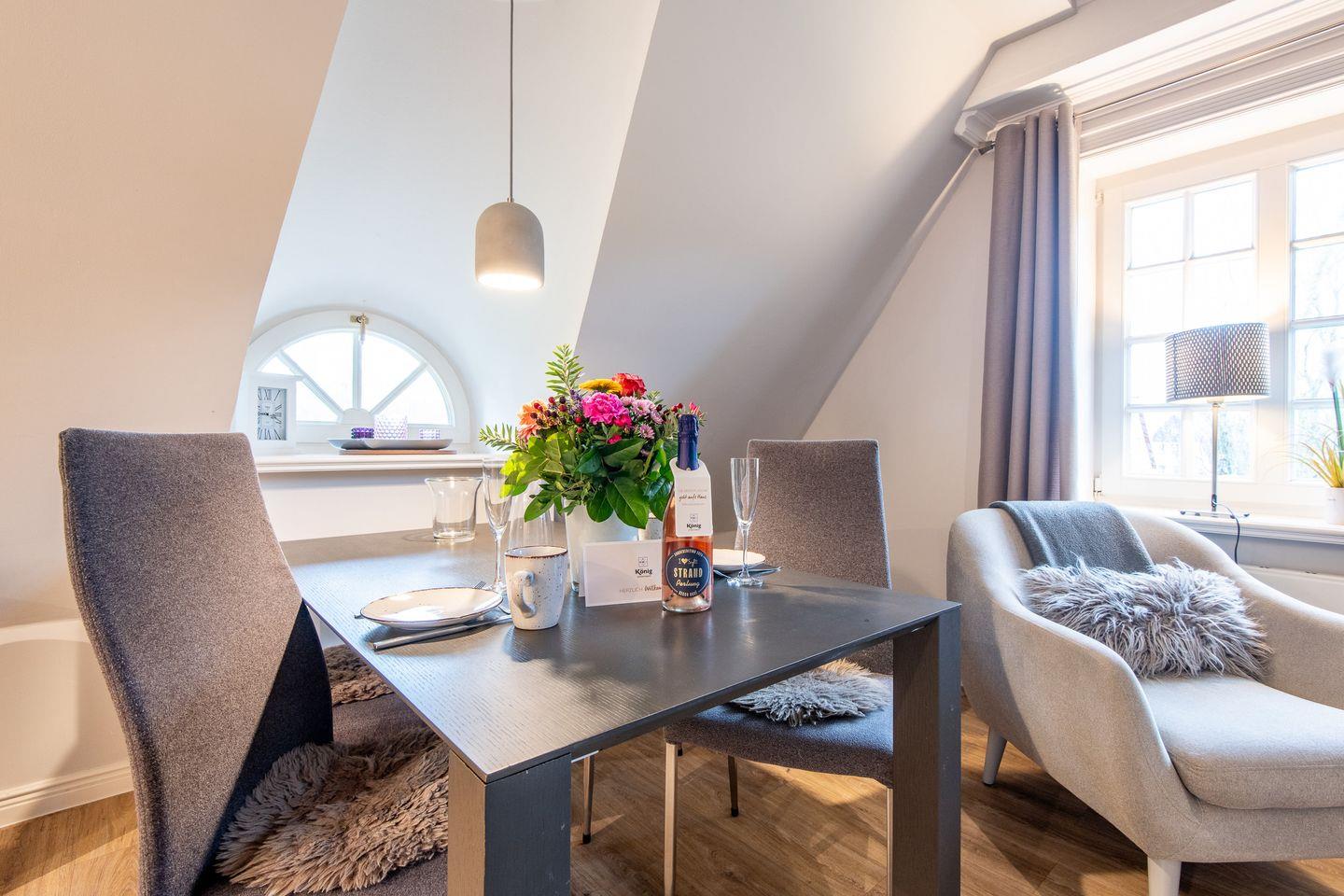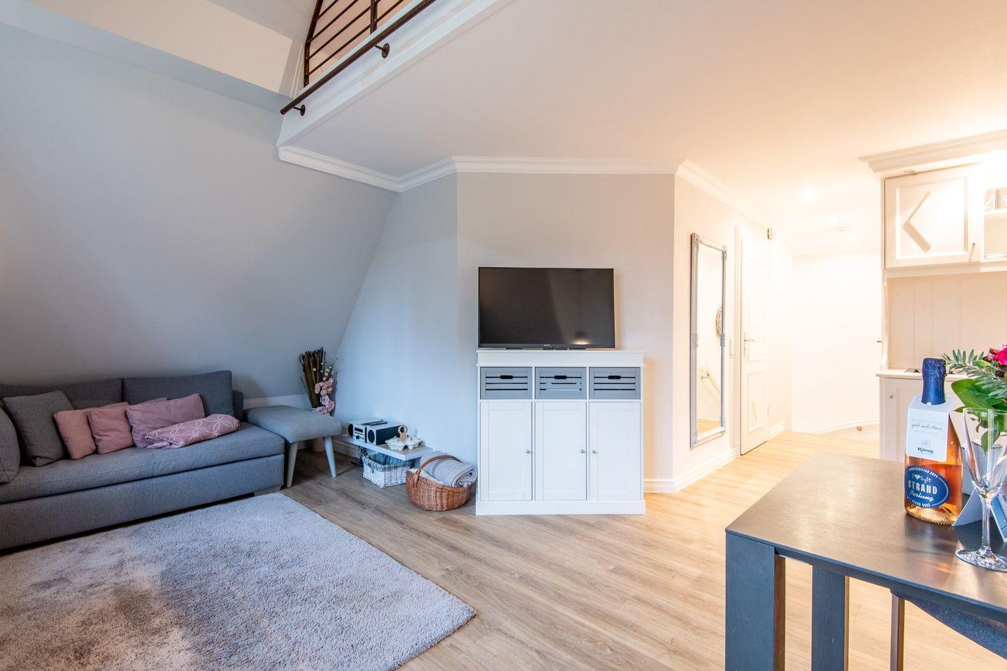 Der gemütliche Wohnbereich lädt mit seiner offenen Galerie und einer geschmackvollen Einrichtung zum Verweilen ein. Ob entspannte Lesestunden oder gemeinsame Abende bei einem Glas Wein – hier können Sie Ihren Urlaub in vollen Zügen genießen. Der integrierte Essbereich bietet Platz für zwei Personen und ist ideal für romantische Abende oder ein ausgiebiges Frühstück mit Blick auf die Sylter Natur.