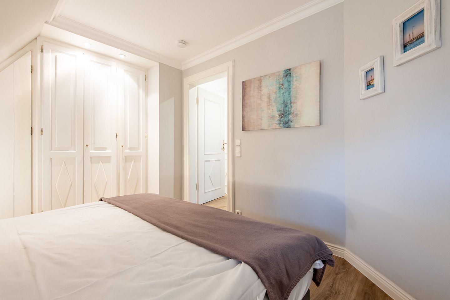 Das Schlafzimmer verfügt über ein komfortables Doppelbett und sorgt mit hochwertigen Materialien für erholsame Nächte. Viel Stauraum und ein durchdachtes Lichtkonzept machen diesen Raum zu einem Rückzugsort zum Wohlfühlen.