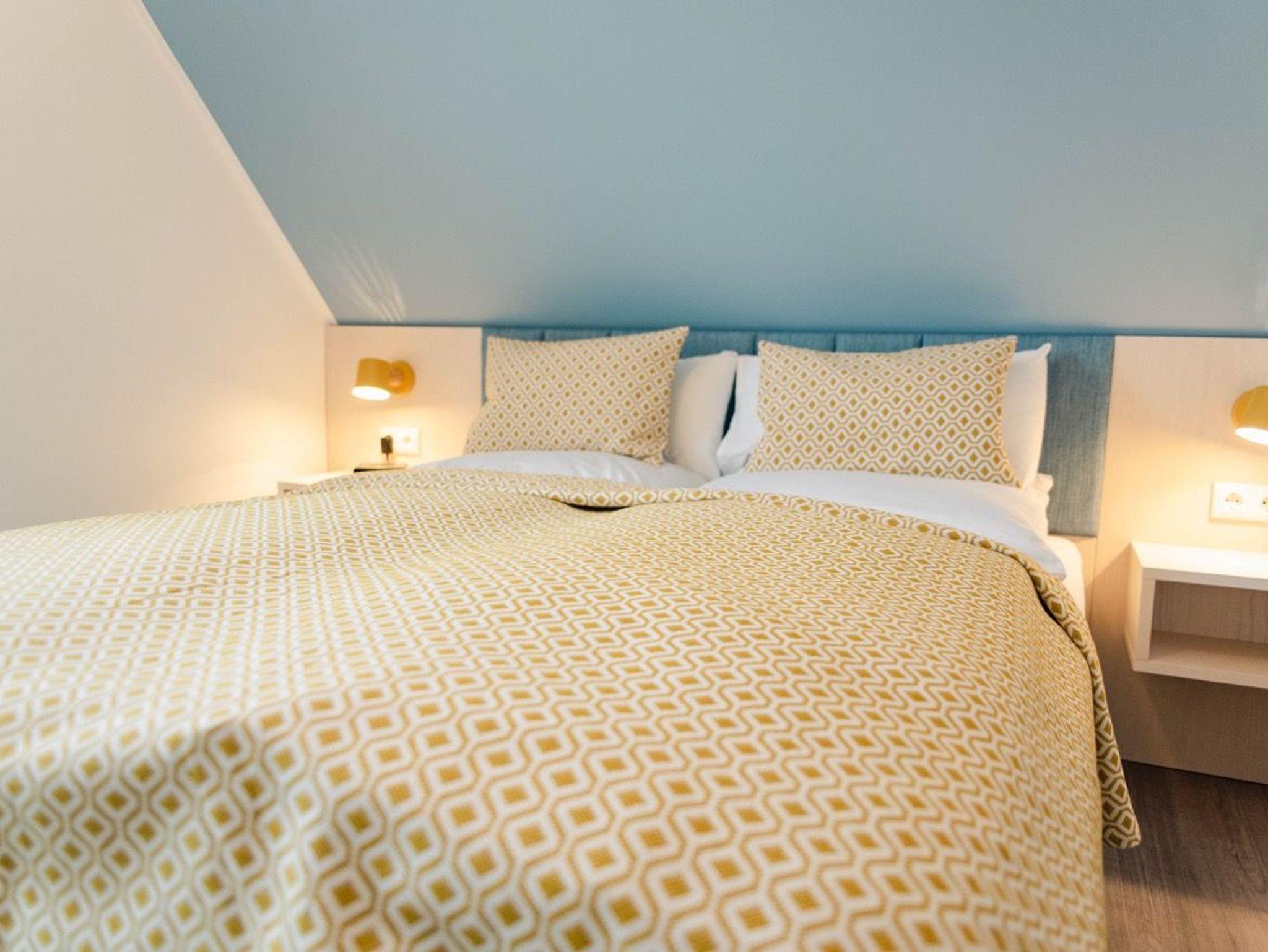 Die modern eingerichteten Doppelhaushälften für bis zu vier Personen erstrecken sich über zwei Ebenen. Ein offener Koch-/Wohn- und Essbereich mit Anschluss an die Terrasse sowie ein Gäste WC und ein praktischer Abstellraum befinden sich im Erdgeschoss. Das Dachgeschoss bietet zwei gemütliche Schlafzimmer und ein Bad mit WC, Dusche und zwei Waschbecken.
