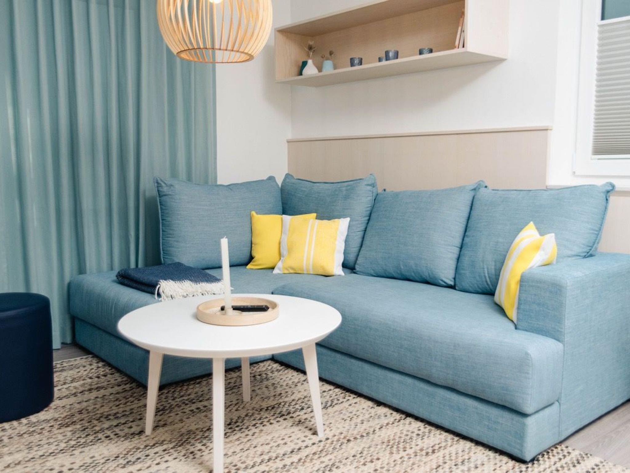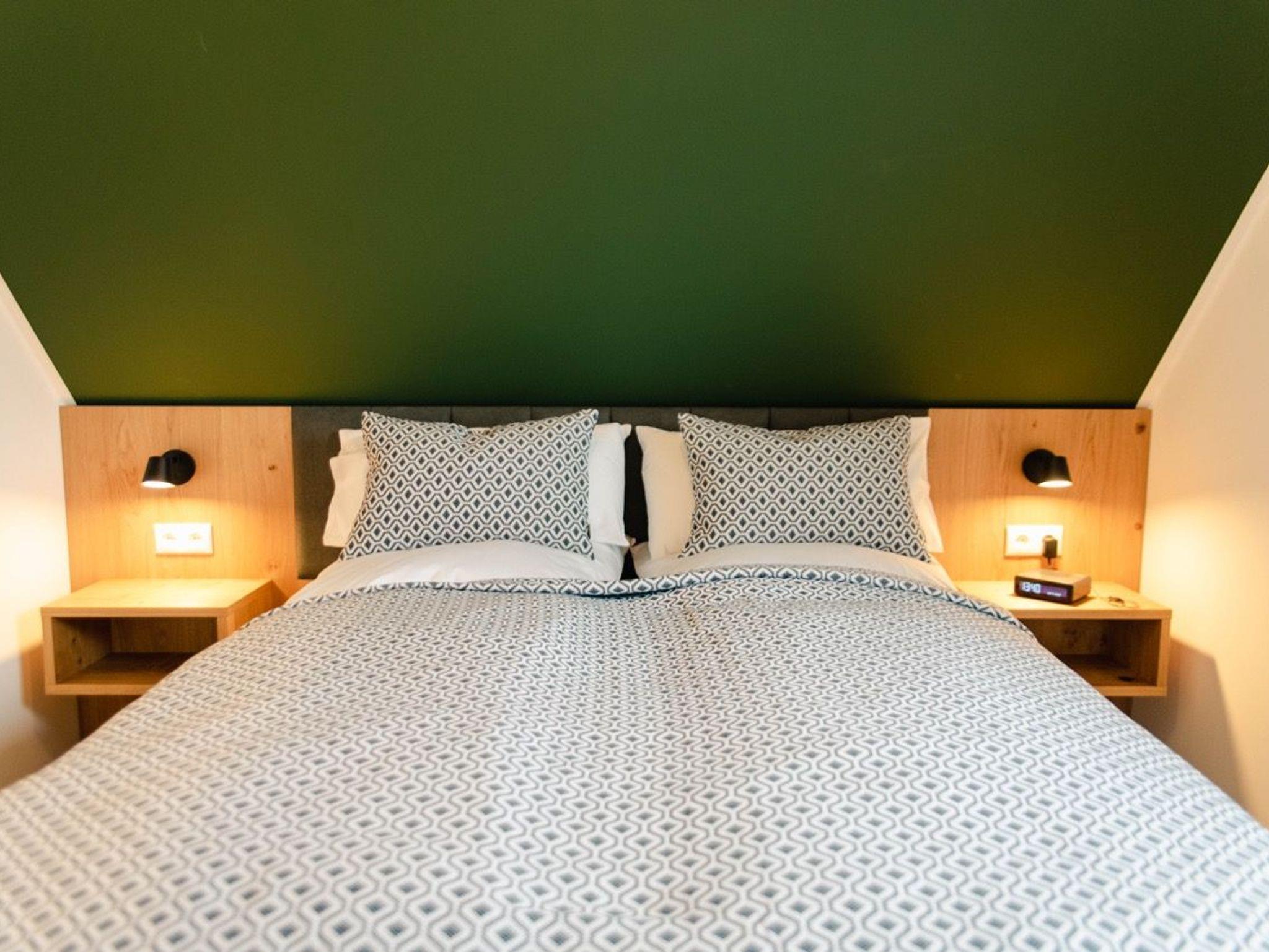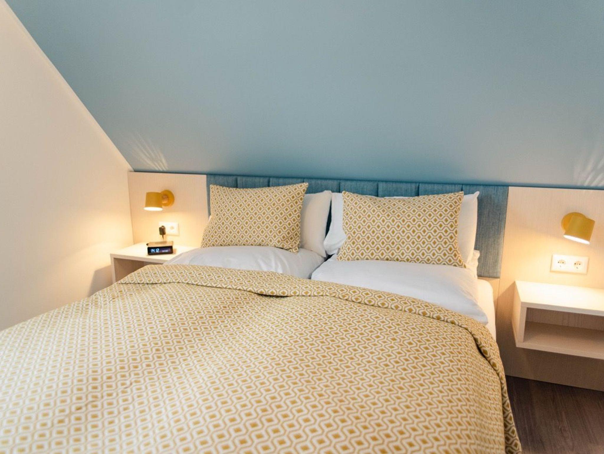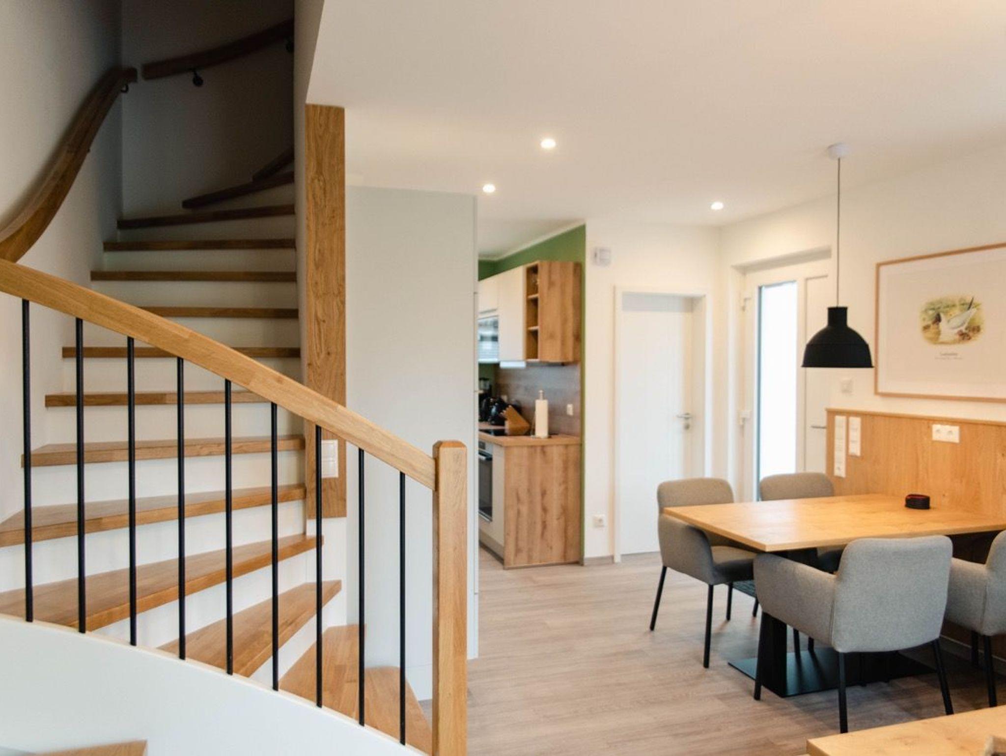 Die modern eingerichteten Doppelhaushälften für bis zu vier Personen erstrecken sich über zwei Ebenen. Ein offener Koch-/Wohn- und Essbereich mit Anschluss an die Terrasse sowie ein Gäste WC und ein praktischer Abstellraum befinden sich im Erdgeschoss. Das Dachgeschoss bietet zwei gemütliche Schlafzimmer und ein Bad mit WC, Dusche und zwei Waschbecken.