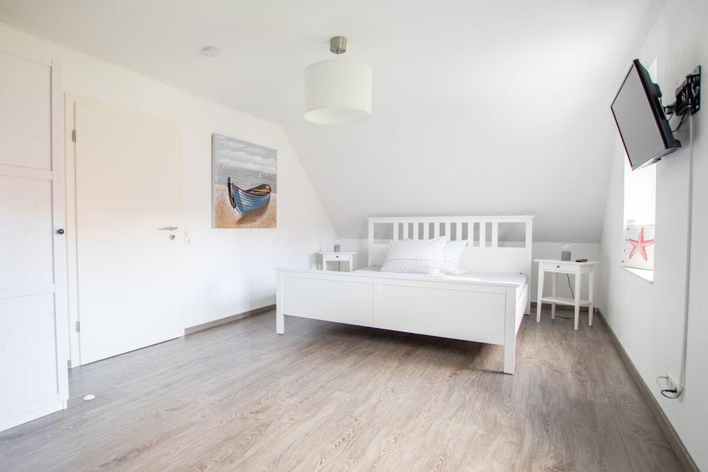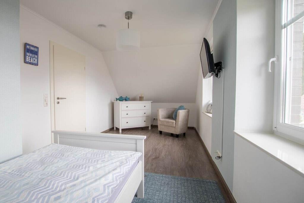 Willkommen in unserem modernen und gemütlichen Ferienhaus Strandoase am Badesee in Aurich Tannenhausen mit privater Badebucht und Sandstrand! Auf ca. 85 qm mit 3 Schlafzimmern, 1 Badezimmer und 1 Wohnzimmer finden bis zu 5 Gäste Platz. Der große Garten lädt zu Aktivitäten und zur Entspannung ein. Im Erdgeschoss befindet sich ein geräumiges Schlafzimmer mit Doppelbett, das moderne Duschbad/ WC sowie der großzügige Wohnraum mit offener Küche. Die Küche ist mit allem ausgestattet, was so gebraucht wird (z.B. E-Herd mit Ceranfeld, Backofen, Geschirrspüler, Kaffeemaschine). Neben dem Eingang befindet sich ein kleiner Hauswirtschaftsraum mit Waschmaschine und nützlichen Utensilien. Über die Treppe im Wohnzimmer geht es in die 1. Etage. Dort warten zwei weitere großzügige Schlafräume, davon ein Raum mit einem Einzelbett. Alle Zimmer sind modern und stilvoll eingerichtet; sie verfügen über TV, Rollos und WLAN. Der große Garten mit möblierter Terrasse bietet viel Platz für Erholung in der Natur. Zusätzlich steht ein Abstellraum für Fahrräder, Roller, etc. zur Verfügung. Die Einfahrt bietet Platz für einen Pkw. In ca. 50 Schritten erreichen Sie die private Badebucht am See (nur über ein Tor zugänglich).