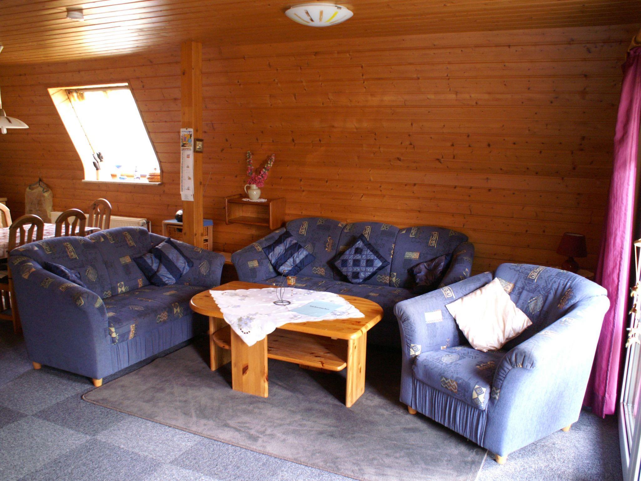Zwei Schlafräume (einer mit Doppelbett, der andere mit zwei Einzelbetten) und Abstellflächen befinden sich im Dachgeschoss. Ein zusätzliches Gäste-bzw. Kinderbett kann aufgestellt werden. Das Haus ist komplett und geschmackvoll eingerichtet. Das Haus ist mit einer Zentralheizung versehen. Die Wasserversorgung und die Abwasserbeseitigung erfolgen zentral.