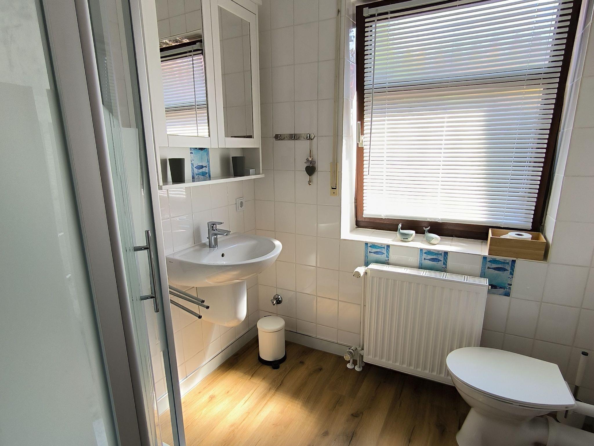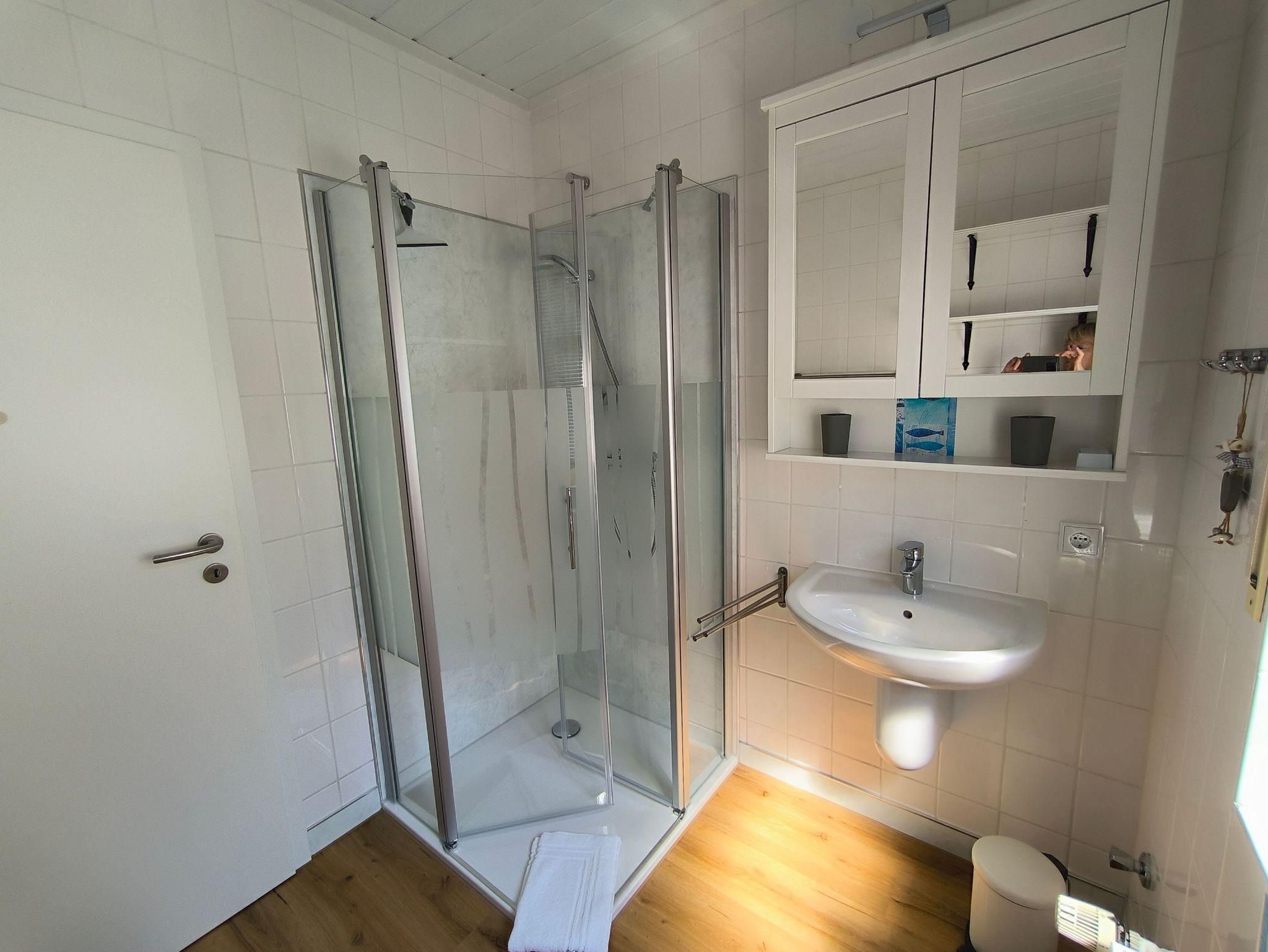 Zur Wohnung gehören ein helles Badezimmer mit Tageslicht. Hier befinden sich eine ebenerdige Dusche, ein Waschbecken mit Spiegelschrank und ein WC.