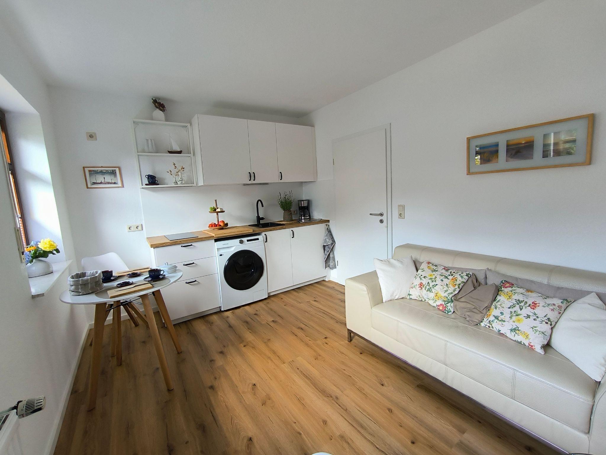 Im Wohnbereich finden sie einen gemütlichen Essplatz am Fenster, eine gut ausgestattete Küchenzeile mit Waschmaschine