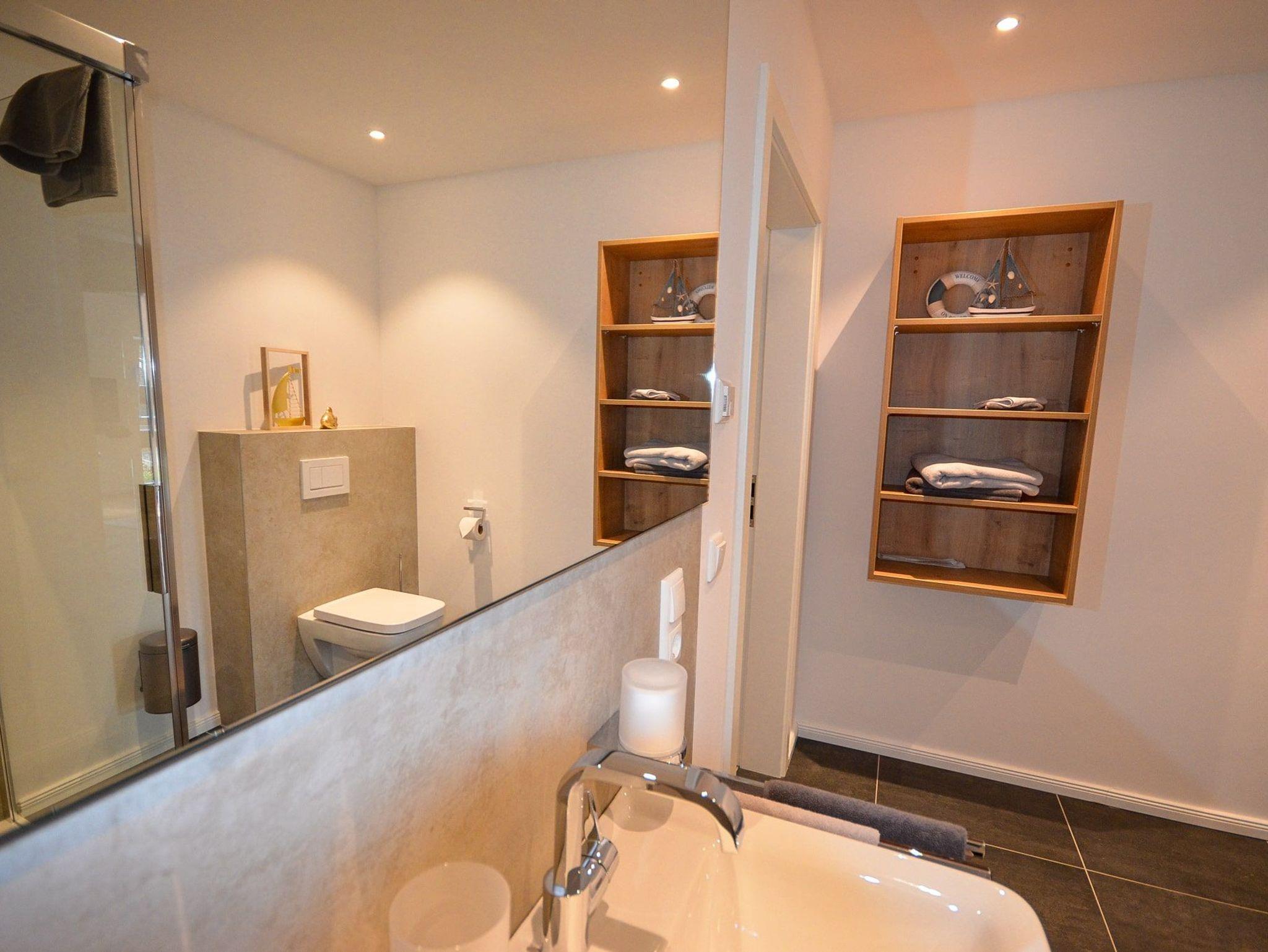 Das Bad hat eine ebenerdige, verglaste Dusche (140 x 100 cm) mit Regendusche und Handbrause, einen Waschtisch, einen Handtuchheizkörper und ein WC sowie ausreichende Ablageflächen und ein Einbauradio.