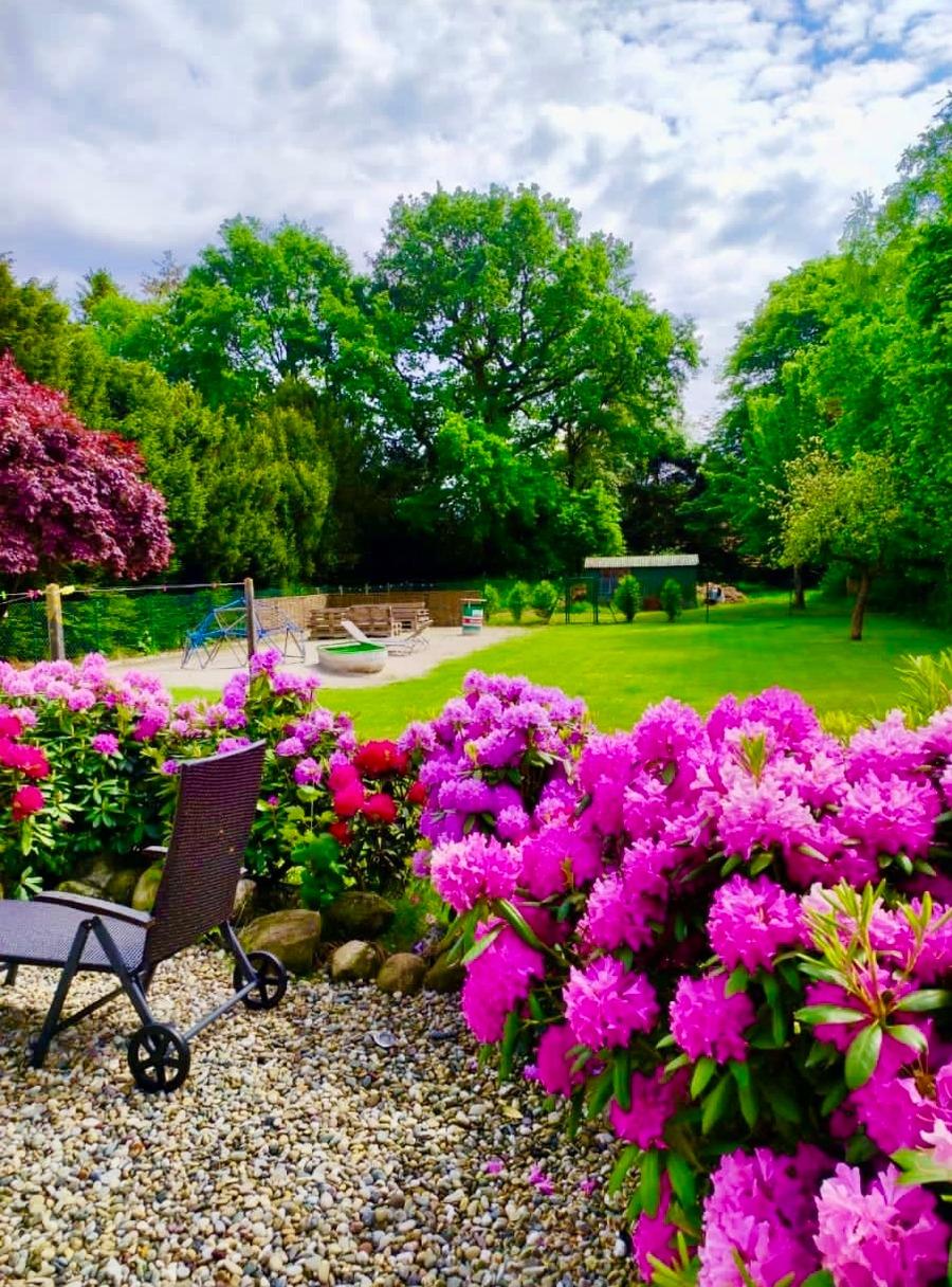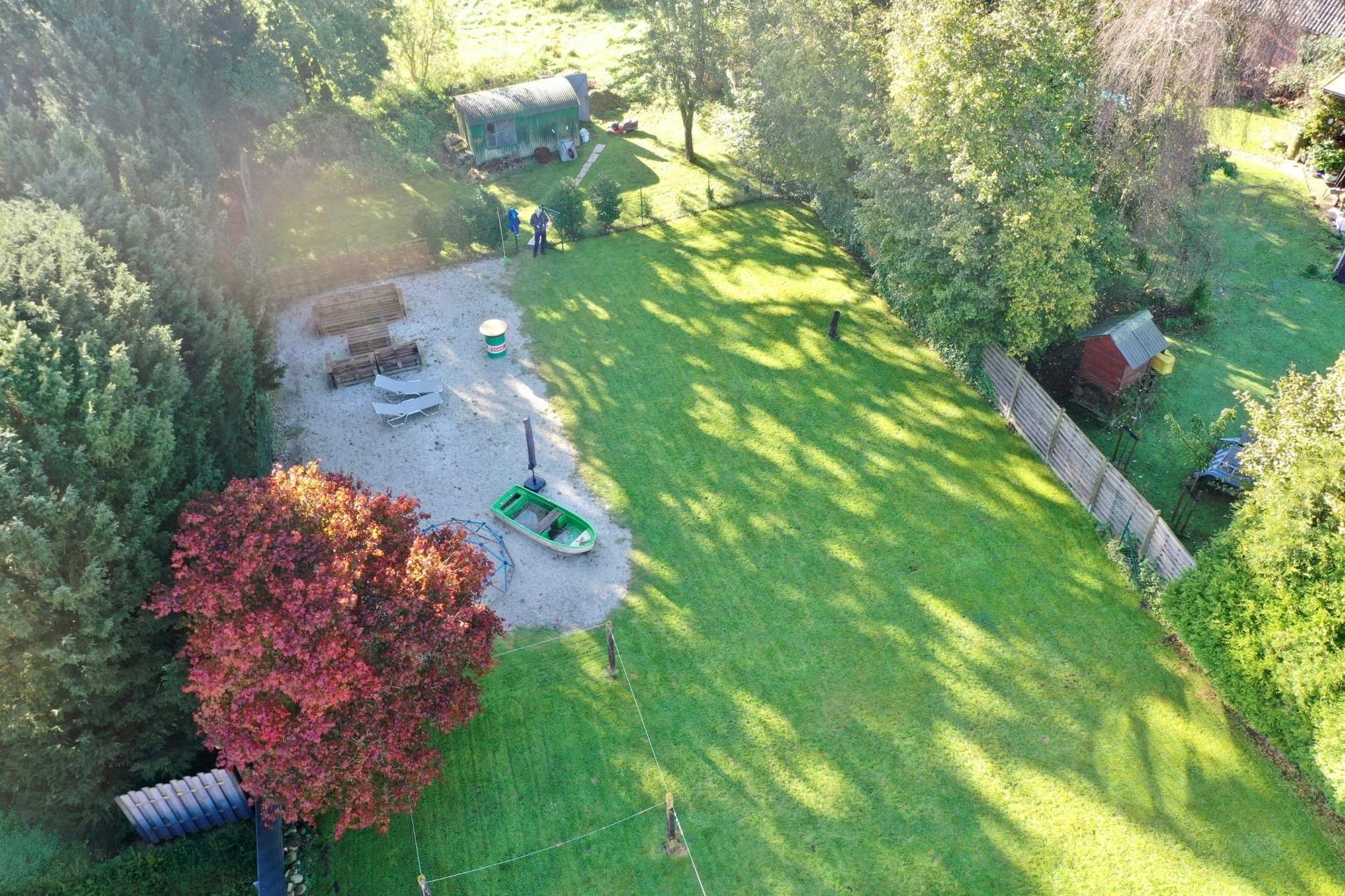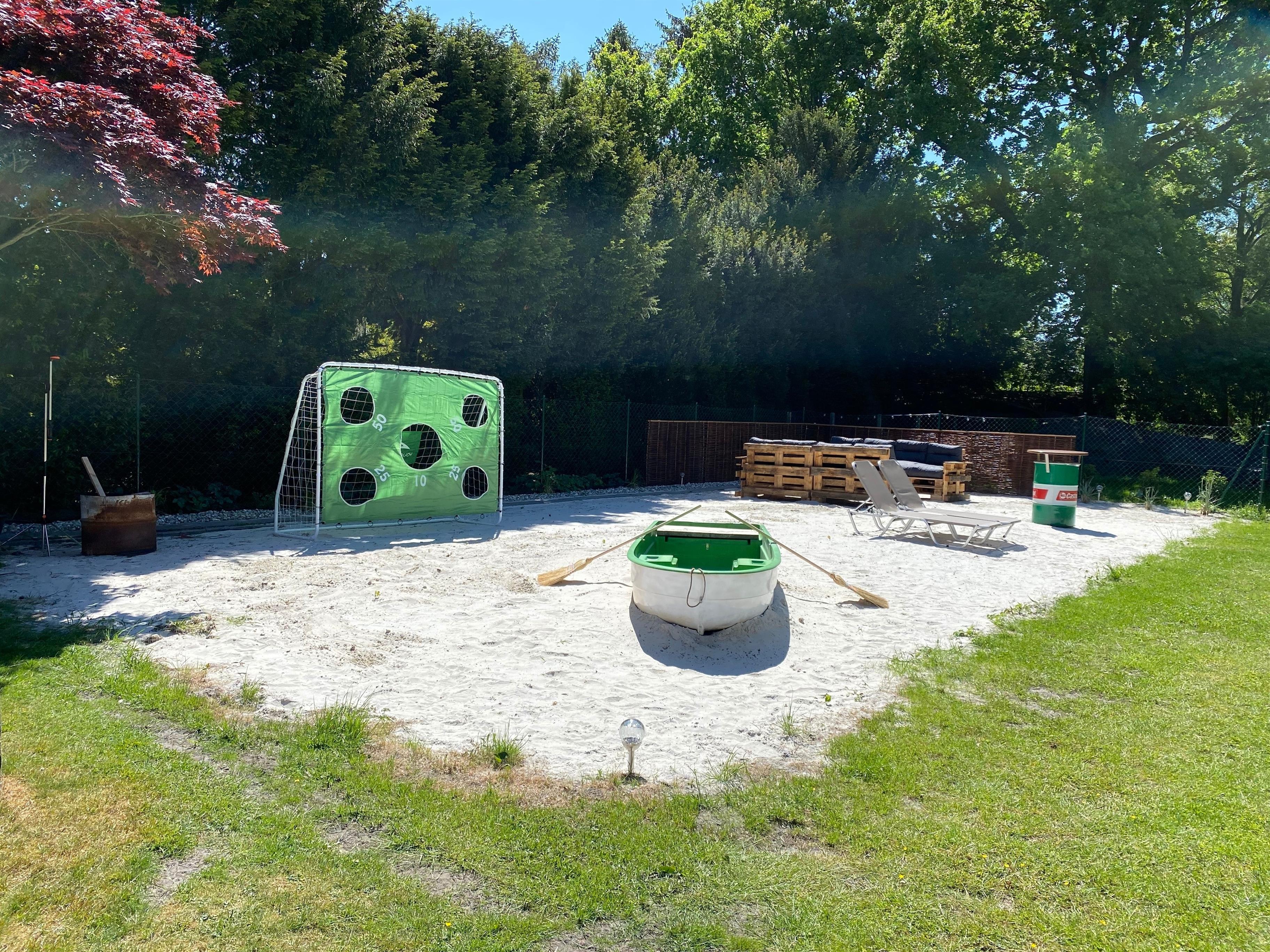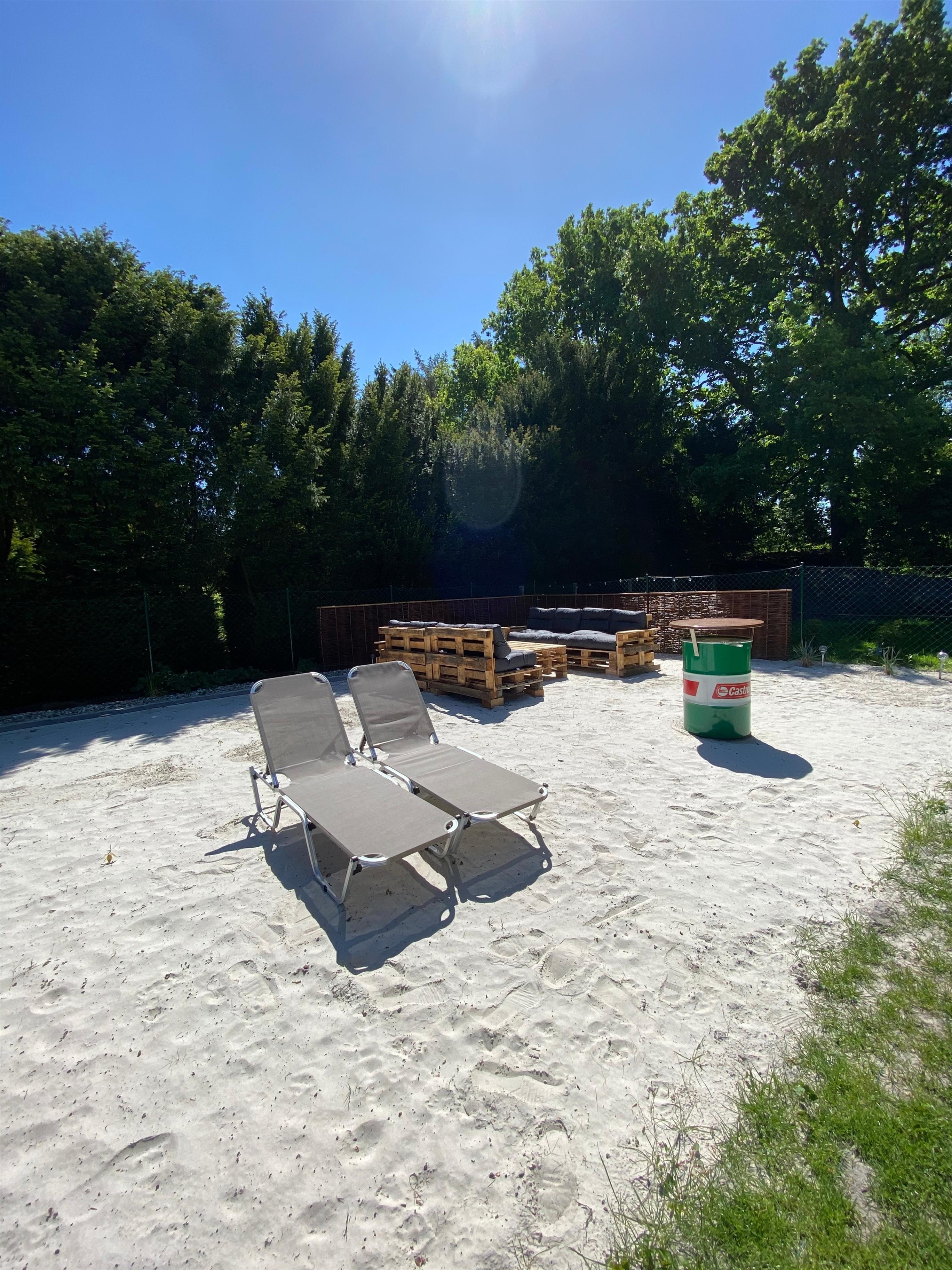 Im Garten befindet sich ein 90qm großer Gartenstrand mit Palettenmöbeln, Liegen und einer Feuerstelle.