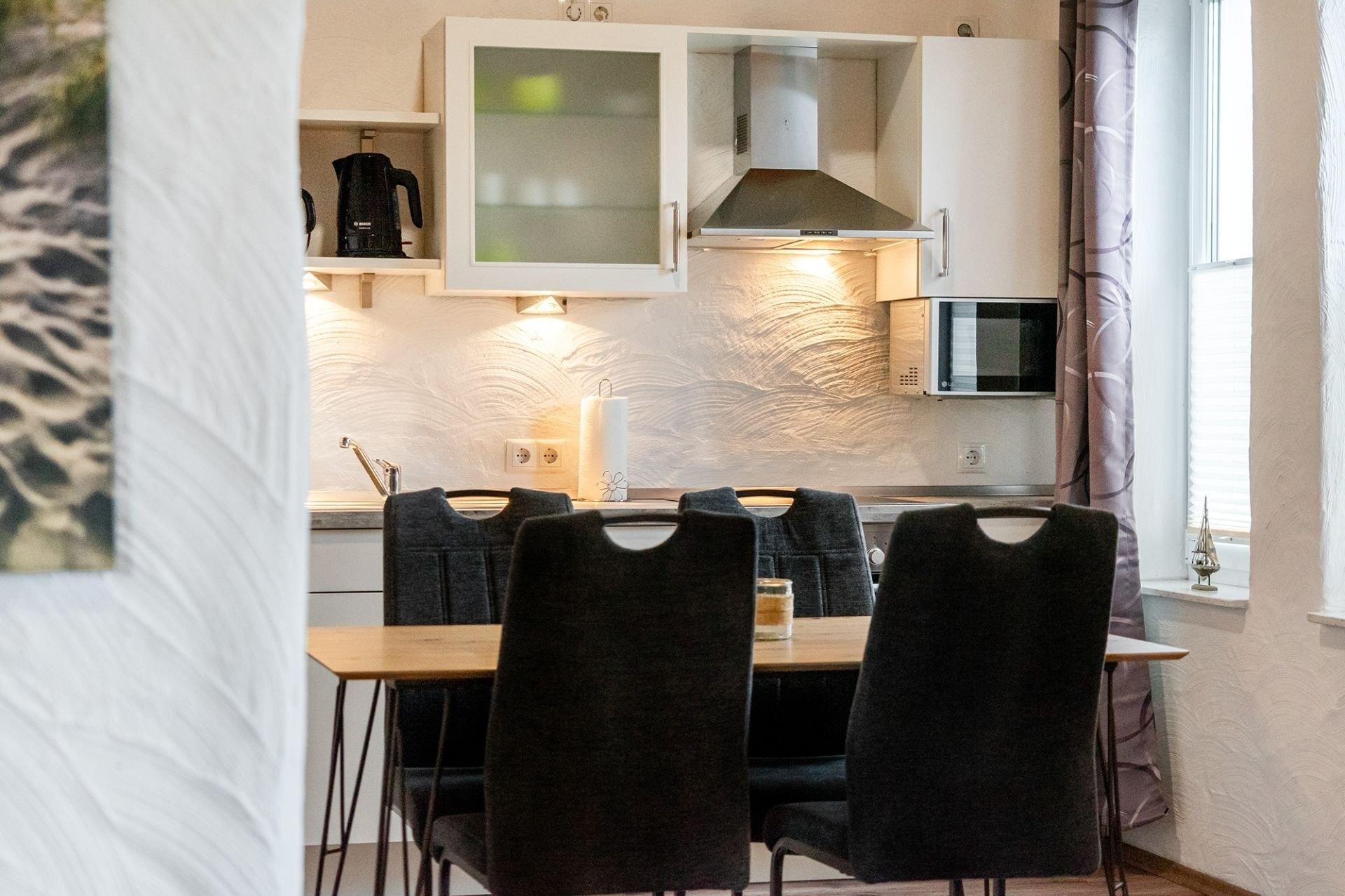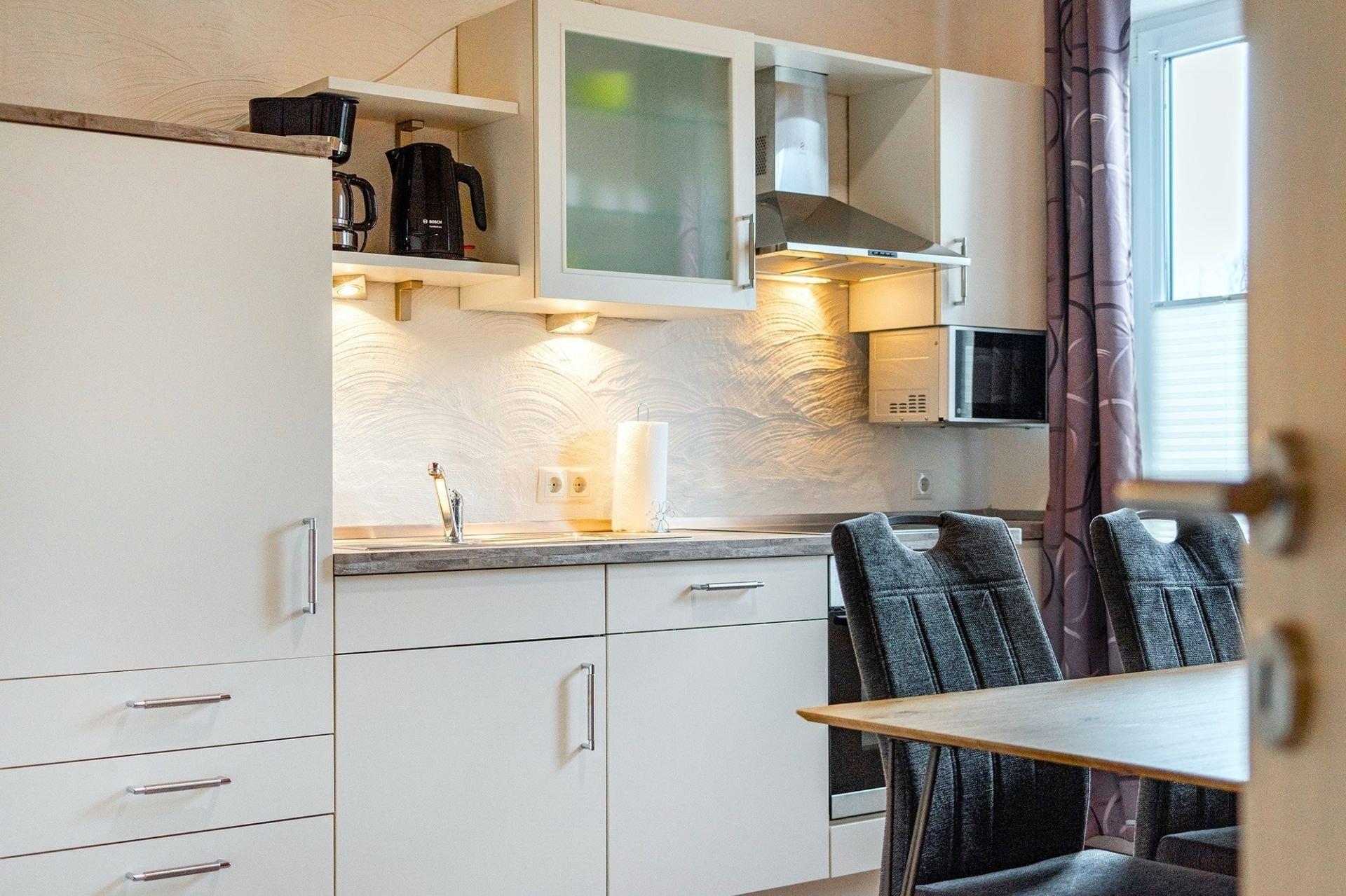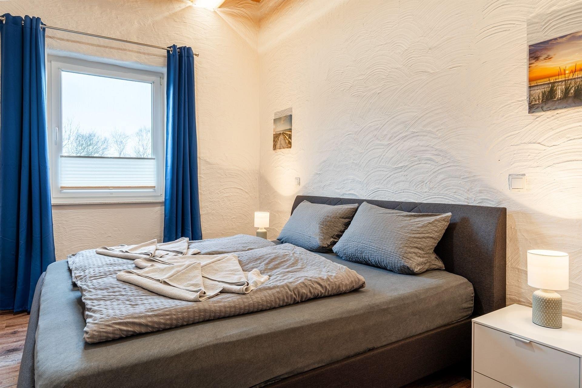 Die großzügige Ferienwohnung im Erdgeschoss verfügt über ein Schlafzimmer mit einem bequemen Doppelbett sowie einen offenen Wohnzimmer- und Essbereich, der nahtlos in eine komplett ausgestattete Küche übergeht.Der Wohnbereich ist lichtdurchflutet und großzügig gestaltet, mit einer offenen Küche, die mit hochwertigen Geräten wie Cerankochfeld, Backofen, Kühlschrank, Gefrierfach und Geschirrspüler ausgestattet ist. Zusätzlich stehen zwei vollständige Sets Geschirr und Besteck, ein Toaster und ein Wasserkocher zur Verfügung. Für Kaffeeliebhaber gibt es eine klassische Kaffeemaschine. Ein geräumiger Esstisch lädt zu gemeinsamen Mahlzeiten oder geselligen Spielabenden ein. Eine gemütliche Couch, ein Smart-TV und eine moderne Einrichtung garantieren einen erholsamen Aufenthalt. Große Fenster sorgen für eine angenehme Atmosphäre und bieten direkten Zugang zur Terrasse und dem Garten.Das Schlafzimmer ist liebevoll gestaltet und mit einem hochwertigen Bett (180x200) ausgestattet, das mit kuscheligen Bettwaren für erholsamen Schlaf sorgt. Ein geräumiger Kleiderschrank und ein Nachttisch mit Lampe vervollständigen die Ausstattung.Das Badezimmer ist komfortabel und geräumig, mit einer modernen Dusche und WC ausgestattet.Eine Waschmaschine und ein Trockner stehen gegen Gebühr im angrenzenden Haus im zweiten Stockwerk zur Verfügung. Zusätzlich gibt es einen abschließbaren Abstellraum für Fahrräder und E-Bikes mit Ladestationen.Die Zufriedenheit und das Wohlbefinden unserer Gäste, insbesondere Familien, liegen uns sehr am Herzen. Auf Wunsch stellen wir gerne kostenfreie Babybetten mit passender Bettwäsche, Wickelkommoden, Babybadewannen, Rausfallschutz und Tritthocker zur Verfügung, um den Aufenthalt für Eltern und ihre Kleinen so angenehm wie möglich zu gestalten.Darüber hinaus bieten wir in unserem Abstellraum kostenfrei Bollerwagen zur Ausleihe an, damit Familien bequem ihre Ausflüge in die Umgebung oder zum nahegelegenen Strand unternehmen können. Unsere Gäste sollen sich bei uns wie zu Hause fühlen und einen unbeschwerten Urlaub genießen können, ganz gleich, ob sie als Familie oder in anderer Konstellation anreisen.
