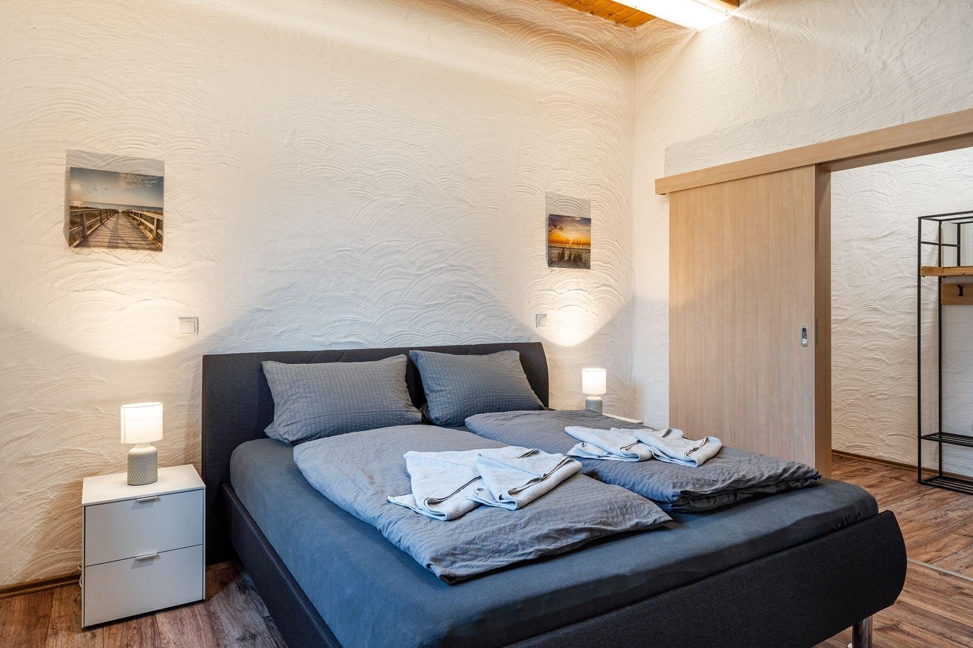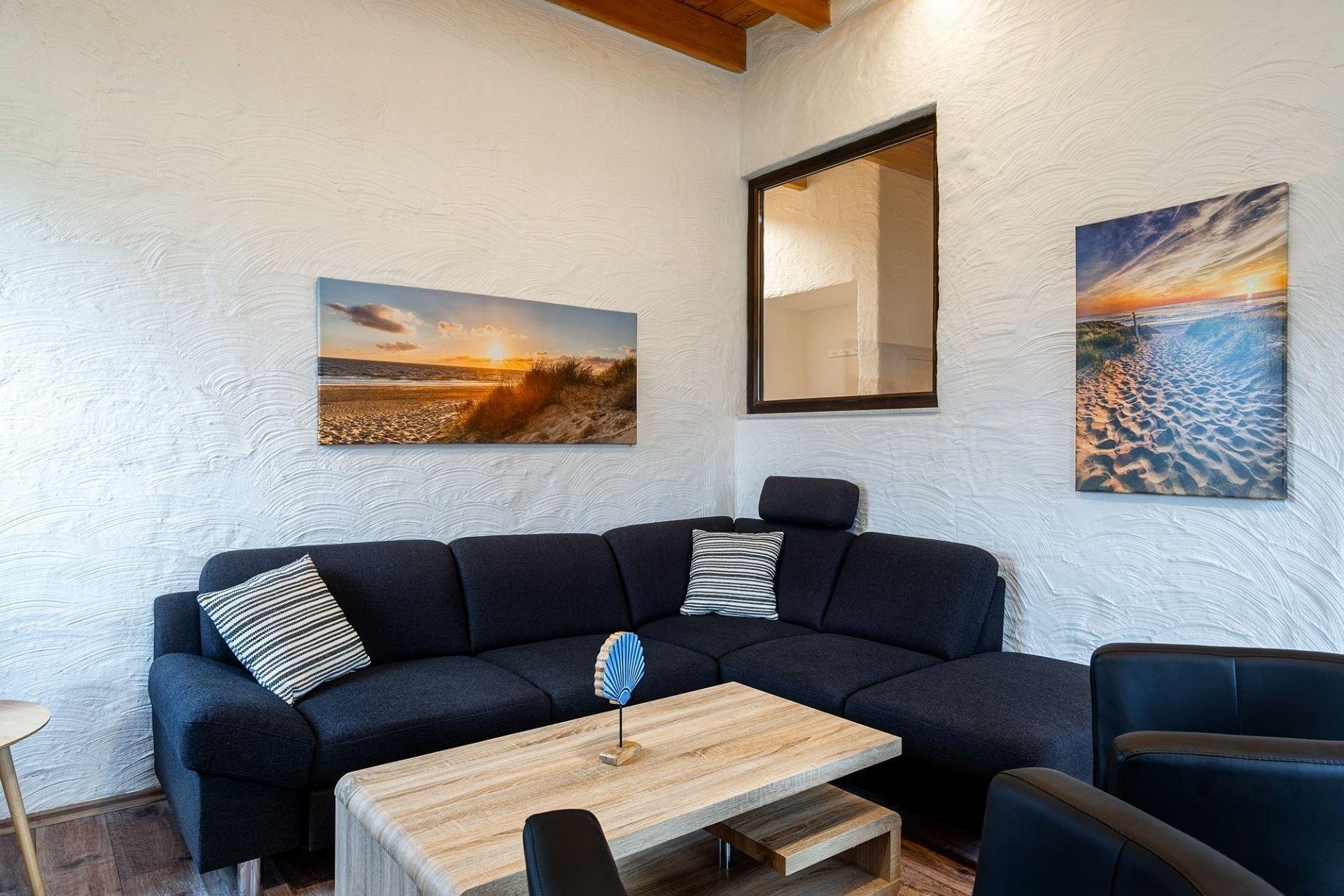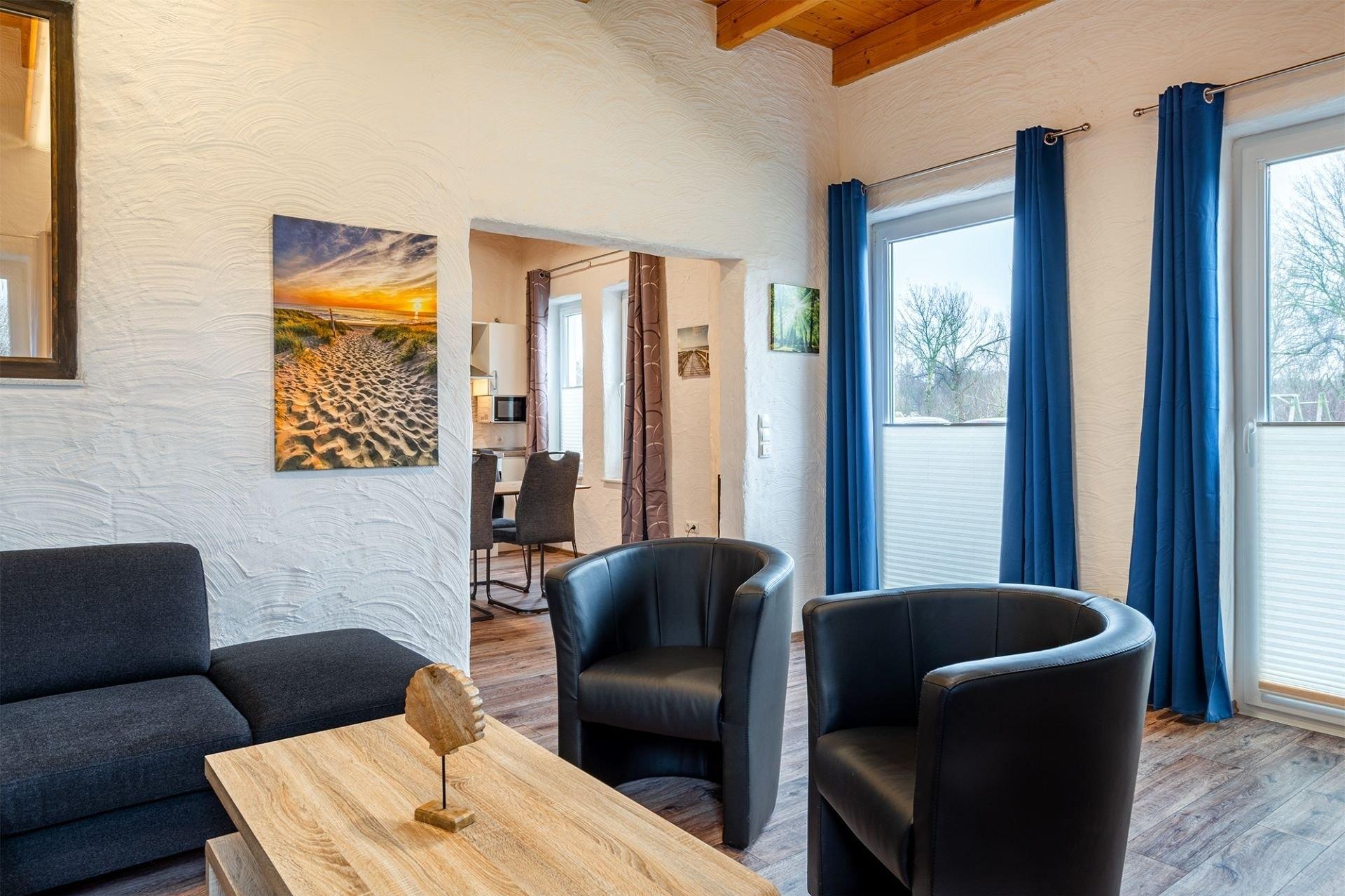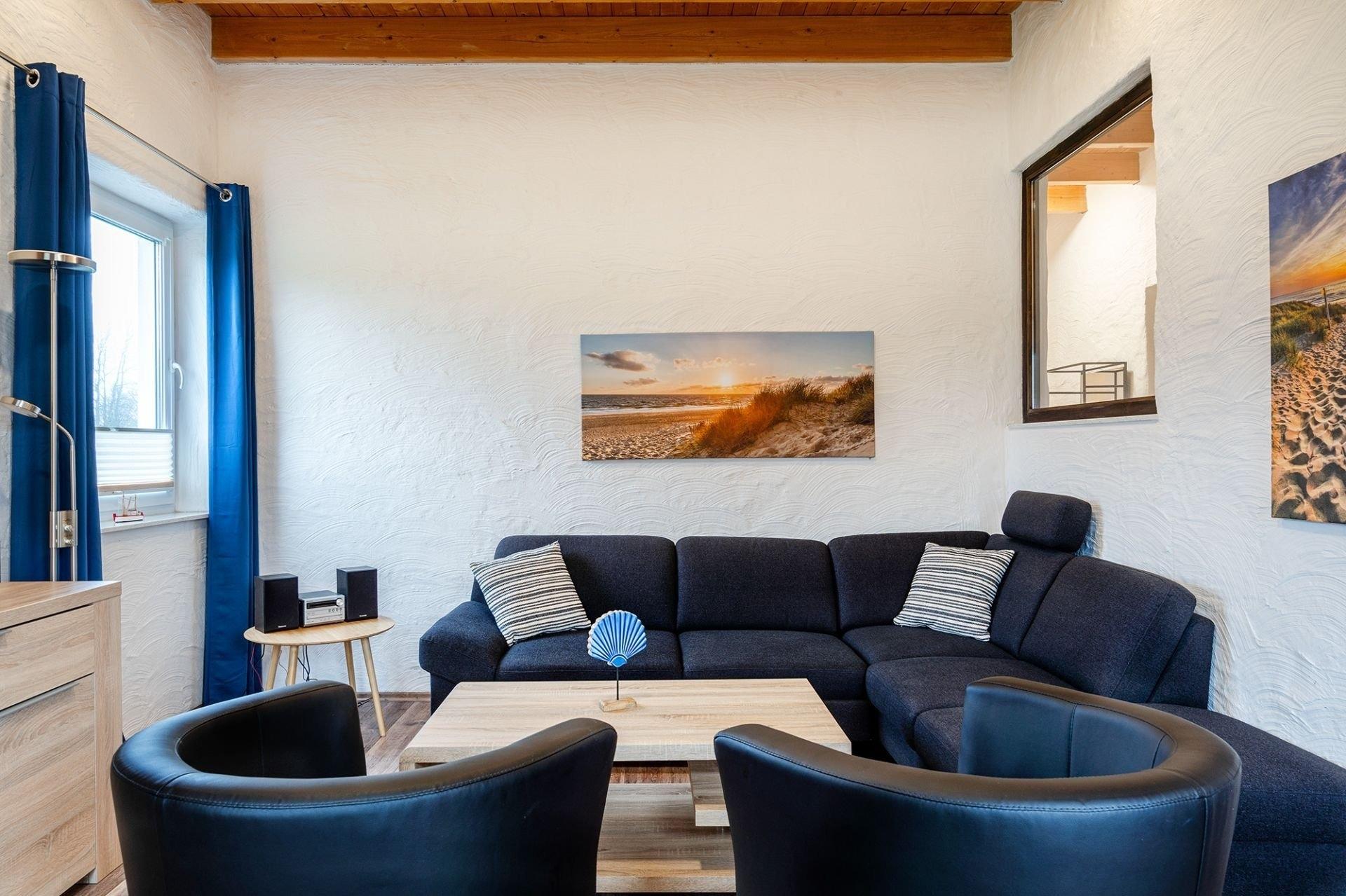 Die großzügige Ferienwohnung im Erdgeschoss verfügt über ein Schlafzimmer mit einem bequemen Doppelbett sowie einen offenen Wohnzimmer- und Essbereich, der nahtlos in eine komplett ausgestattete Küche übergeht.Der Wohnbereich ist lichtdurchflutet und großzügig gestaltet, mit einer offenen Küche, die mit hochwertigen Geräten wie Cerankochfeld, Backofen, Kühlschrank, Gefrierfach und Geschirrspüler ausgestattet ist. Zusätzlich stehen zwei vollständige Sets Geschirr und Besteck, ein Toaster und ein Wasserkocher zur Verfügung. Für Kaffeeliebhaber gibt es eine klassische Kaffeemaschine. Ein geräumiger Esstisch lädt zu gemeinsamen Mahlzeiten oder geselligen Spielabenden ein. Eine gemütliche Couch, ein Smart-TV und eine moderne Einrichtung garantieren einen erholsamen Aufenthalt. Große Fenster sorgen für eine angenehme Atmosphäre und bieten direkten Zugang zur Terrasse und dem Garten.Das Schlafzimmer ist liebevoll gestaltet und mit einem hochwertigen Bett (180x200) ausgestattet, das mit kuscheligen Bettwaren für erholsamen Schlaf sorgt. Ein geräumiger Kleiderschrank und ein Nachttisch mit Lampe vervollständigen die Ausstattung.Das Badezimmer ist komfortabel und geräumig, mit einer modernen Dusche und WC ausgestattet.Eine Waschmaschine und ein Trockner stehen gegen Gebühr im angrenzenden Haus im zweiten Stockwerk zur Verfügung. Zusätzlich gibt es einen abschließbaren Abstellraum für Fahrräder und E-Bikes mit Ladestationen.Die Zufriedenheit und das Wohlbefinden unserer Gäste, insbesondere Familien, liegen uns sehr am Herzen. Auf Wunsch stellen wir gerne kostenfreie Babybetten mit passender Bettwäsche, Wickelkommoden, Babybadewannen, Rausfallschutz und Tritthocker zur Verfügung, um den Aufenthalt für Eltern und ihre Kleinen so angenehm wie möglich zu gestalten.Darüber hinaus bieten wir in unserem Abstellraum kostenfrei Bollerwagen zur Ausleihe an, damit Familien bequem ihre Ausflüge in die Umgebung oder zum nahegelegenen Strand unternehmen können. Unsere Gäste sollen sich bei uns wie zu Hause fühlen und einen unbeschwerten Urlaub genießen können, ganz gleich, ob sie als Familie oder in anderer Konstellation anreisen.