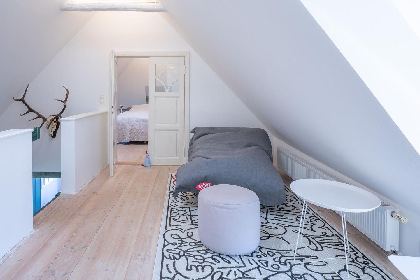 Im Obergeschoss befindet sich ein weiteres Schlafzimmer (180 x 200), ein Duschbad mit WC und auf der Empore eine Chill- und Relaxzone, in der Sie sich bequem mit einem guten Buch zurückziehen können.