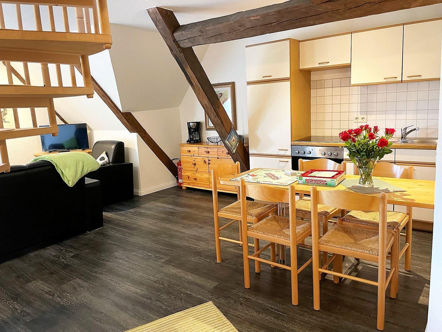 Die Wohnung verfügt über zwei gemütliche Schlafzimmer, das eine davon über eine Wendeltreppe erreichbar liegt gemütlich im Spitzboden, ideal für eine erholsame Nachtruhe. Ein modernes Badezimmer mit Dusche ermöglicht es Ihnen, sich nach einem erlebnisreichen Tag zu entspannen. Der offene Wohnbereich mit einer voll ausgestatteten Küche, die über Herd, Backofen, Spülmaschine und eine komfortable Sitzecke verfügt, ist der perfekte Ort, um gemeinsam zu essen, zu plaudern und die Zeit zu genießen. WLAN ist selbstverständlich vorhanden und sorgt dafür, dass Sie auch während Ihres Aufenthalts in Verbindung bleiben können.