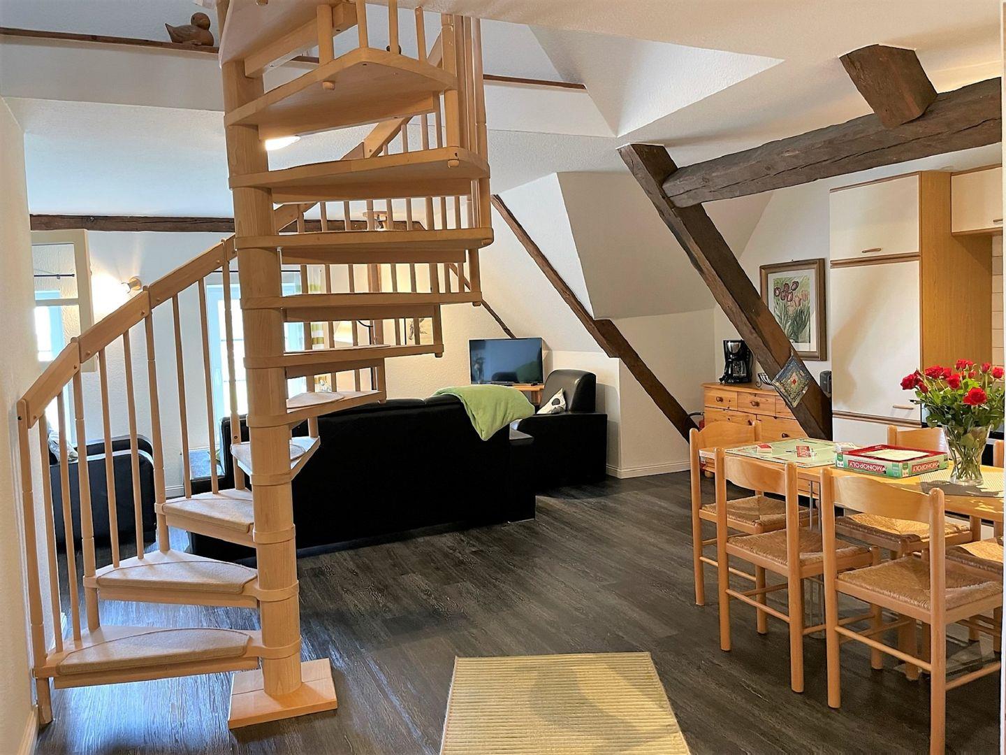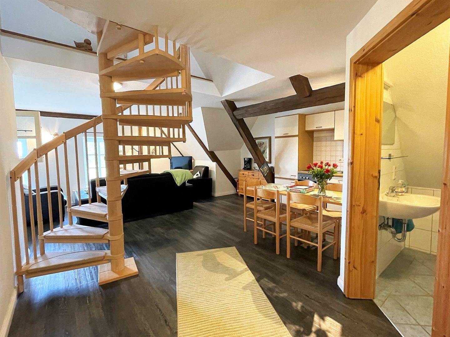 Die Wohnung verfügt über zwei gemütliche Schlafzimmer, das eine davon über eine Wendeltreppe erreichbar liegt gemütlich im Spitzboden und ist ideal für die Kinder. Ein modernes Badezimmer mit Dusche ermöglicht es Ihnen, sich nach einem erlebnisreichen Tag zu entspannen. Der offene Wohnbereich mit einer voll ausgestatteten Küche, die über Herd, Backofen und eine komfortable Sitzecke verfügt, ist der perfekte Ort, um gemeinsam zu essen, zu plaudern und die Zeit zu genießen. WLAN ist selbstverständlich vorhanden und sorgt dafür, dass Sie auch während Ihres Aufenthalts in Verbindung bleiben können. Ein kleines Highlight bietet die Kleine Koje im Wohnbereich, in ihr können Sie es sich zum Beispiel mit einem Buch gemütlich machen.
