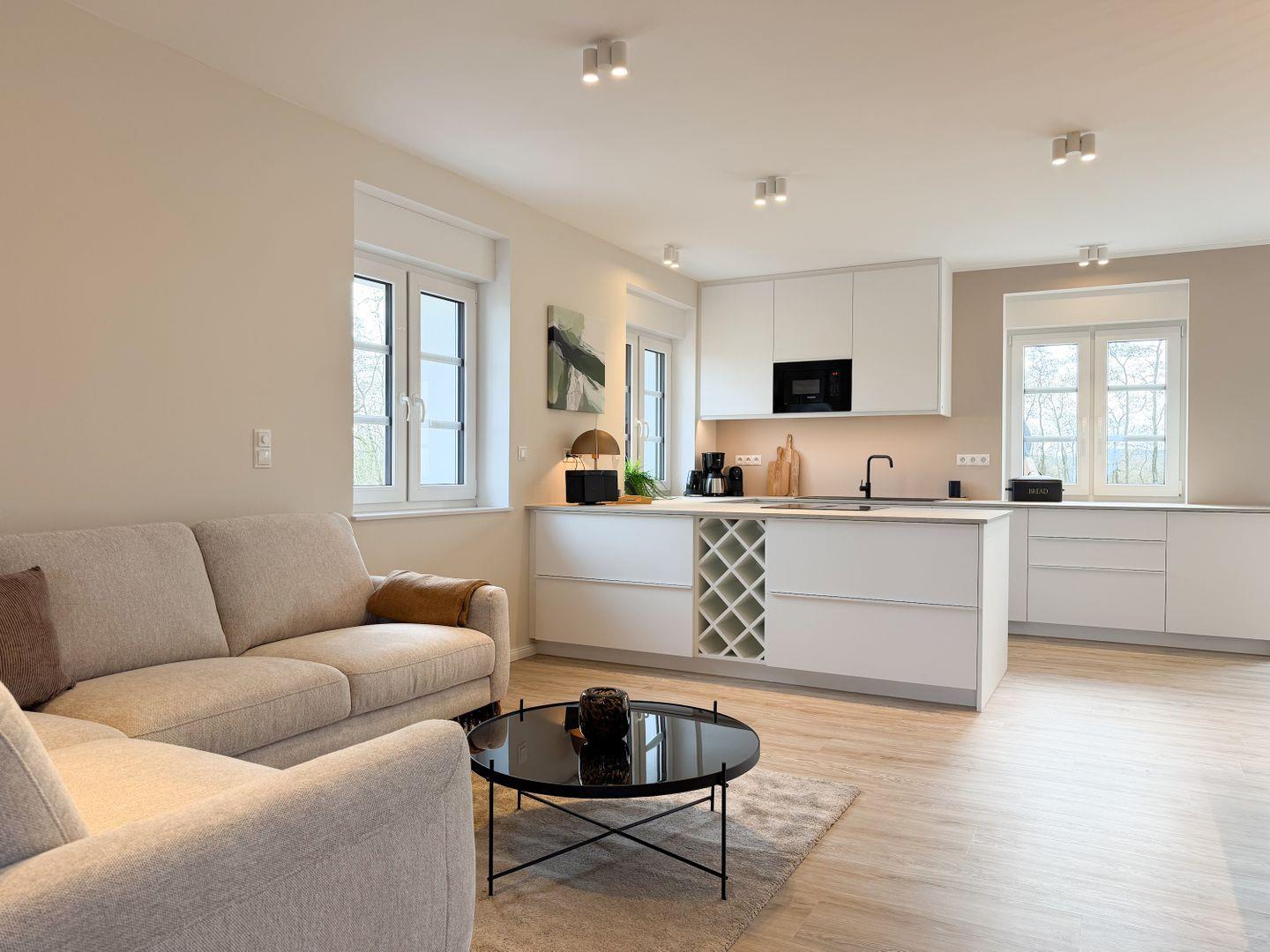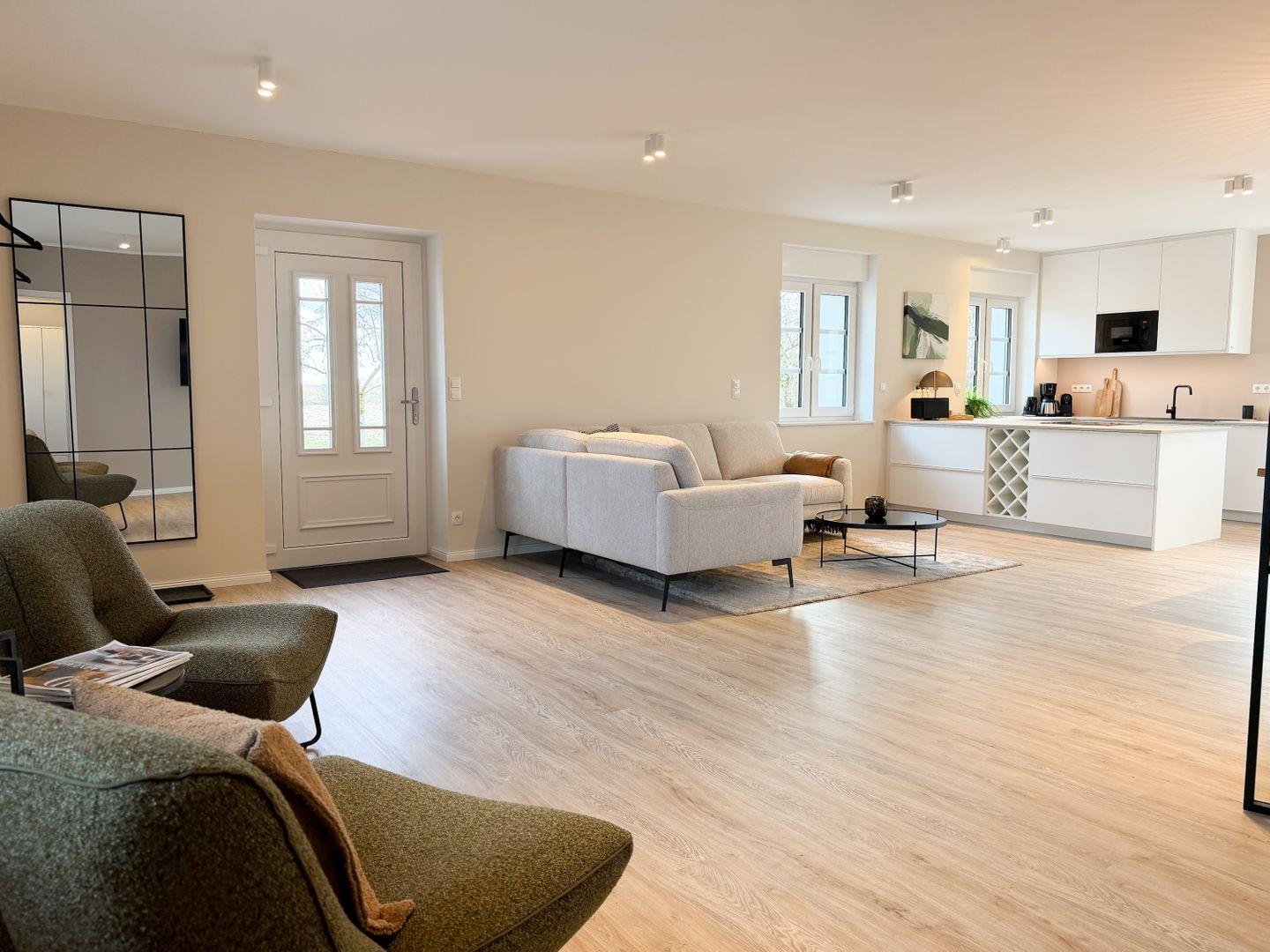 Das Besondere an der Mühle: Du nutzt hier zwei miteinander verbundene Wohneinheiten als ein gemeinsames Haus. Verbunden sind sie über ein Durchgangszimmer mit Einzelbett – so bleibt alles offen und gleichzeitig gut aufgeteilt. Dadurch entstehen zwei Wohnbereiche mit jeweils eigener Küche und Essplatz. Ideal, wenn ihr mit mehreren Generationen oder Freunden unterwegs seid: Man ist zusammen, findet aber auch jederzeit seinen eigenen Rückzugsort.