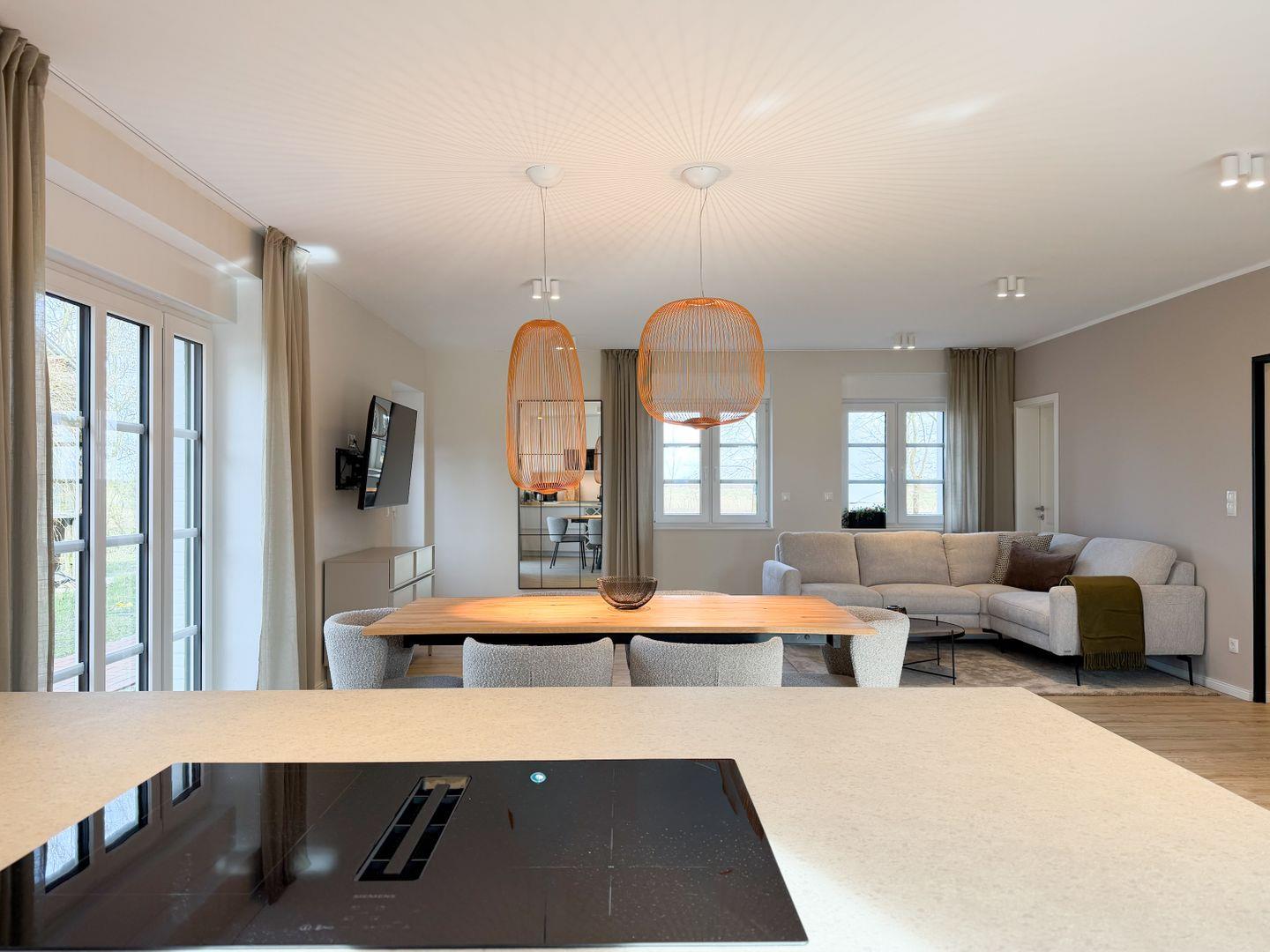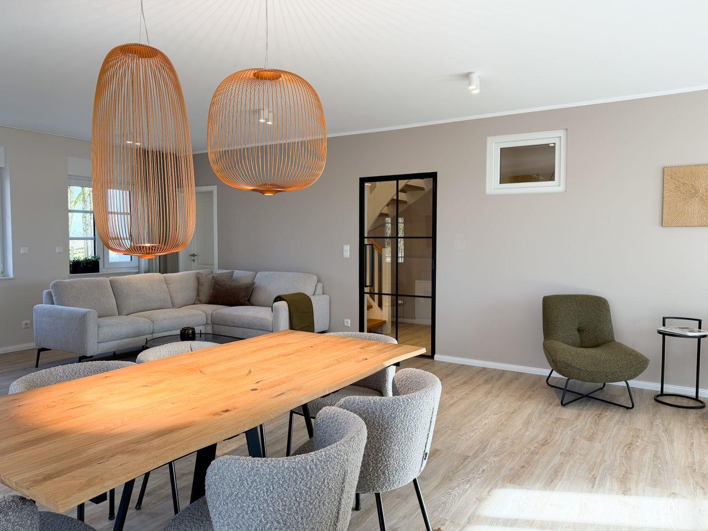 Draußen wartet viel Platz rund ums Haus. Terrasse, Garten und mehrere Sitzmöglichkeiten laden dazu ein, den Tag nach draußen zu verlegen – ob beim Frühstück, beim Grillen oder einfach in der Sonne. Für Kinder gibt es Spielmöglichkeiten, und rund um das Grundstück beginnt direkt die Natur.
