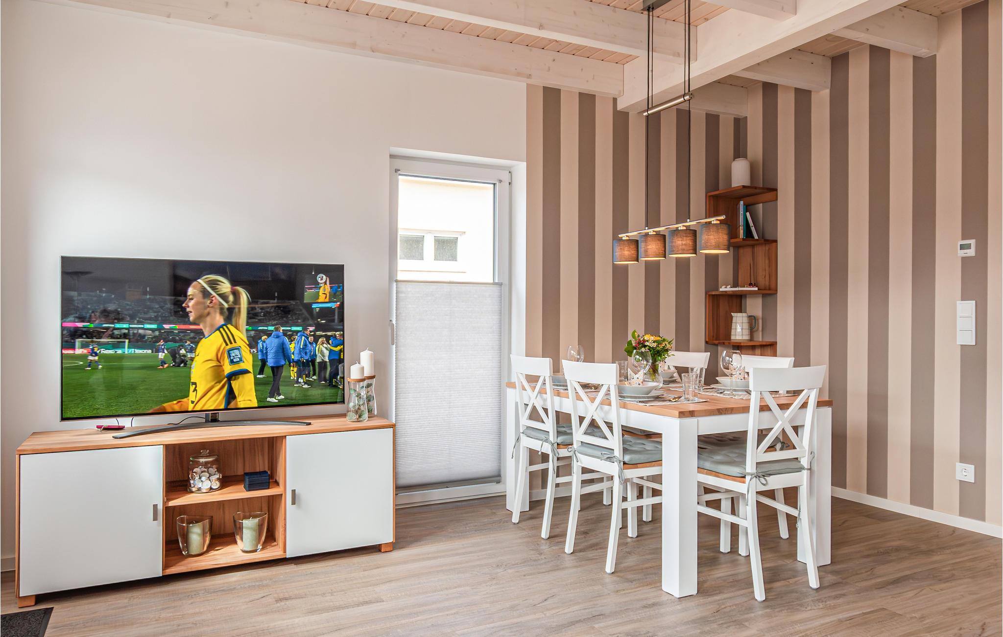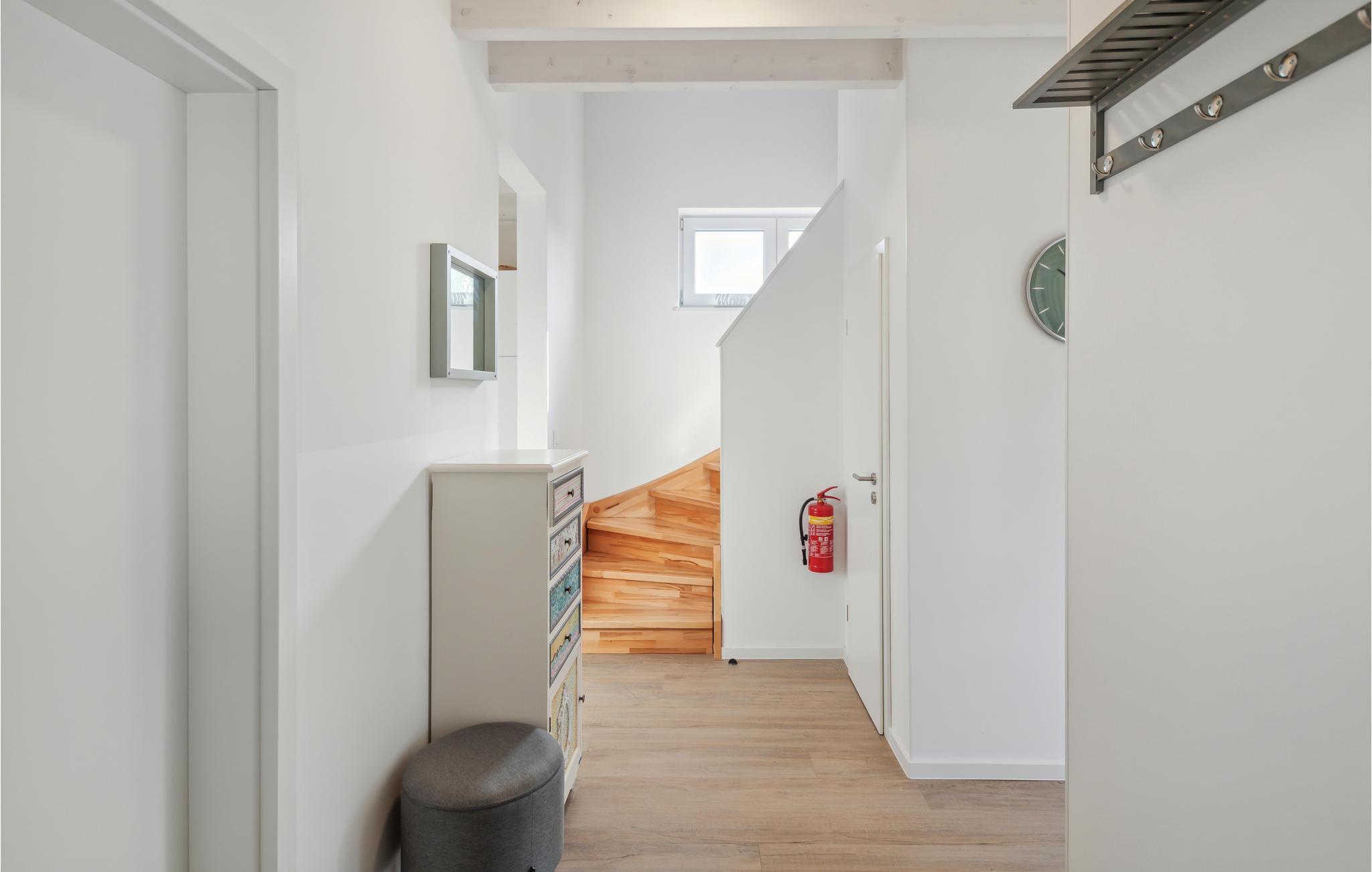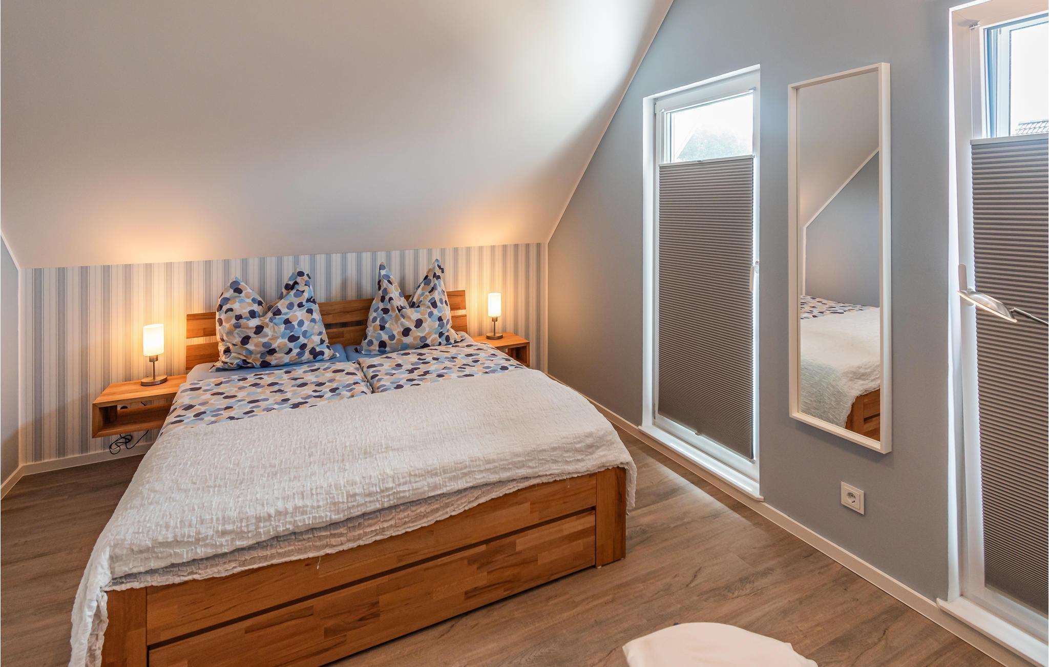 Sie betreten Ihr modernes Haus über das Eingangsportal und treten in den kleinen Flur, vom dem Sie in das Duschbad mit Sauna, in die Küche sowie in den modern und gemütlich eingerichteten Wohnraum mit Essbereich gelangen. Außerdem geht es von dort über die Treppe in den 1. Stock mit zwei Schlafzimmern und einem Wannenbad. Das ganze Haus ist modern und ansprechend eingerichtet, sodass Sie sich hier gleich wohlfühlen werden. Die hauseigene Sauna und der Kamin sorgen für zusätzliche Wohlfühlmomente, auch in der Nebensaison.