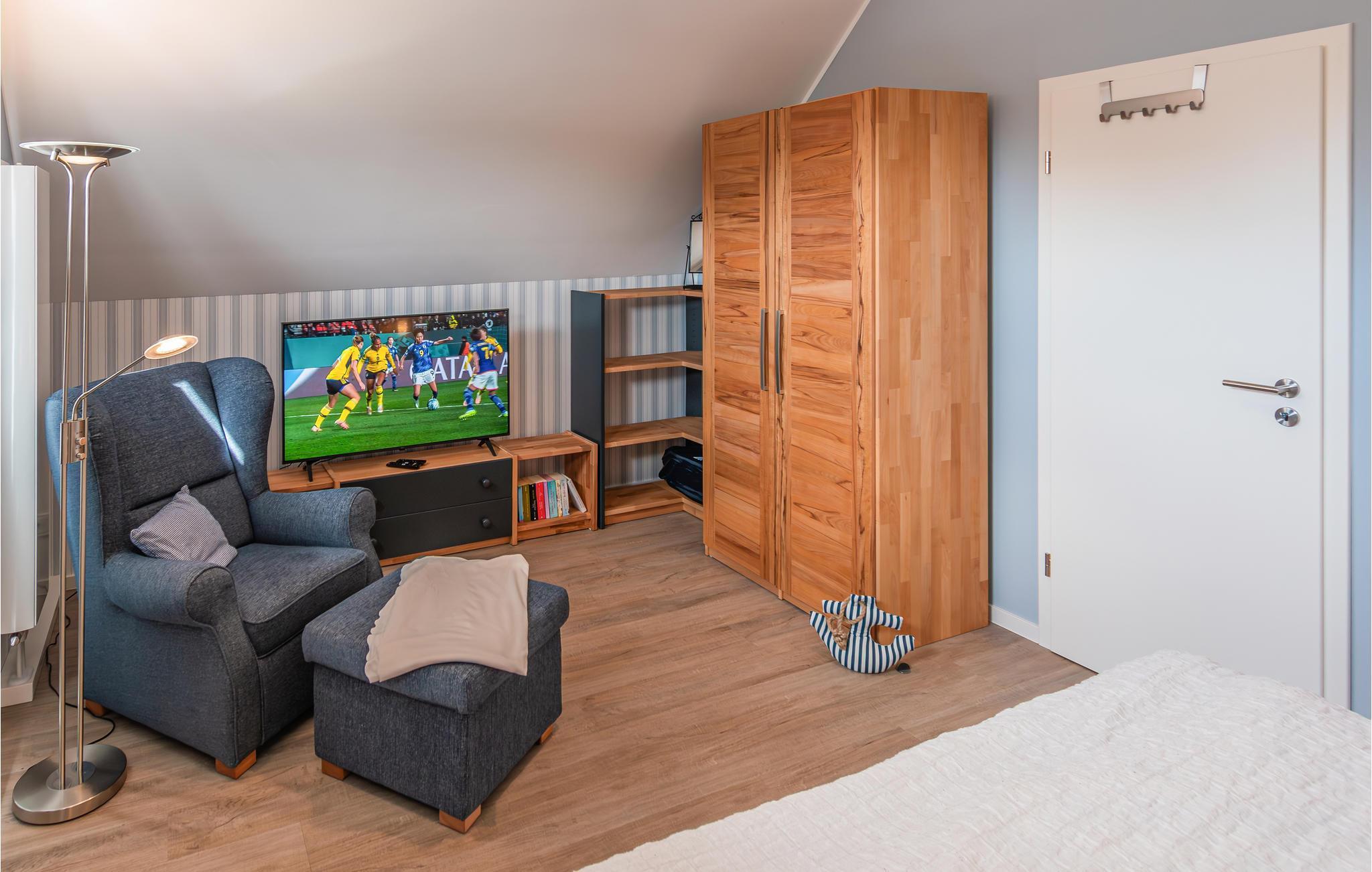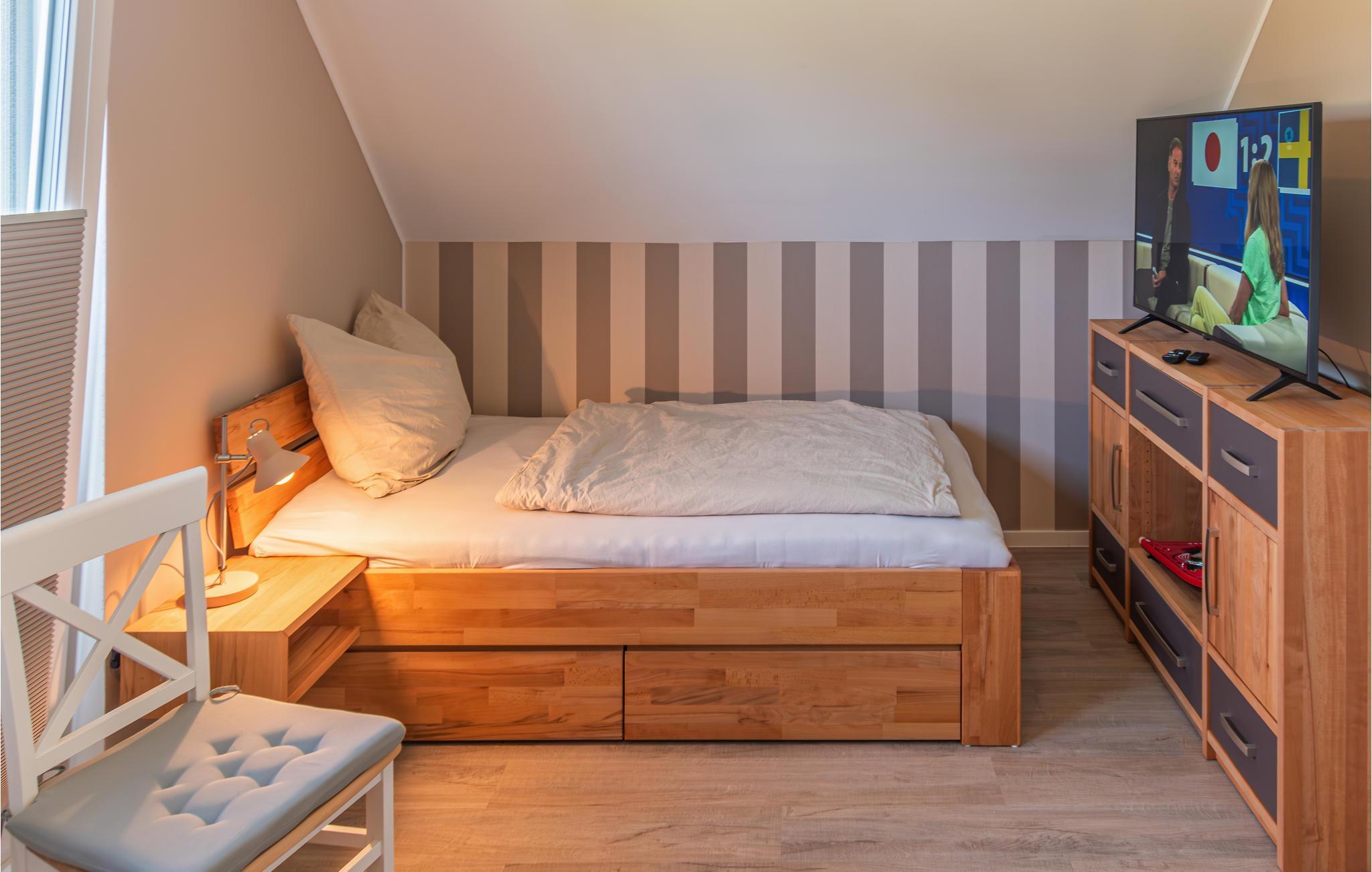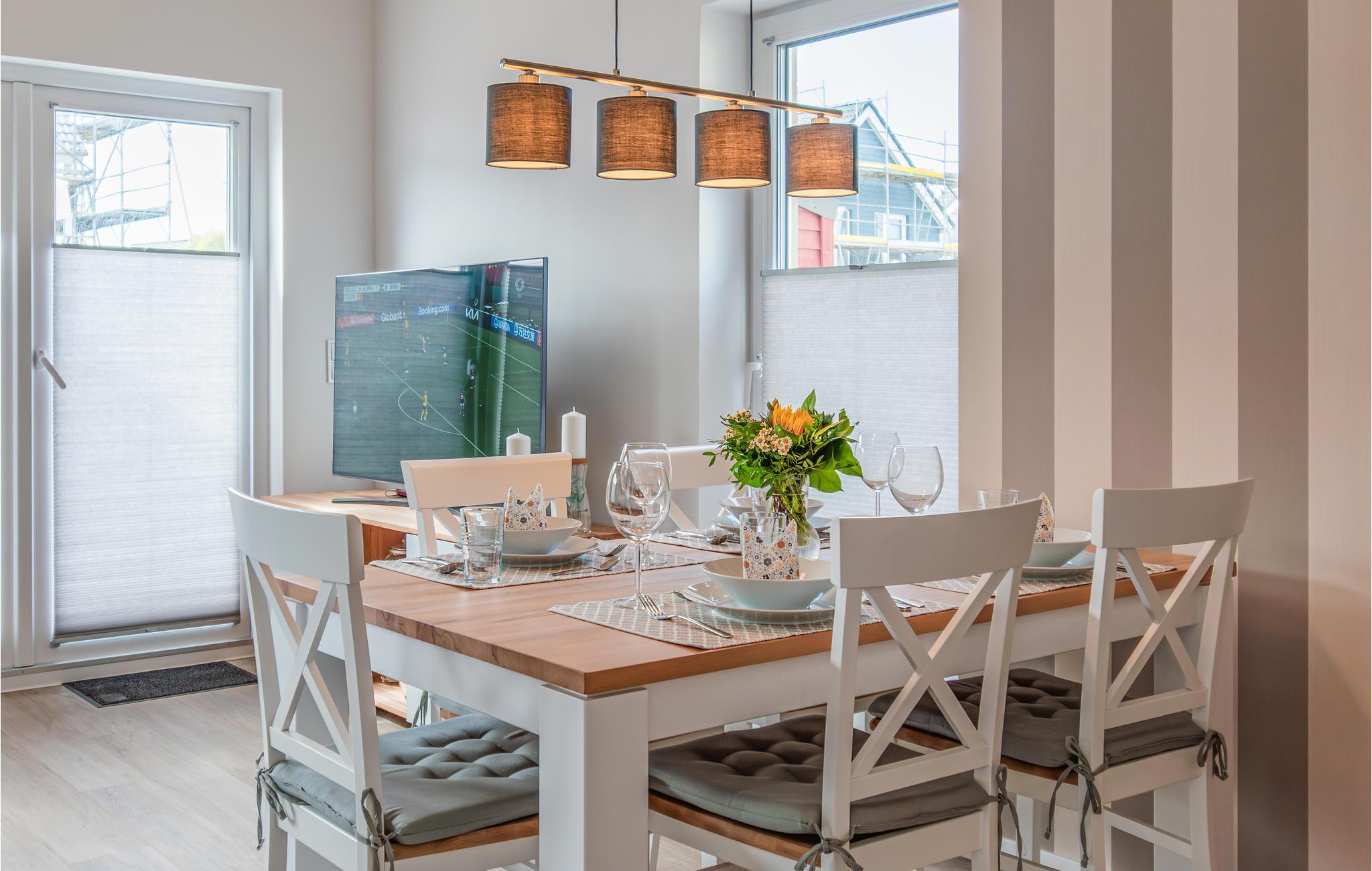 Sie betreten Ihr modernes Haus über das Eingangsportal und treten in den kleinen Flur, vom dem Sie in das Duschbad mit Sauna, in die Küche sowie in den modern und gemütlich eingerichteten Wohnraum mit Essbereich gelangen. Außerdem geht es von dort über die Treppe in den 1. Stock mit zwei Schlafzimmern und einem Wannenbad. Das ganze Haus ist modern und ansprechend eingerichtet, sodass Sie sich hier gleich wohlfühlen werden. Die hauseigene Sauna und der Kamin sorgen für zusätzliche Wohlfühlmomente, auch in der Nebensaison.