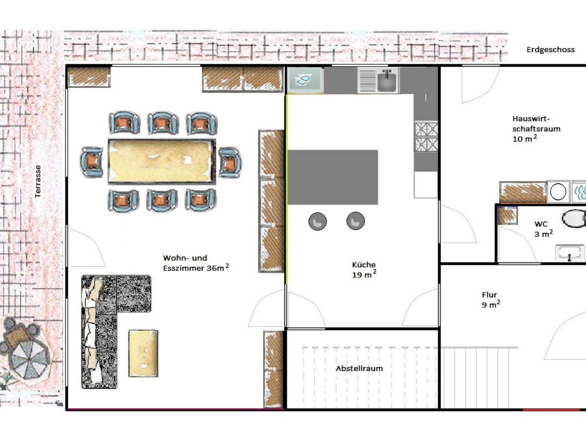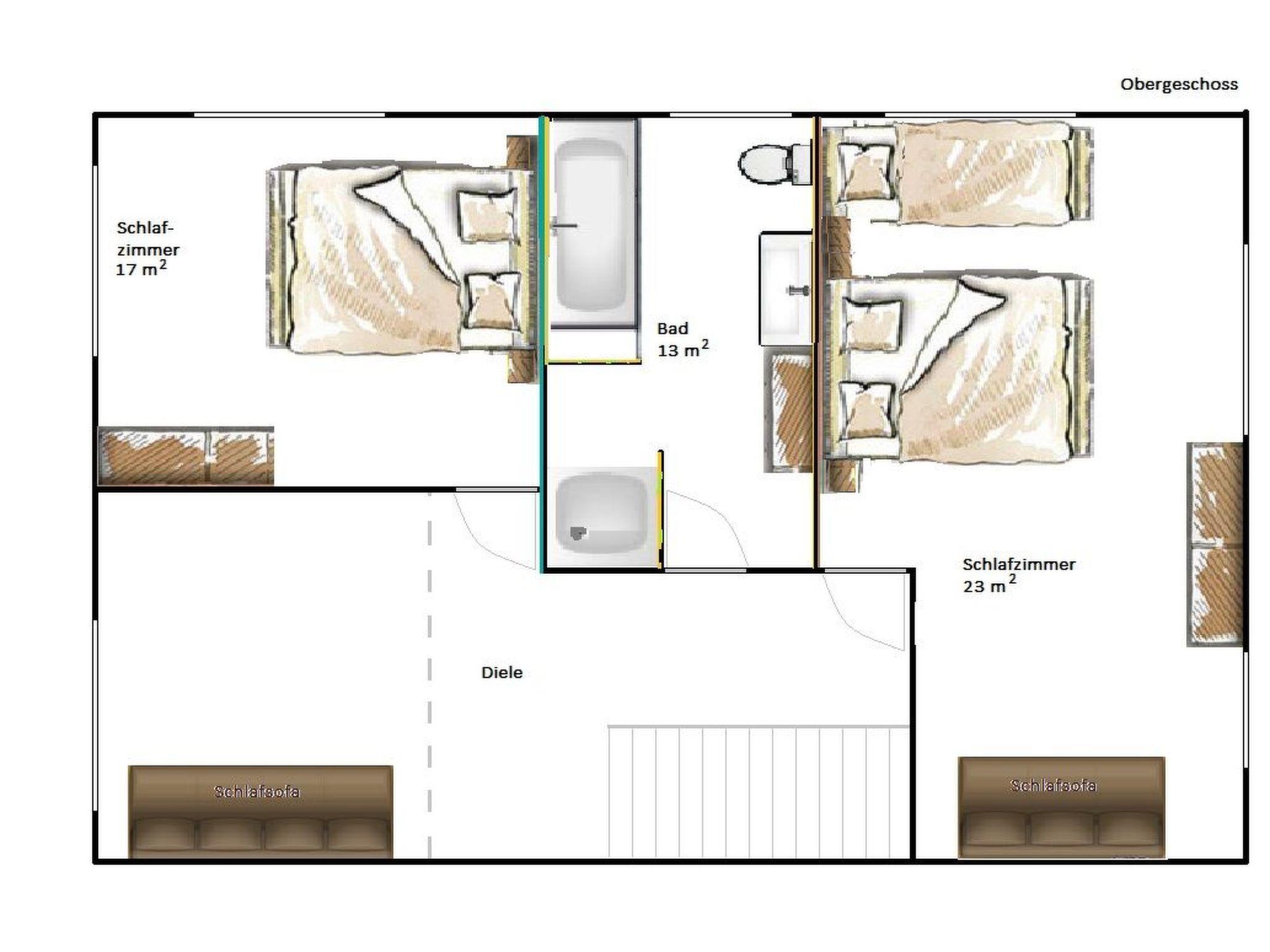 Das ca. 150 m² große Ferienhaus verfügt im Erdgeschoss über eine voll ausgestattete Küche mit einem Backofen, einem Induktionsherd, einer Spülmaschine, einem (Tief-)Kühlschrank, einem Toaster, einem Wasserkocher, einer Filter Kaffeemaschine, sowie einer Theke mit zwei Barhockern. Im angrenzendem Hauswirtschaftsraum finden Sie eine Waschmaschine, einen Gefrierschrank, eine Kommode mit Haushaltsreinigern, ein Bügeleisen und ein Bügelbrett, einen Staubsauger, sowie diverse andere Putzhilfsmittel vor. Das großzügige Wohn-/Esszimmer ist mit einer gemütlichen Couch, einem Satelliten TV mit DVD Player, einer Musikanlage mit CD Player und USB Anschluss, einem gut gefüllten Bücherregal, Gesellschaftsspiele für Groß und Klein, sowie einem großen Esstisch mit Platz für bis zu acht Personen ausgestattet. Das Gäste WC verfügt über eine Toilette und ein Waschbecken. Über Treppen erreichen Sie das Obergeschoss des Hauses. Hier befindet sich ein Schlafzimmer mit einem Doppelbett (1,80 m Breite) und ein weiteres Schlafzimmer auch mit einem Doppelbett (1,80 m Breite), einem Einzelbett (0,90 m Breite) und einem Schlafsofa (1,40 m Breite) für zwei Personen. Ein weiteres Schlafsofa (1,60 m Breite) für zwei Personen befindet sich in einem zusätzlichen Schlafraum. Wenn die Betten nicht benötigt werden, ist es ein gemütlicher Leseraum mit Sofa und Bücherregal, sowie kleinem Arbeitsplatz mit Anschluss für Laptop oder ähnliches. Gerne stellt Ihnen der Vermieter auf Wunsch noch ein Kinderbett bereit. Zu den Ausstattungsmerkmalen des großen Badezimmer zählen eine ebenerdige Dusche, eine Badewanne, eine Toilette, ein Waschbecken und ein Föhn. Eine (Fußboden-)Heizung, sowie WLAN befinden sich in allen Räumen des Hauses.