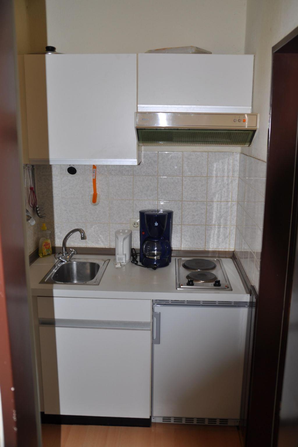 Der Wohn-/Schlafbereich hat ein Doppelbett (140 x 200 cm). Hier gibt es einen Tisch zum Frühstücken und einen Wohnbereich zum sitzen mit zwei Sesseln und einem weiteren Tisch. Im Eingangsbereich befindet sich eine kleine Kochnische mit einem 2 Plattenherd, ein Kühlschrank mit Gefrierfach und eine Mikrowelle. Die Wohnung hat natürlich auch ein Badezimmer mit Toilette, Dusche und Waschbecken. Fernseher, DVD-Player mit Radio sind auch vorhanden.
