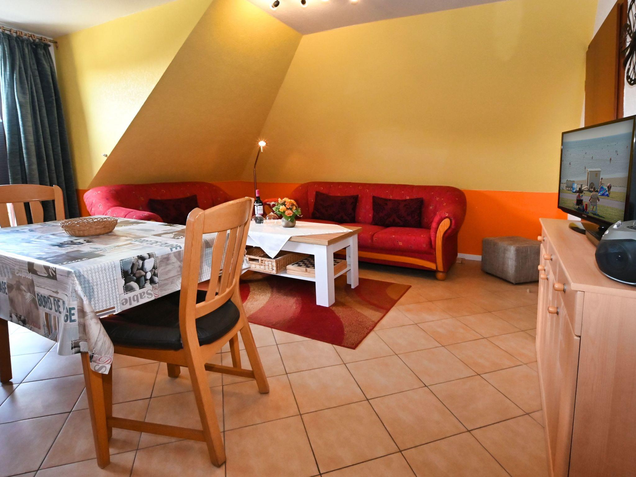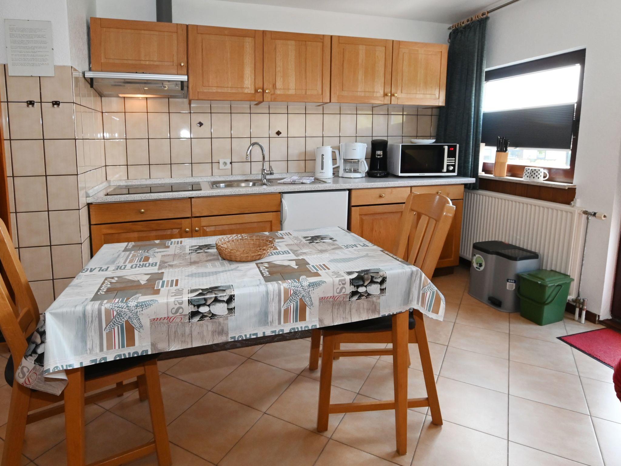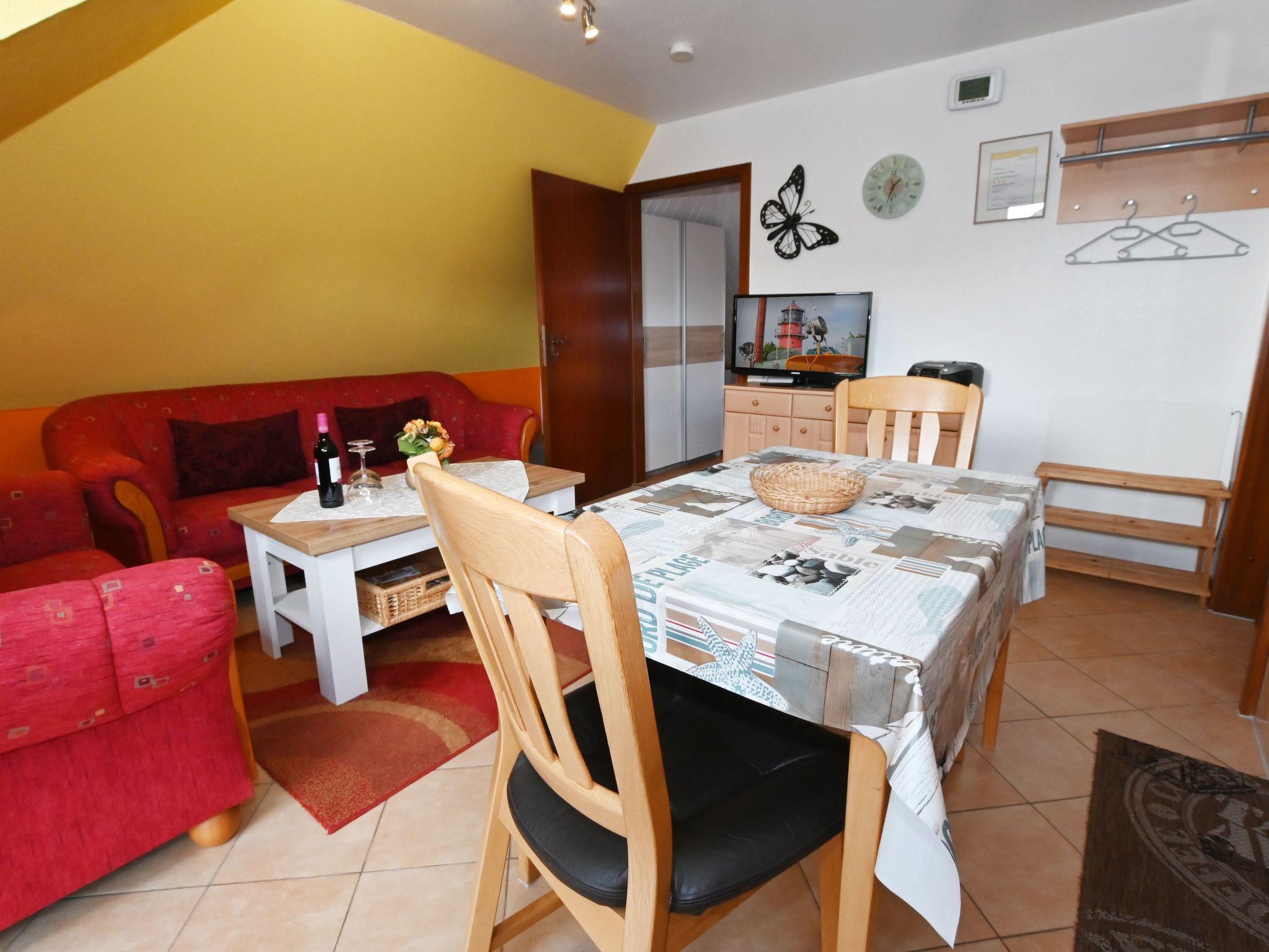 Die mit drei Sternen ausgezeichnete Ferienwohnung im ersten Stockwerk verfügt über eine Wohnfläche von ca. 35 m². Die Unterkunft ist aufgeteilt auf einen kombinierten Wohn- und Essbereich mit voll ausgestatteter Küchenzeile, ein Schlafzimmer und ein Badezimmer. Der Wohnbereich bietet ein Ecksofa mit Sessel, Hocker und Couchtisch, eine Stehlampe, eine Anrichte mit 32-Zoll-Flachbildfernseher sowie eine Garderobe. Ein Esstisch mit zwei Stühlen trennt den Kochbereich vom Wohnbereich. Im angrenzenden Schlafzimmer befinden sich ein Doppelbett (1,80 x 2,00 m), ein Radiowecker und zum Ankleiden ein Einbaukleiderschrank, ein Herrendiener und ein Spiegel. Wir haben für Sie Kostenfreies W-Lan für Ausfälle und Störungen übernehmen wir keine Haftung.