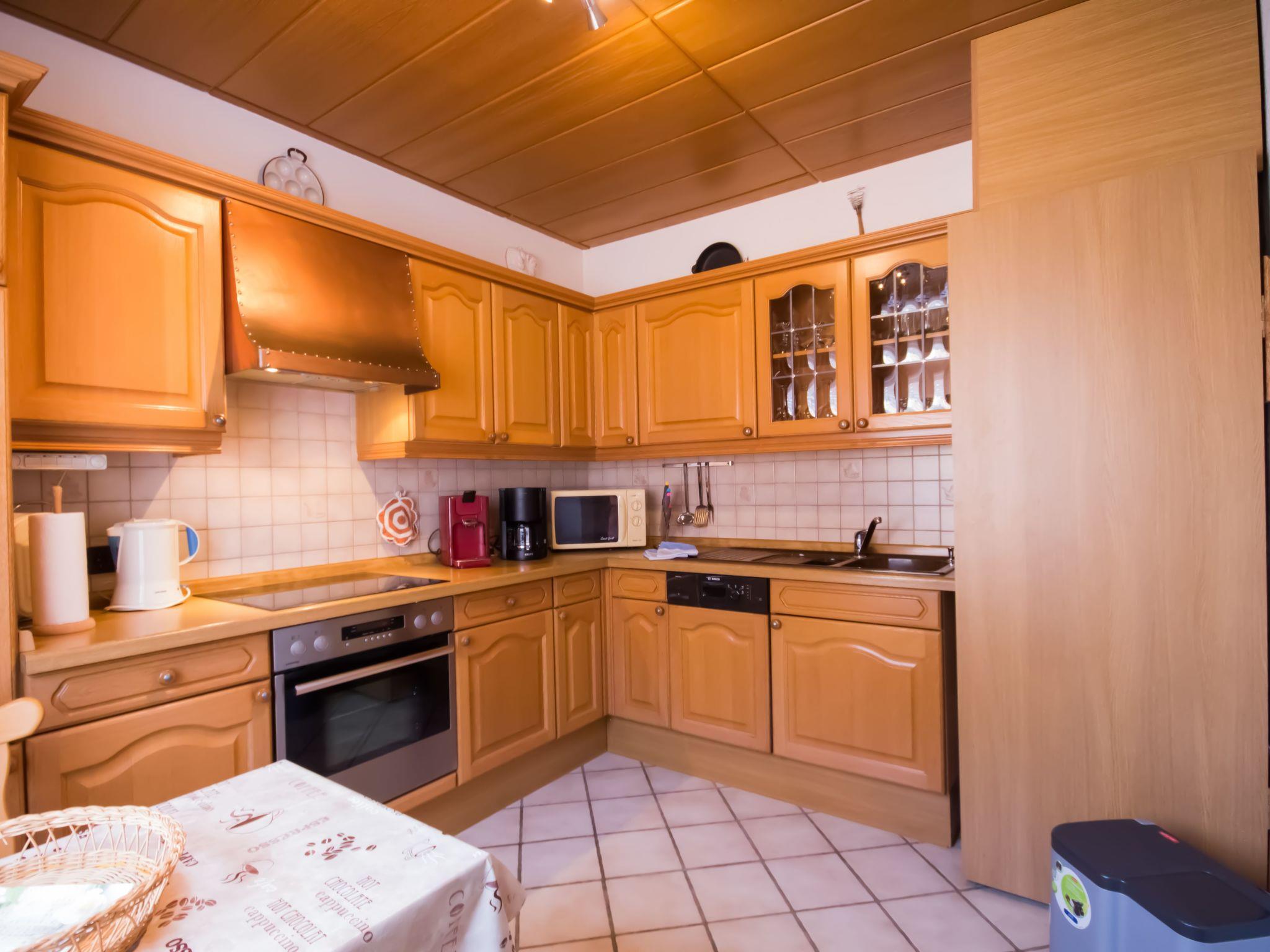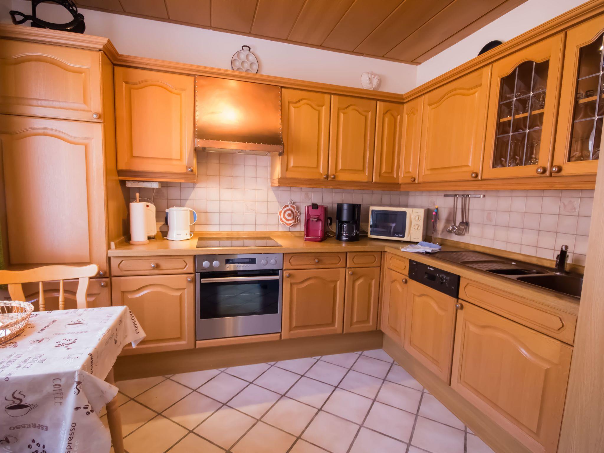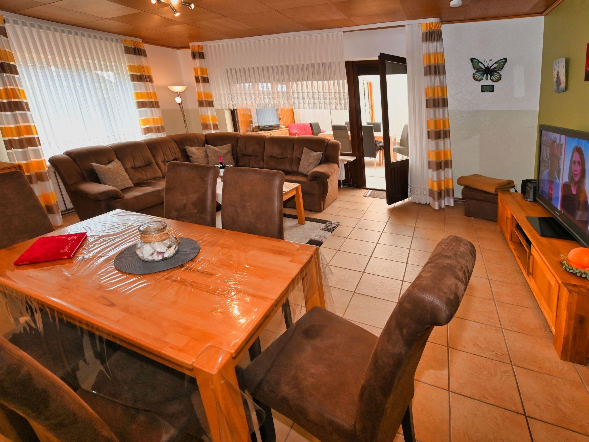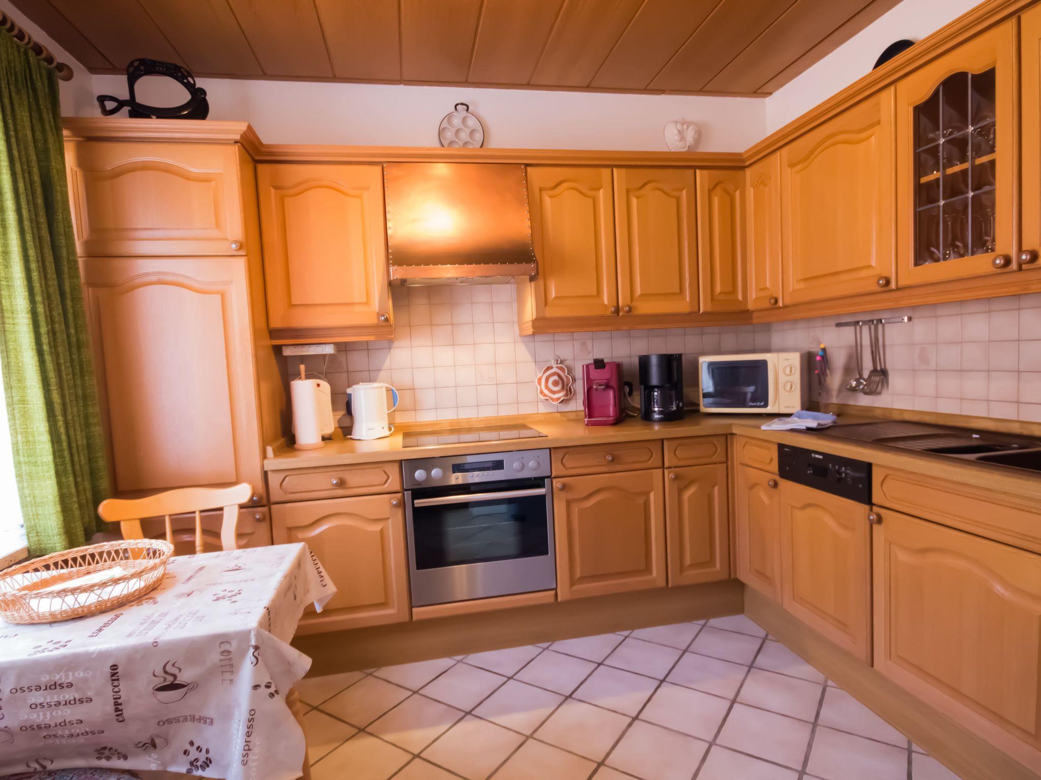 Die 4-Zimmer-Wohnung verfügt über eine Wohnfläche von ca. 125 m². Die freundlich und gemütlich eingerichtete Ferienunterkunft erstreckt sich über das gesamte Erdgeschoss. Der moderne Wohn- und Essbereich bietet eine Eckcouch mit Hocker und Couchtisch, eine Stehlampe sowie ein Sideboard mit 50-Zoll-Flachbildfernseher. Zudem steht ein Esstisch mit sechs Stühlen bereit. Die voll ausgestattete Küche verfügt neben der oben genannten Ausstattung zusätzlich über einen Backofen und eine Spülmaschine. Auch ein weiterer Essbereich für zwei Personen ist vorhanden. Ein Kinderhochstuhl wird bei Bedarf kostenfrei zur Verfügung gestellt. Das erste Schlafzimmer ist mit zwei Einzelbetten (je 0,90 x 2,00 m) ausgestattet. Ein CD-Radiorekorder, ein 23-Zoll-Fernseher und ein Hocker runden die Ausstattung dieses Schlafbereichs ab. Im zweiten Schlafzimmer erwarten Sie ein Doppelbett (1,80 x 2,00 m) sowie ein optionales Kinderbett (0,70 x 1,40 m) zur kostenfreien Nutzung, dazu ein Radiowecker und ein Hocker. Das dritte Schlafzimmer verfügt ebenfalls über ein Doppelbett (1,80 x 2,00 m) mit beigestelltem Hocker. Im Vergleich zu den anderen Wohnungen bietet dieses Badezimmer zusätzlich eine Fußbodenheizung, einen Handtuchheizkörper sowie Urinal, Bidet und Duschhocker. Das separate Gäste-WC ist mit Waschbecken, Toilette und Spiegel ausgestattet. Im Abstellraum befindet sich eine Waschmaschine zur kostenfreien alleinigen Nutzung, daneben Wäscheständer, Bügelbrett, Bügeleisen und Staubsauger. Eine Garderobe, einen Garderobenschrank und einen Spiegel finden Sie im Flurbereich. Wir haben für Sie Kostenfreies W-Lan für Ausfälle und Störungen übernehmen wir keine Haftung.